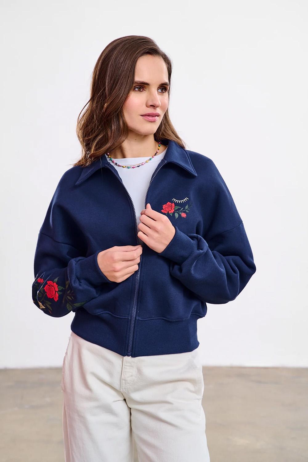 Bluza rozpinana Melting Chaos to propozycja dla kobiet, które lubią łączyć romantyzm z odrobiną pazura. Głęboki, granatowy kolor stanowi idealne tło dla misternych zdobień, które przyciągają wzrok i nadają całości wyjątkowego charakteru.