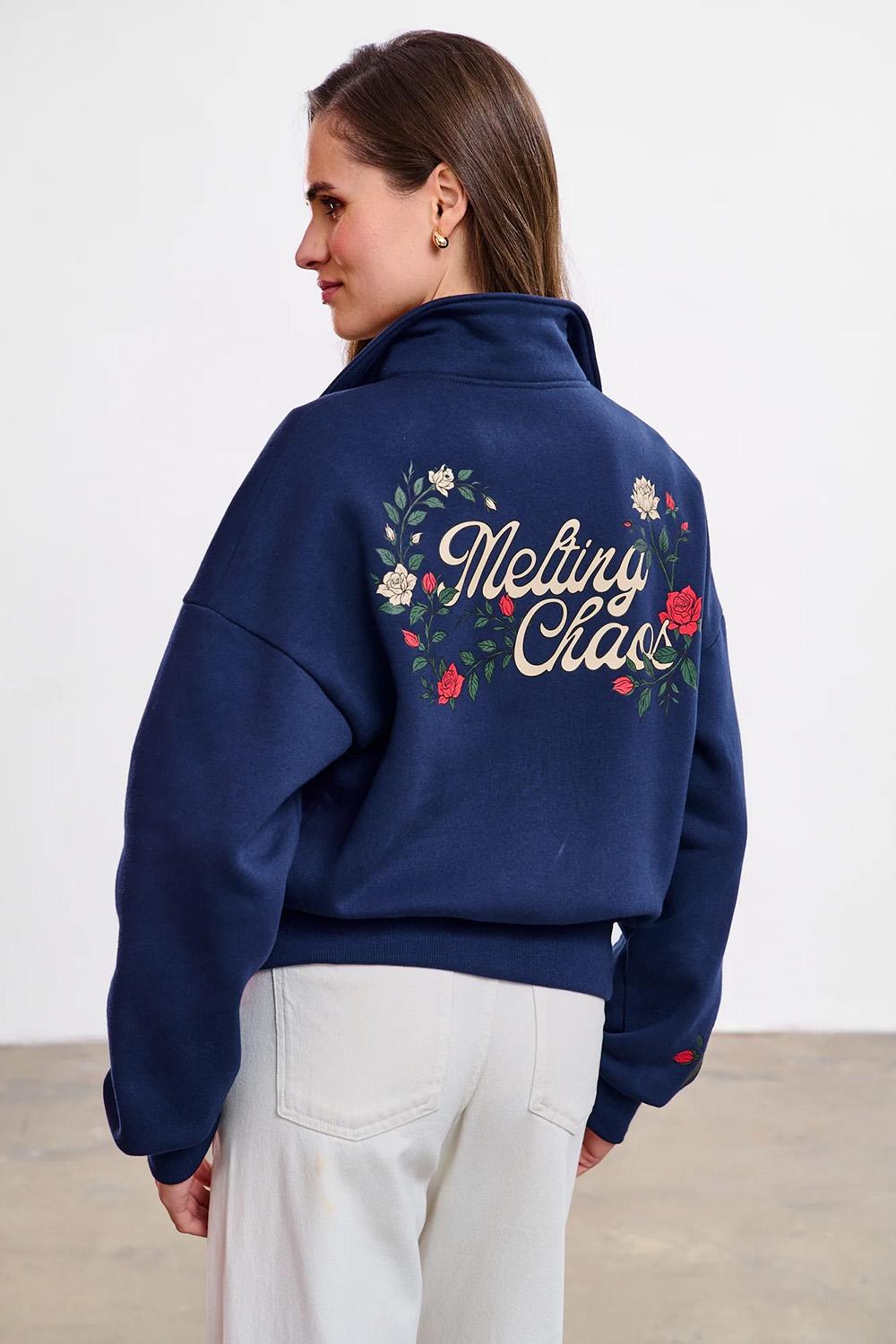 Klasyczny krój z kołnierzykiem i zapięciem na zamek zyskał nowe życie dzięki kwiatowym motywom. Na rękawach pną się nadrukowane róże, a plecy zdobi duża, efektowna grafika z napisem "Melting Chaos" w otoczeniu kwiatów. Wykonana z bawełnianej tkaniny, zapewnia komfort noszenia.