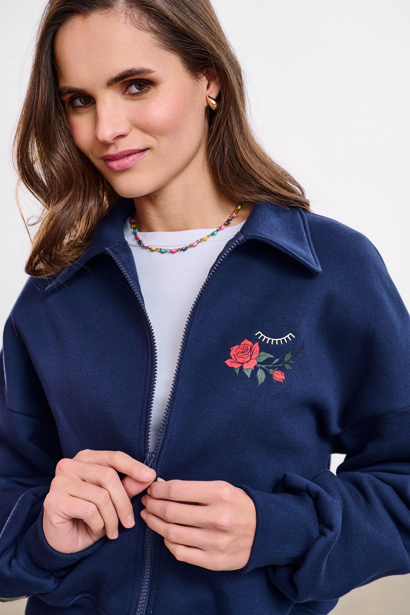 Bluza rozpinana Melting Chaos to propozycja dla kobiet, które lubią łączyć romantyzm z odrobiną pazura. Głęboki, granatowy kolor stanowi idealne tło dla misternych zdobień, które przyciągają wzrok i nadają całości wyjątkowego charakteru.