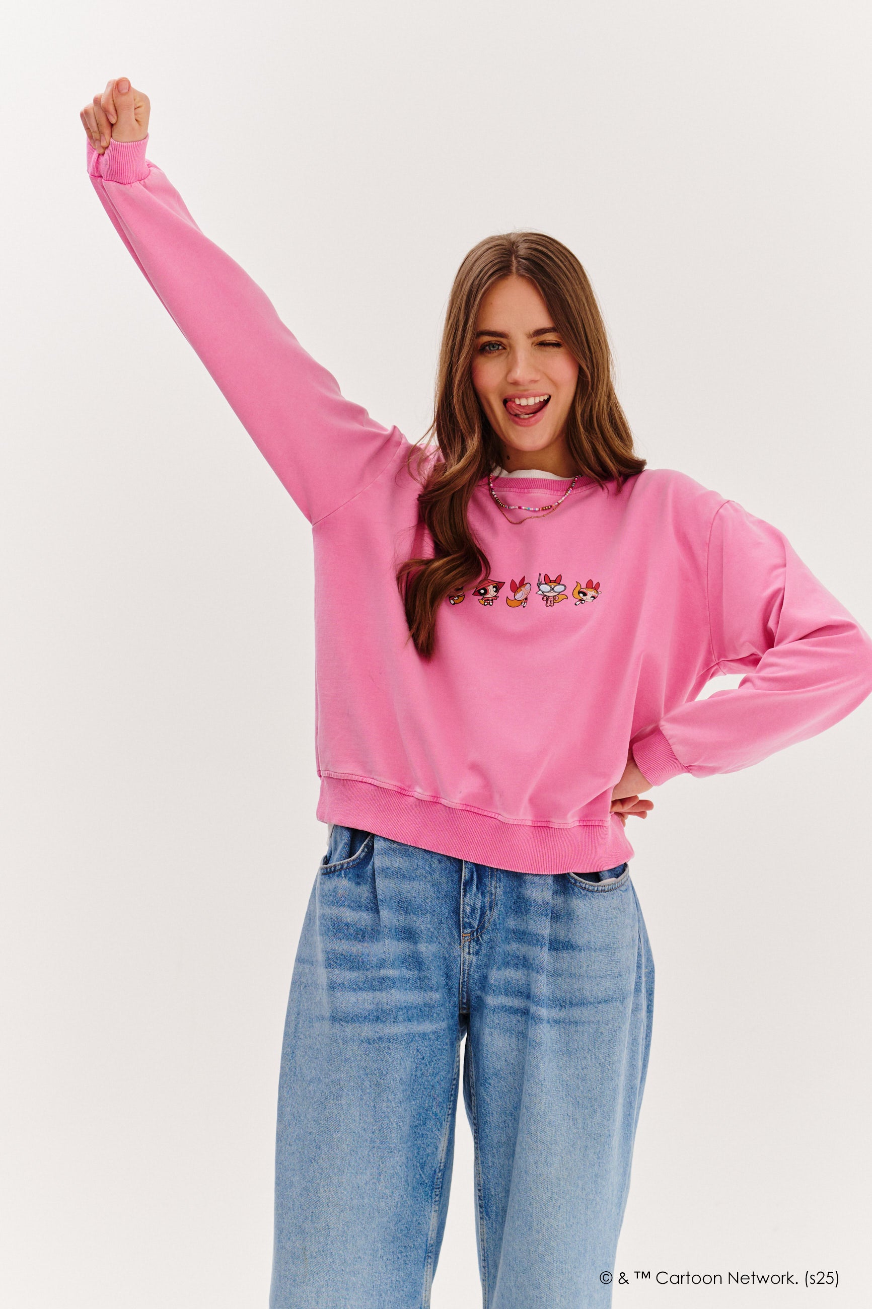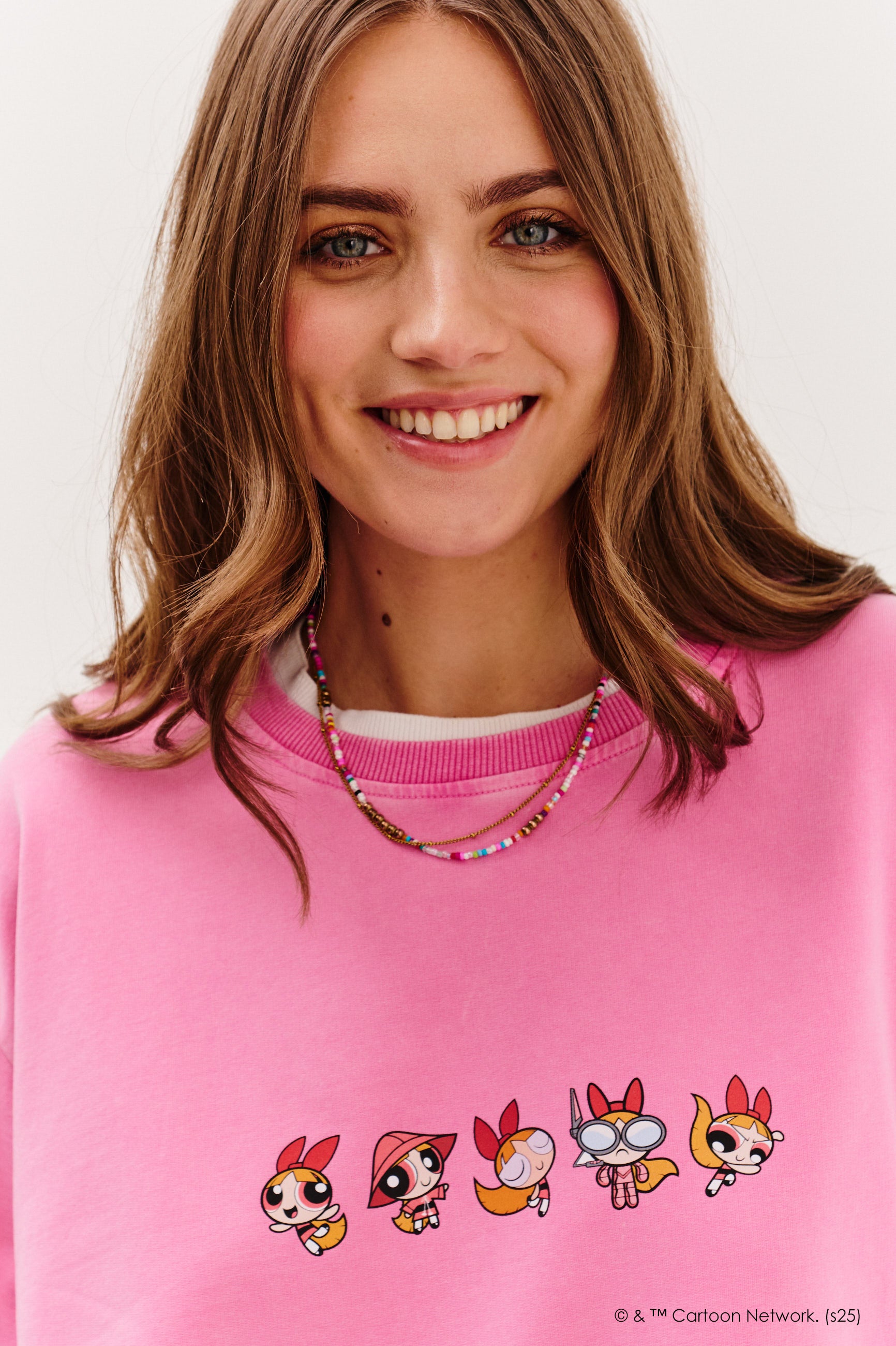Bluza Blossom in Bloom – dziewczyńska siła w pastelowym wydaniu! Różowa bluza z haftowanymi motywami Blossom to must-have każdej fanki Powerpuff Girls! Pięć wyrazistych póz jednej z najbardziej zadziornych bohaterek pokazuje, że girl power to nie tylko słodki uśmiech – to też odwaga, pewność siebie i energia, którą widać z daleka.