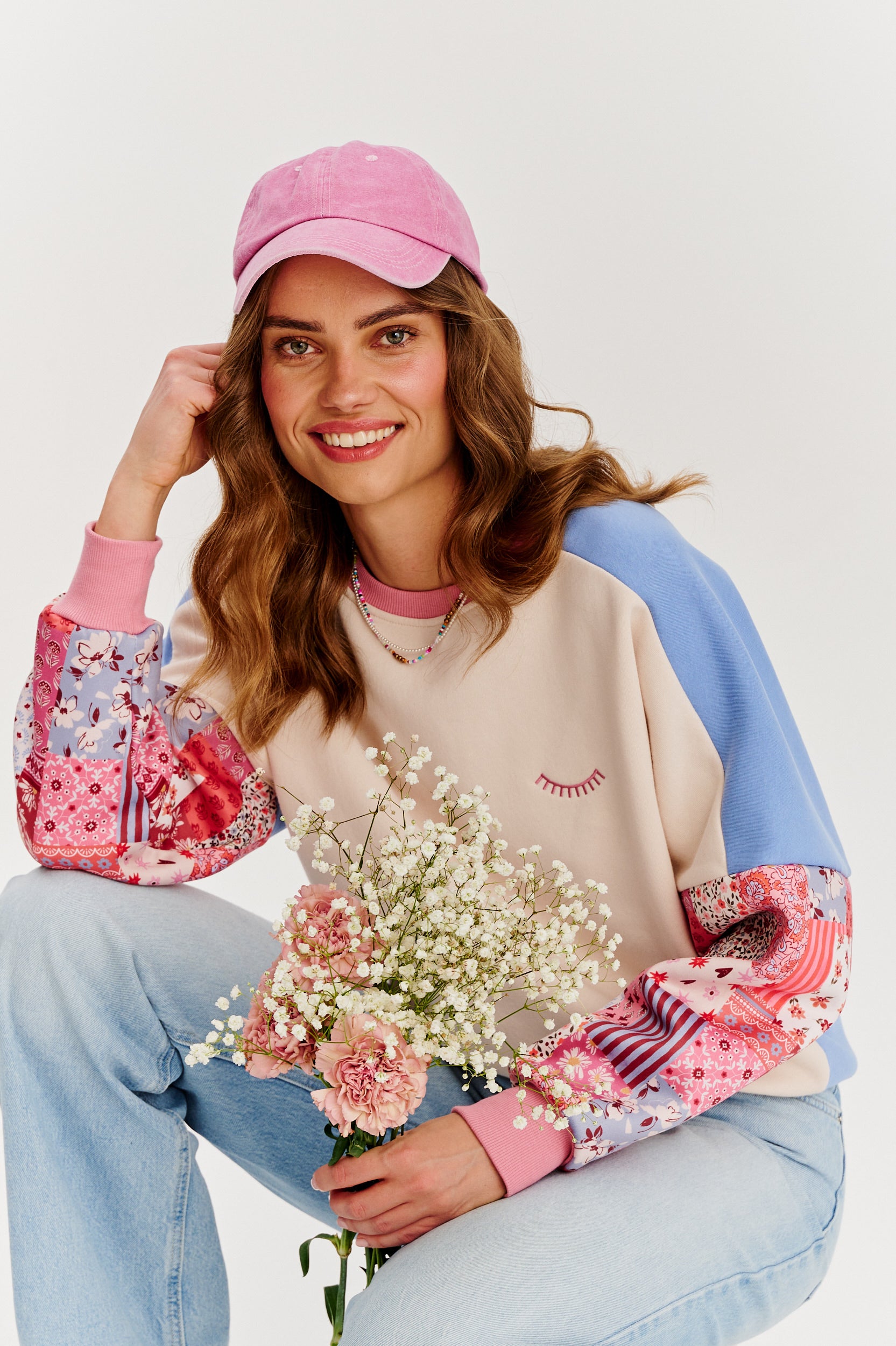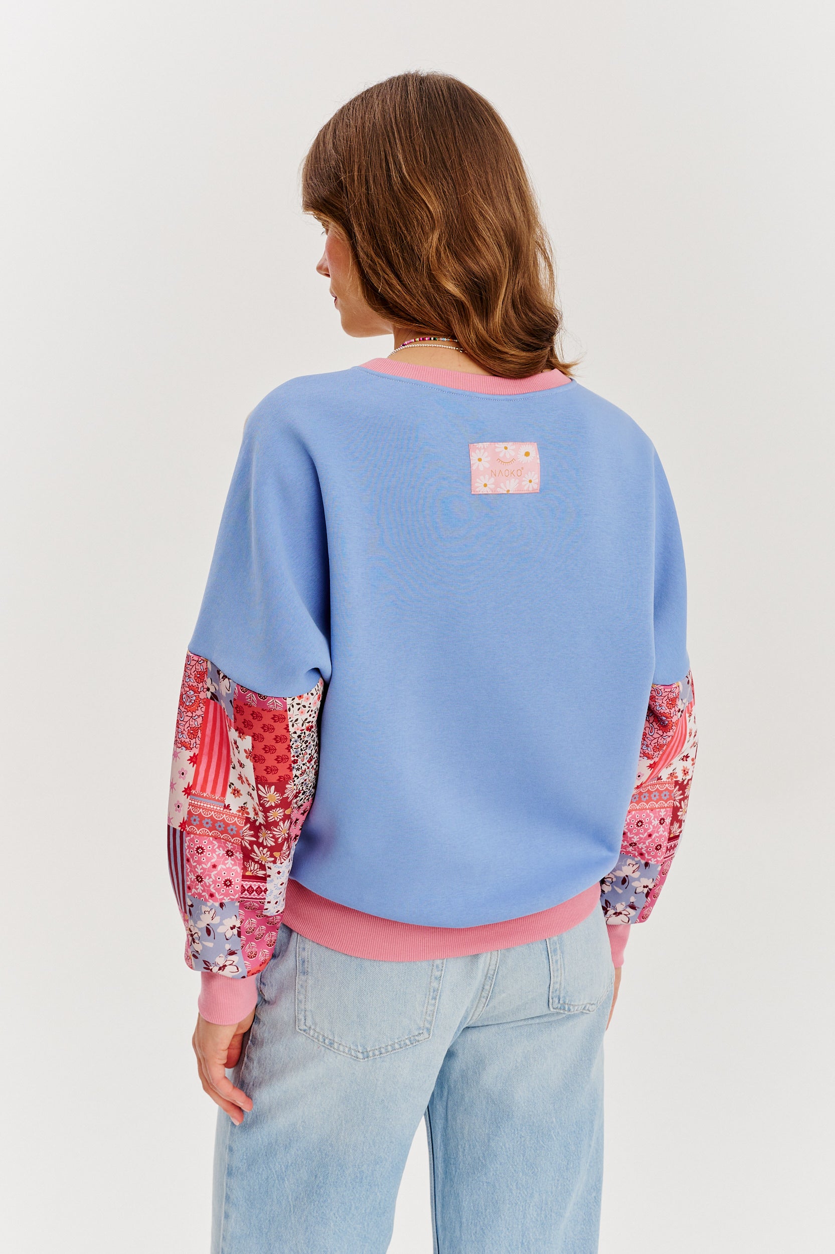 Wygodna jak niedzielny poranek, kolorowa jak wiosenny spacer. Bluza Boho Therapy to propozycja, która otula nie tylko materiałem, ale i nastrojem. Patchworkowe rękawy w odcieniach różu, czerwieni i błękitu dodają artystycznego akcentu, a kontrastowy tył w błękitnym kolorze przełamuje klasykę i dodaje świeżości.