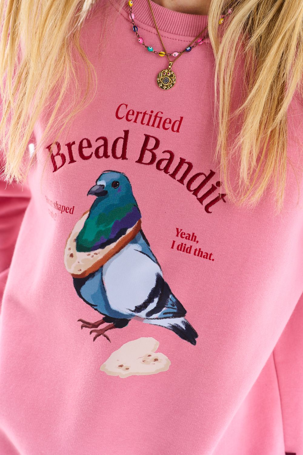 Bluza Bread Bandit to hołd dla najsłynniejszych mieszkańców miast. Różowa baza i autorska grafika z gołębiem i napisem "Bread Bandit" to przepis na stylizację, która wywołuje uśmiech.
