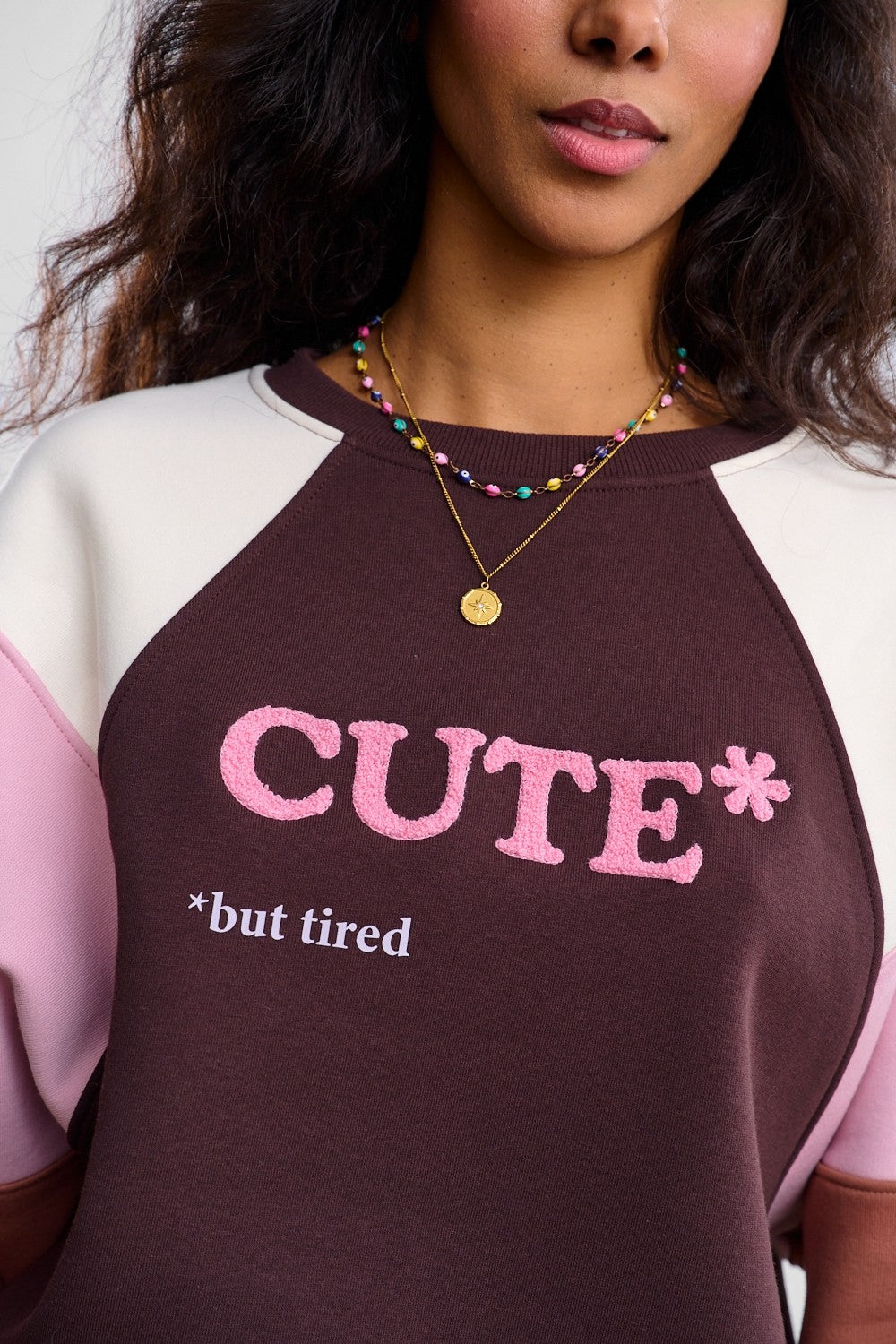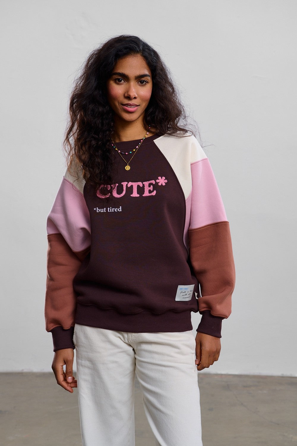 Bluza Cute But Tired to humorystyczny akcent w Twojej garderobie, który idealnie oddaje realia współczesnego życia. Oversize'owy krój w stylu reglan łączy trzy kolory: czekoladowy brąz, pudrowy róż i śmietankową biel, tworząc modny efekt color-blocking.