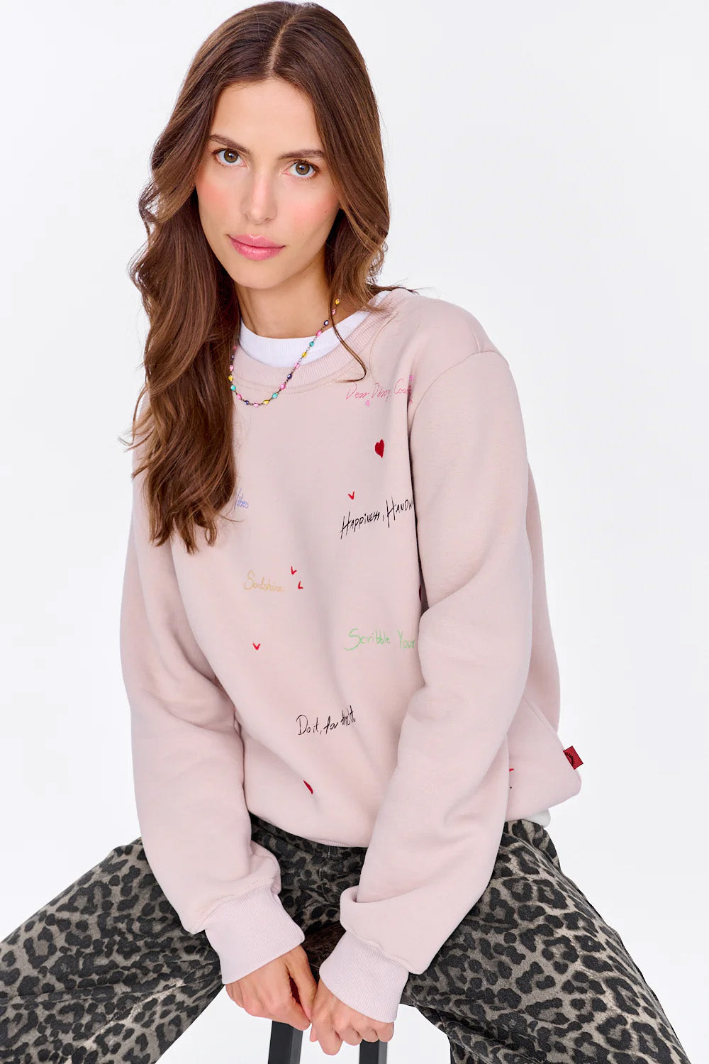 Niech każdy dzień będzie nową stroną pełną inspiracji! Bluza Dear Diary to kremowy, oversize'owy fason, który wyróżnia się unikatowymi, kolorowymi haftami z pozytywnymi hasłami. Na froncie bluzy znajdziesz wyjątkowe napisy jak „Scribble your heart out”, „Unbottling good vibes” czy „Dear Diary, count on me”, które przypomną Ci o sile dobrych emocji i małych, codziennych radości. Detale w postaci serduszek, ręcznie projektowanych czcionek i subtelnych akcentów czynią ten model wyjątkowym dodatkiem do każdej stylizacji.