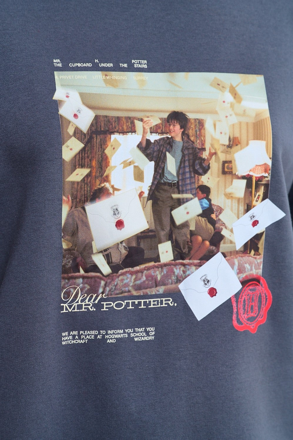 Na piersi znajduje się nadruk przedstawiający kultową scenę z lawiną listów wpadających przez komin. To moment, w którym wszystko się zaczęło. Bluza jest wygodna i stylowa, idealna dla każdego, kto wciąż czeka na swój list z Hogwartu.