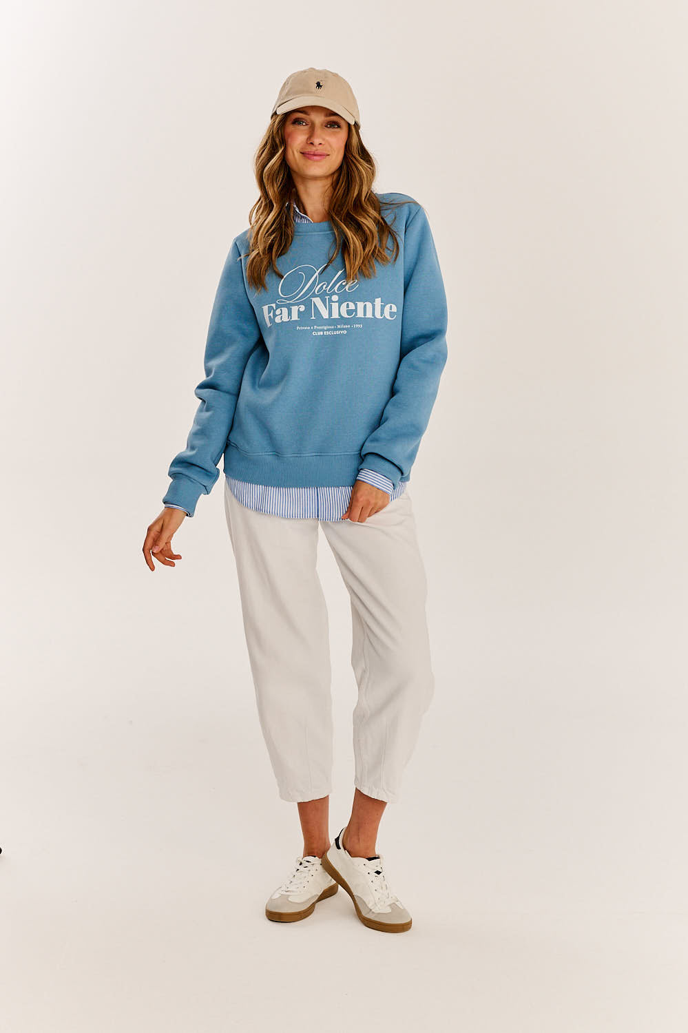 Na przodzie widnieje subtelny napis "Dolce Farniente", który podkreśla filozofię beztroskiego wypoczynku i przyjemności życia. To idealna propozycja dla tych, którzy cenią sobie zarówno wygodę, jak i subtelny, ale wyrafinowany styl.