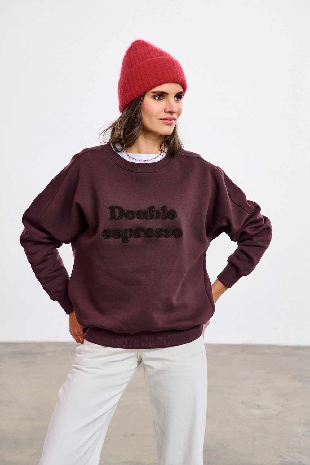 Bluza Double Espresso to hołd dla miłośniczek kawy i minimalizmu. Wykonana w całości w głębokim, brązowym kolorze, z subtelnym napisem "Double espresso" w tonacji zbliżonej do tła. Prosty krój typu crewneck sprawia, że jest to niezwykle uniwersalny element garderoby.