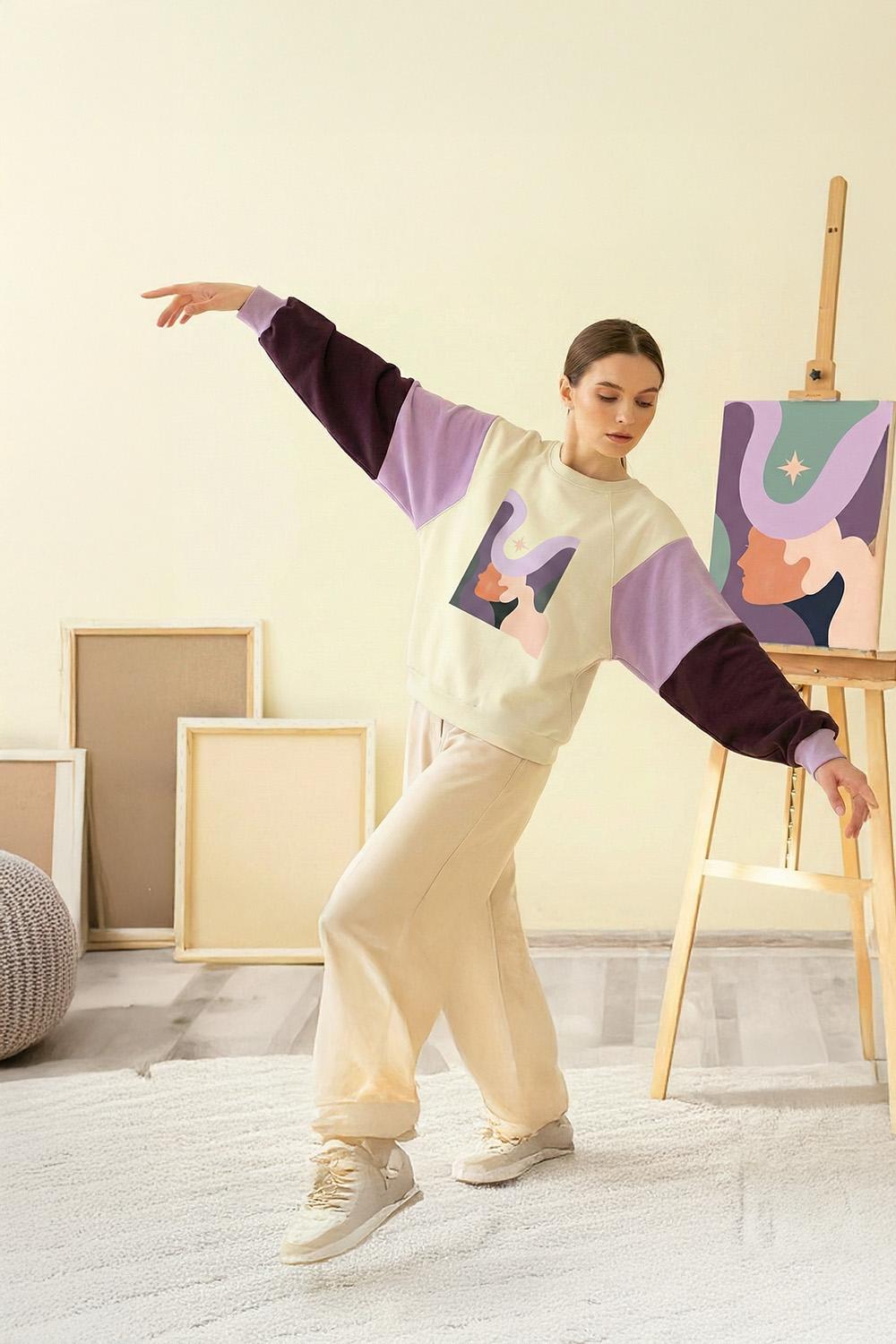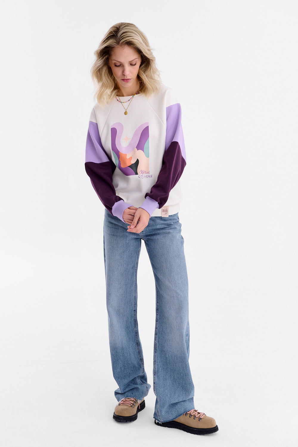 Bluza Face The World to manifest kobiecej siły i spokoju, przeniesiony na tkaninę przez Maggie Stephenson. W ramach projektu Naoko x Artist Remix, amerykańska ilustratorka stworzyła dzieło, które jest wizualną opowieścią o odwadze bycia sobą. Bawełniana bluza o kroju oversize łączy kremowy korpus z rękawami w odcieniach liliowego i głębokiego fioletu.