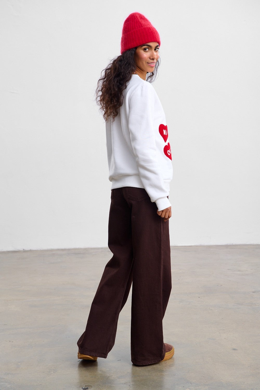 Bluza Fluffy Me to esencja uroku. Na klasycznym, białym tle umieszczono wyraziste, czerwone serca wykonane z miłego w dotyku materiału chenille z literami tworzącymi nazwę marki. Niespodzianka czeka też na plecach – dwa mniejsze serduszka na łopatce. Całość dopełnia metka w panterkę, dodająca odrobinę pazura.