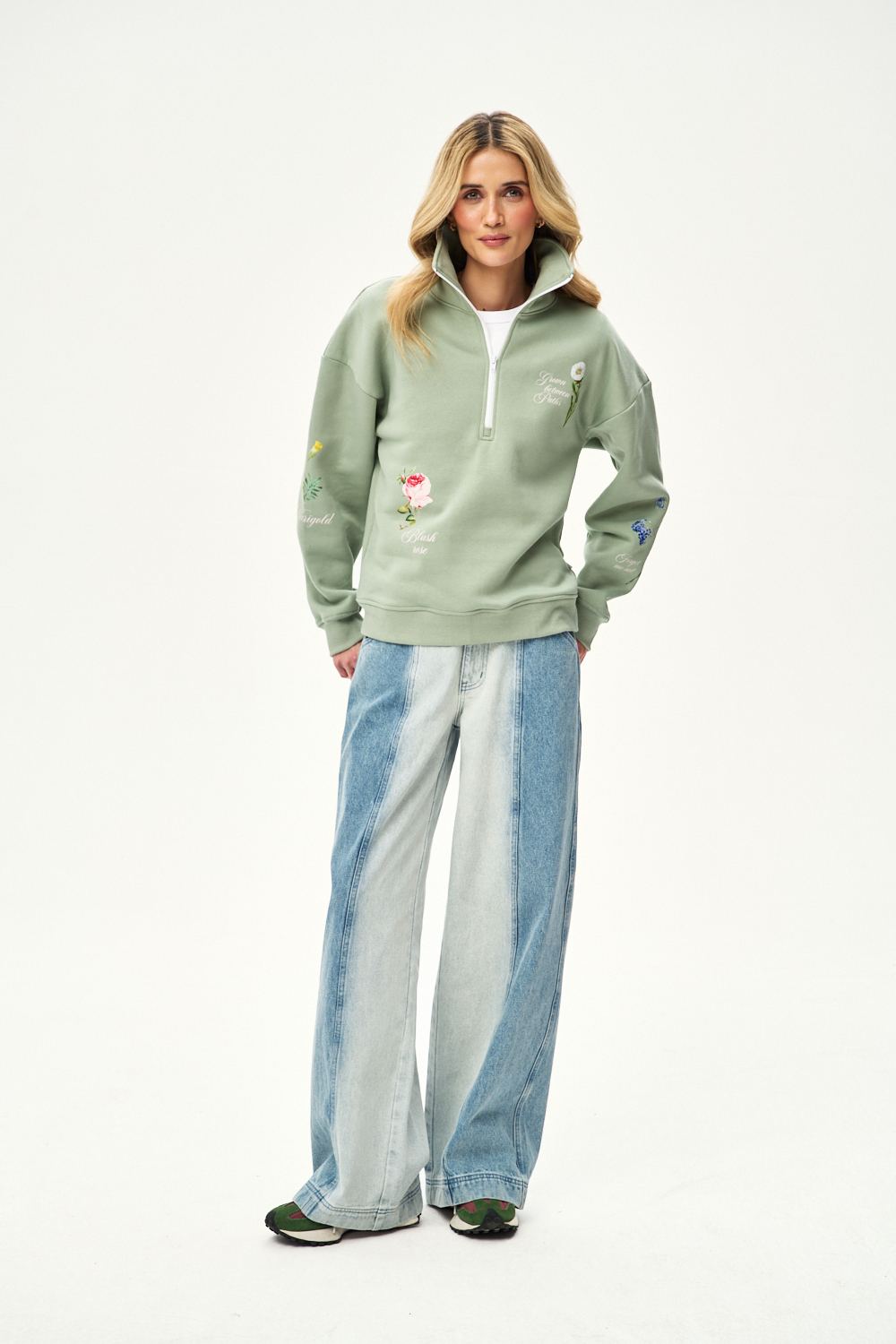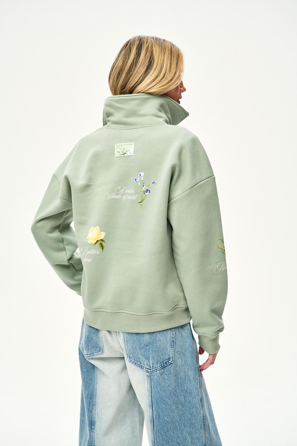 Bluza Lost & Found wyróżnia się delikatnymi grafikami kwiatów, takich jak niezapominajki czy róże, rozmieszczonymi na całej powierzchni. Krótki zamek przy dekolcie pozwala na regulację kołnierza według własnych upodobań.