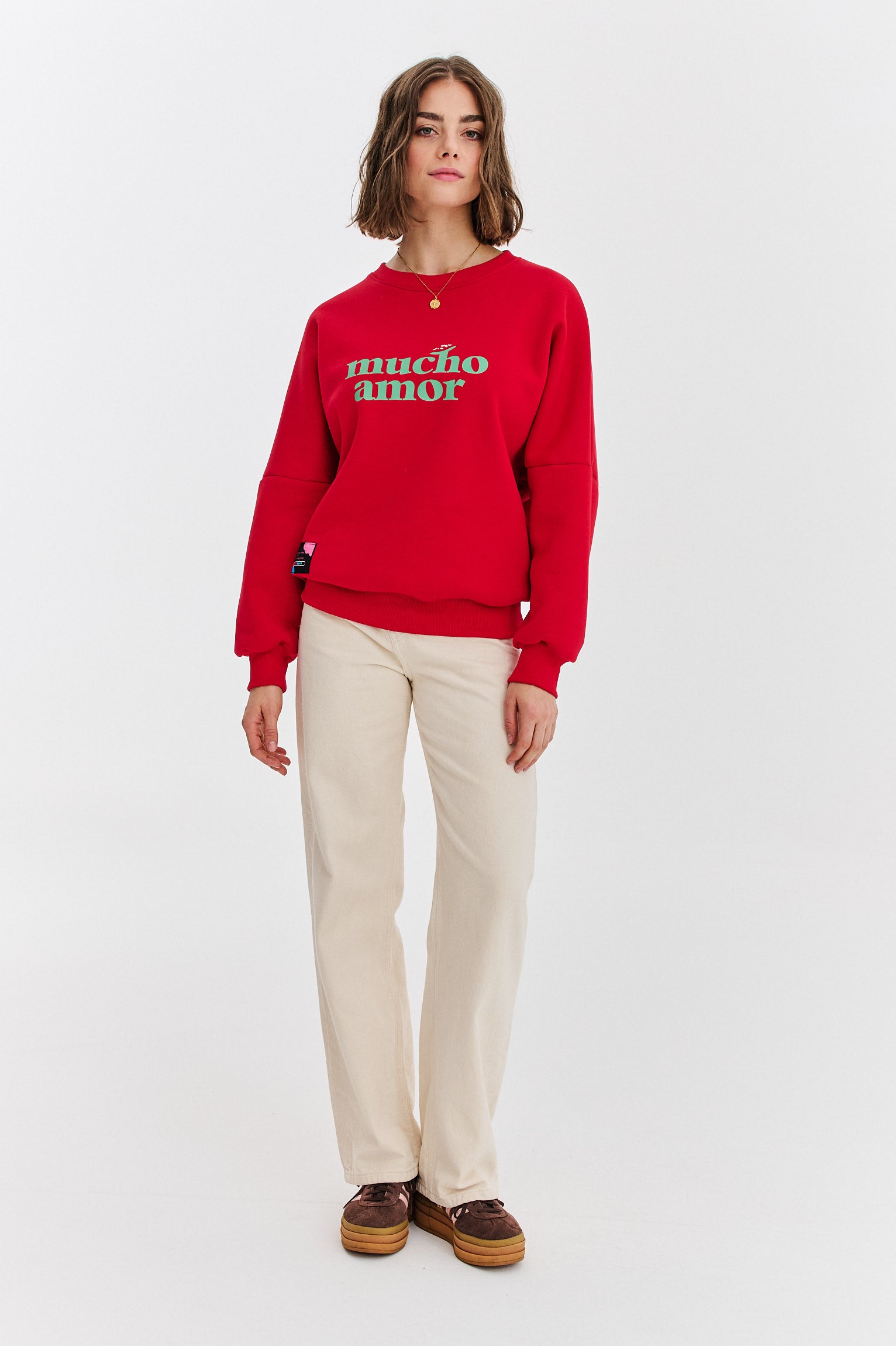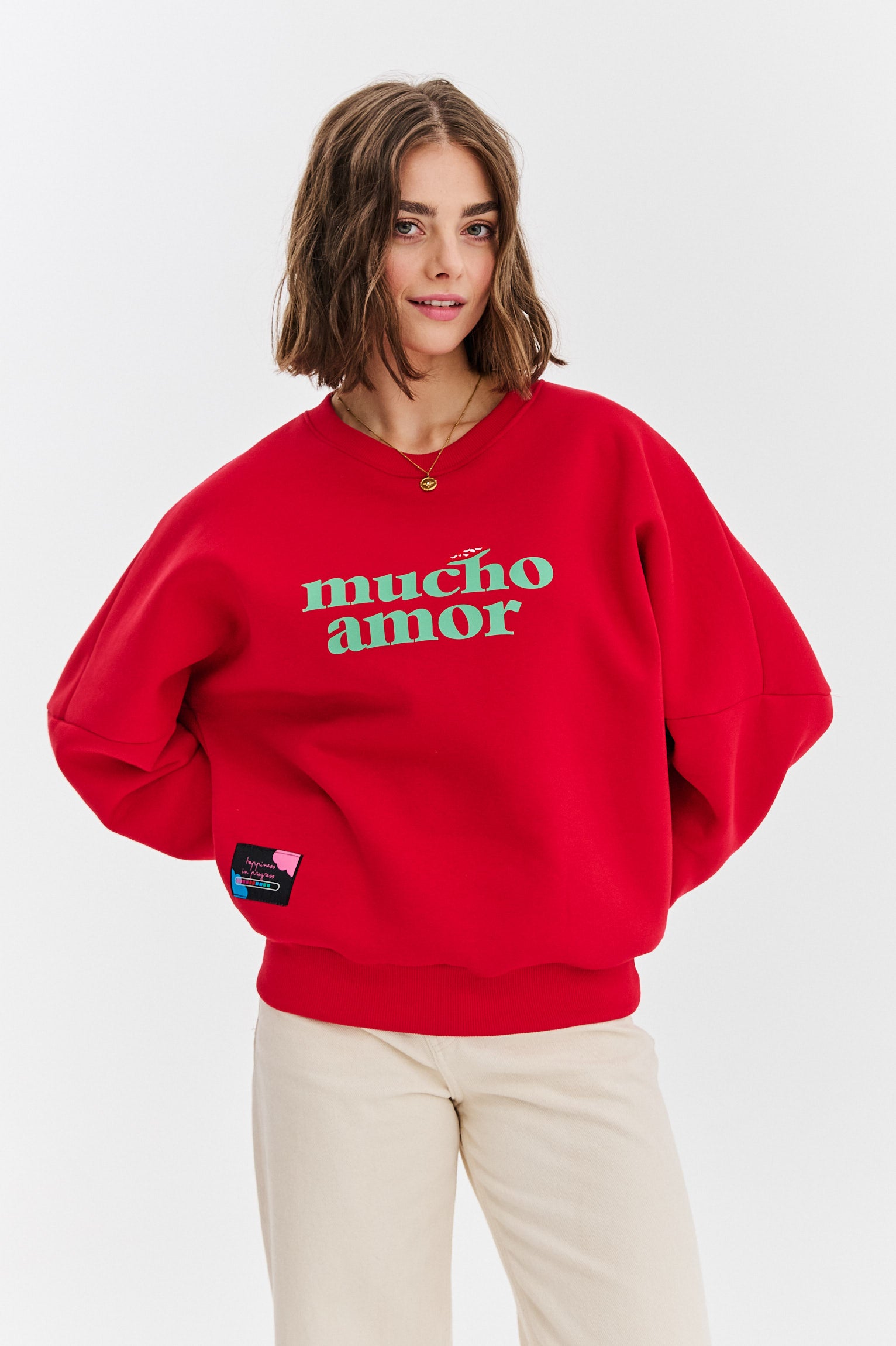 Bluza Mucho Amor to więcej niż ubranie – to manifest radości życia. Intensywny róż i soczysta zieleń tworzą duet, obok którego nie da się przejść obojętnie. Uroku dodaje mały grzybek na literze "o", wyhaftowany miękką techniką szenilową.
