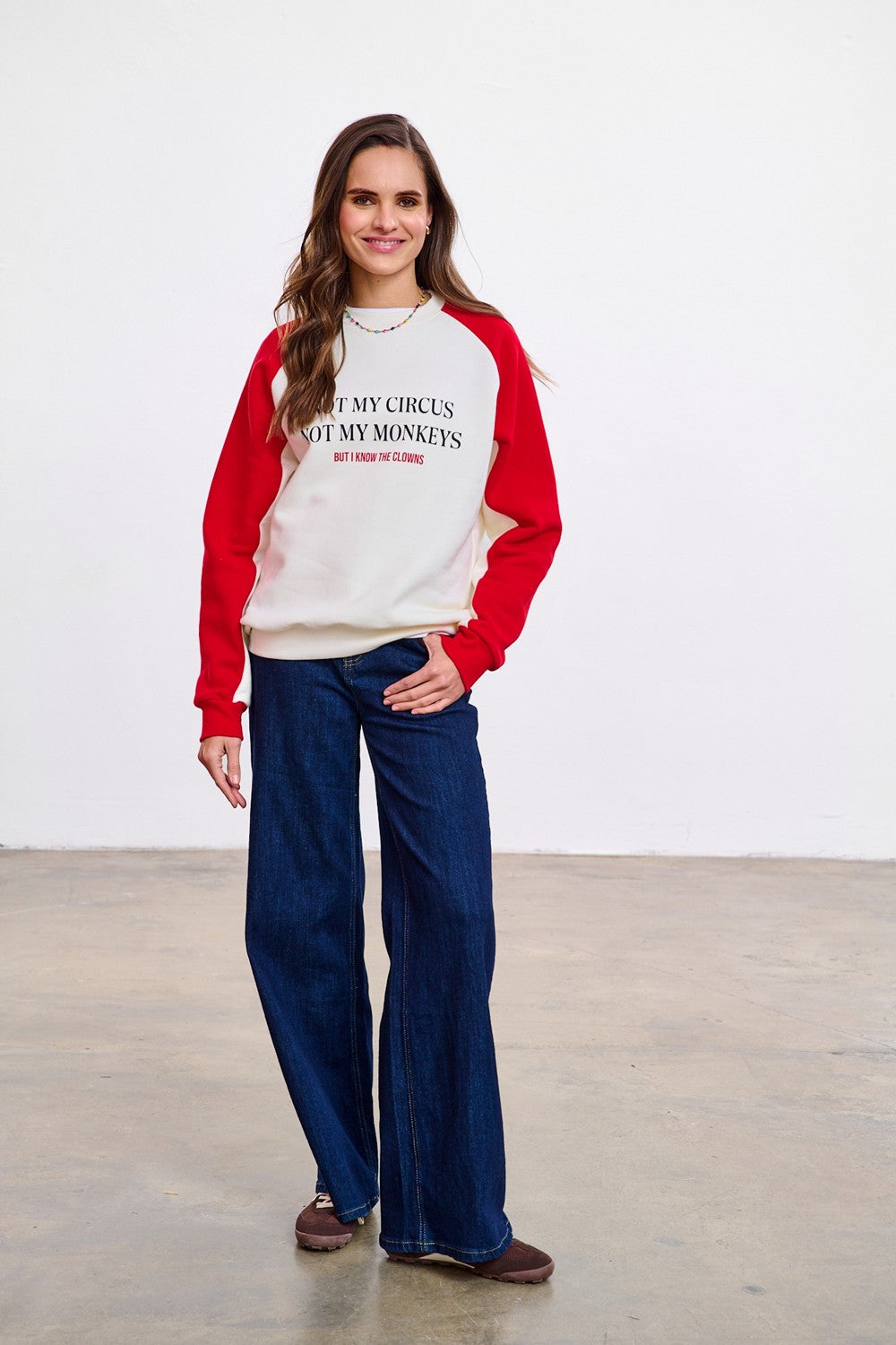 Bluza Not My Circus to nawiązanie do klasycznych bejsbolówek. Biały korpus zestawiono z energetycznymi, czerwonymi rękawami, co nadaje sylwetce lekkości. Centralnym punktem jest ironiczny napis, który idealnie podsumowuje wiele życiowych sytuacji. Ściągacze w kolorze rękawów dopełniają całości.
