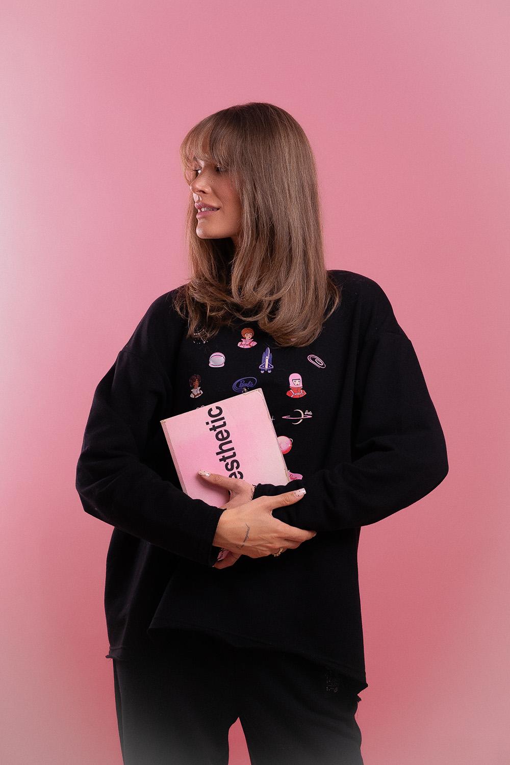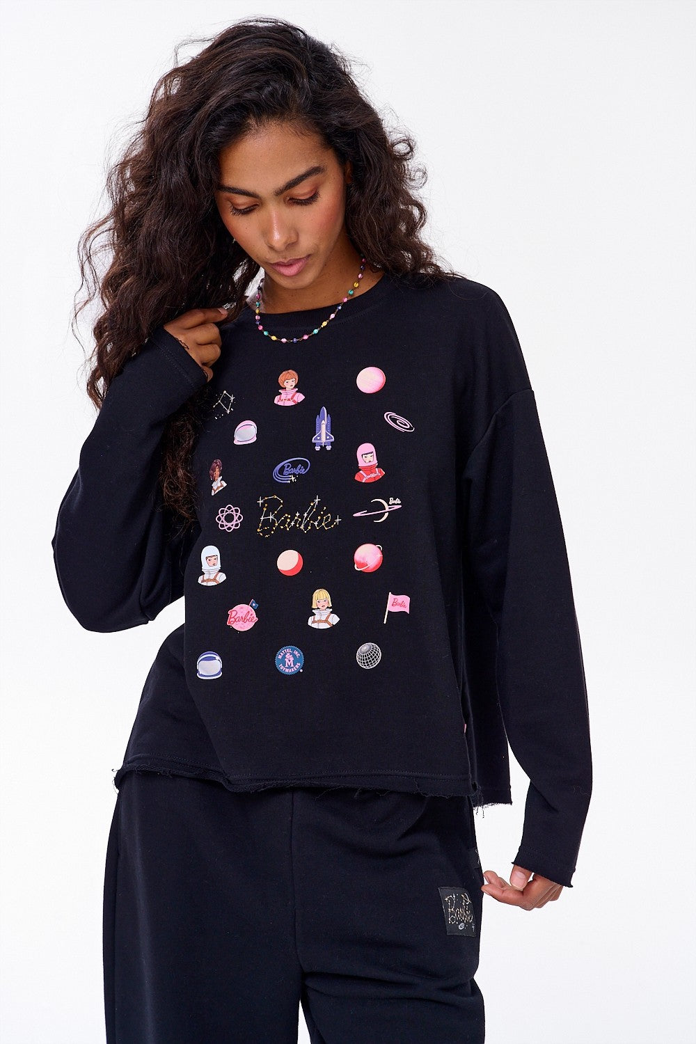 Bluza Out of This World to prawdziwa perełka dla fanek kosmicznych motywów. Na ciemnej bawełnie mienią się dziesiątki kolorowych symboli – od planet i rakiet, po urocze logo Barbie™.