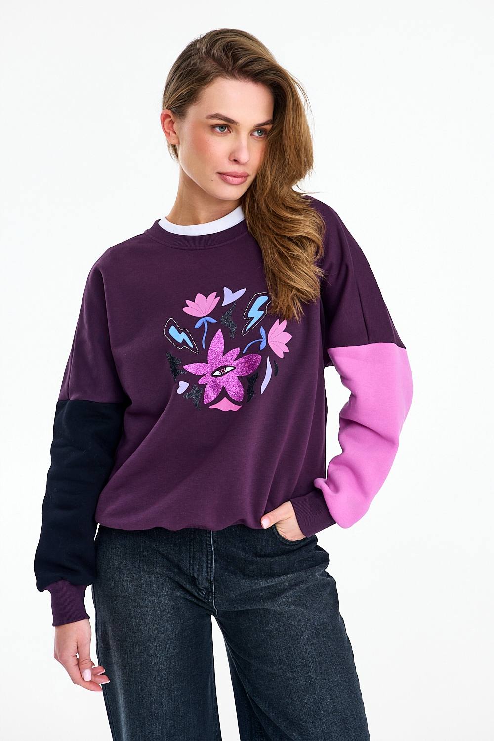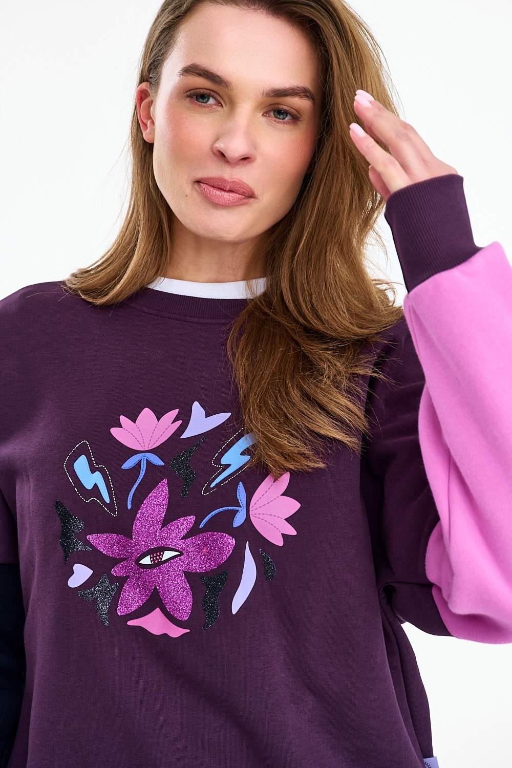 Bluza Purple Rain to nowoczesny design z pazurem. Oversizowy krój łączy w sobie wygodę z awangardowym stylem color blocking. Centralnym punktem jest efektowna grafika z okiem w kwiecie, otoczonym błyskawicami, wykonana z mistycznym motywem.