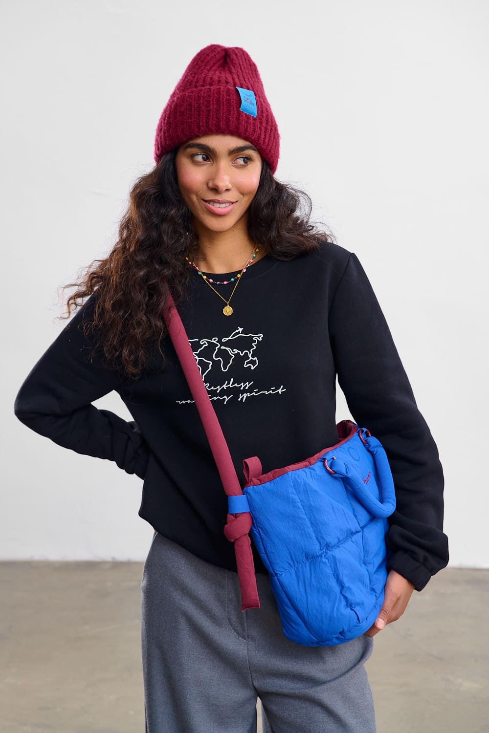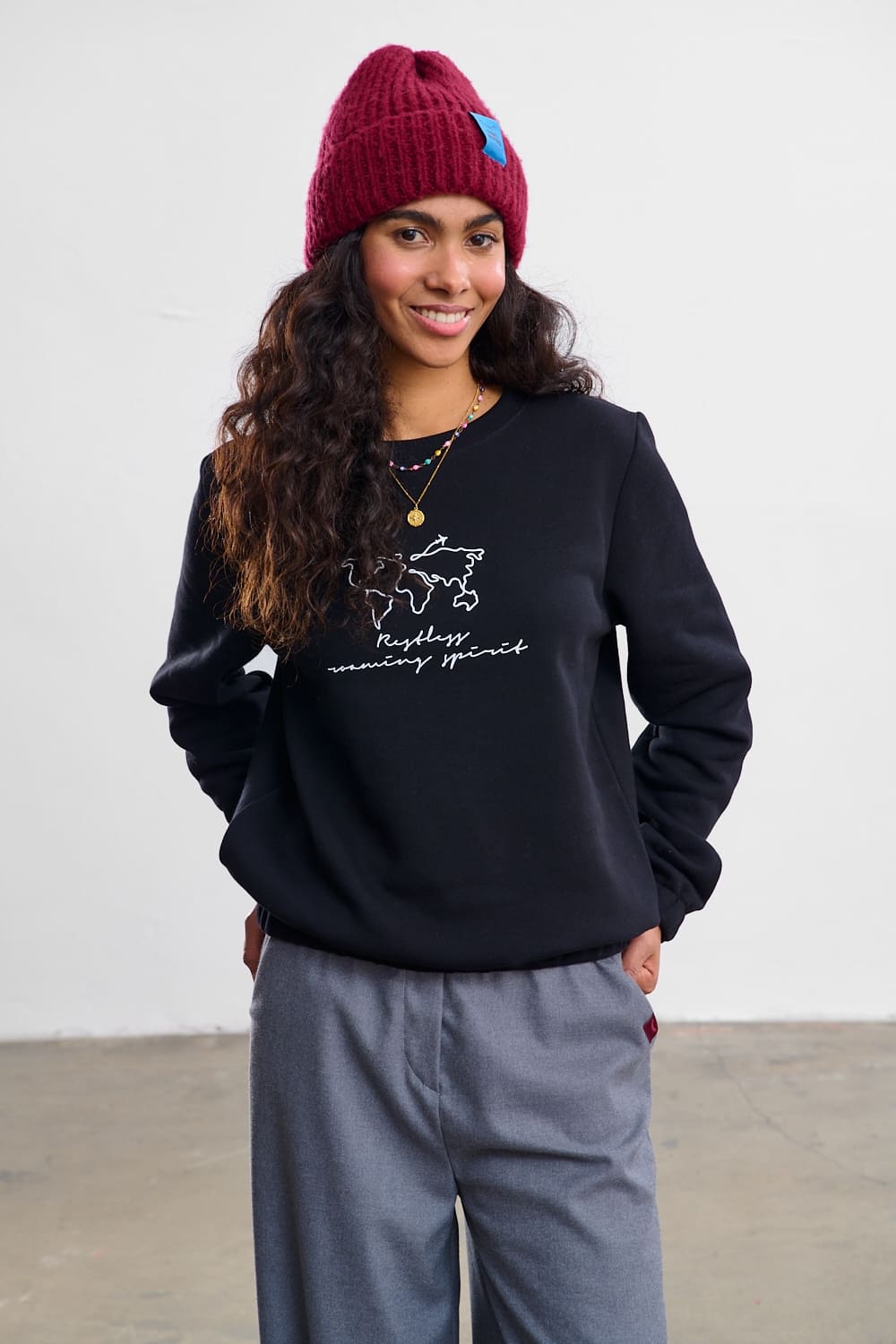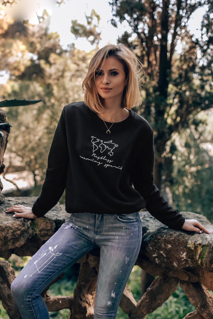 Bluza z nadrukiem Roaming Spirit to hołd dla wszystkich podróżników i marzycieli. Klasyczny, czarny kolor stanowi tło dla subtelnego, białego nadruku przedstawiającego kontury mapy świata oraz inspirujące hasło "Restless roaming spirit".
