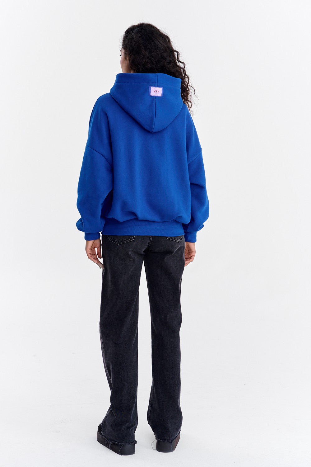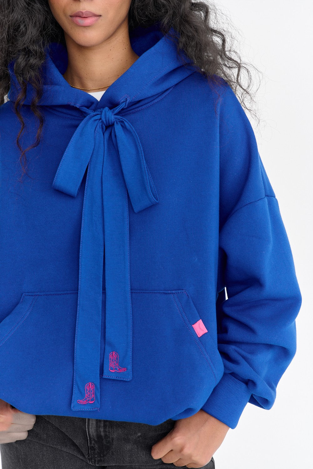 Bluza Rodeo Kiss to definicja wygody w wyrazistym kolorze. Jej energetyczny, niebieski odcień natychmiast ożywi każdą stylizację. To, co ją wyróżnia, to swobodny krój oversize i nietypowe detale – szerokie, materiałowe troczki przy kapturze, które możesz zawiązać w efektowną kokardę.
