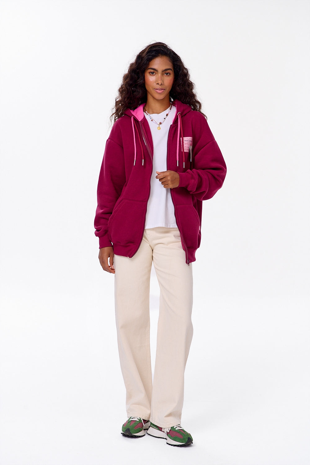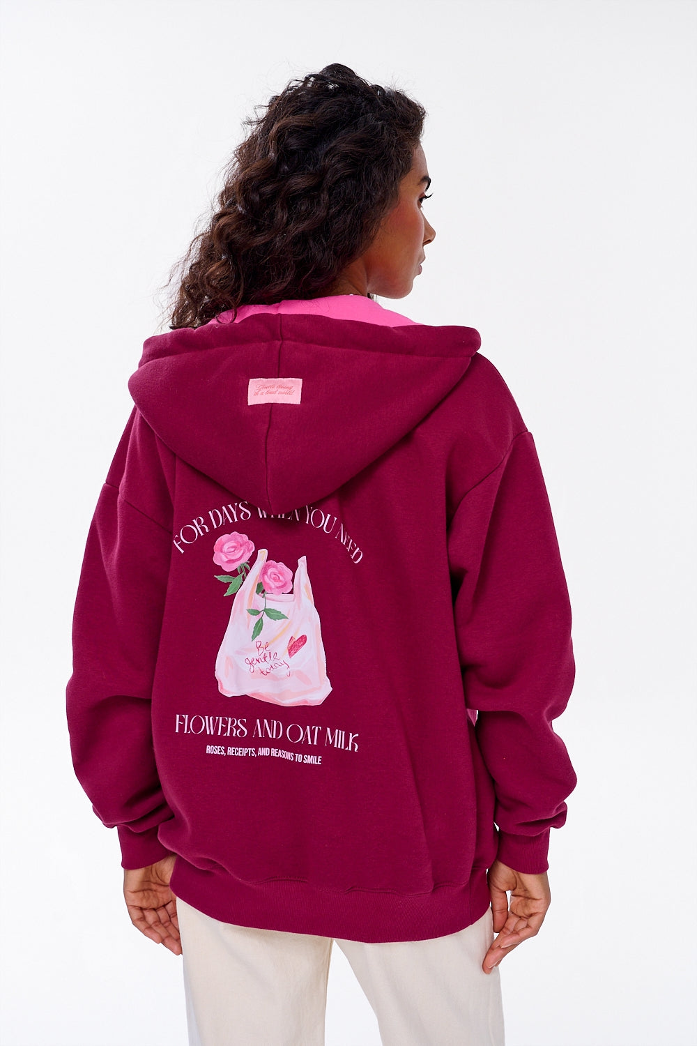 Bluza rozpinana Bag of Bouquets to połączenie komfortu i romantycznej estetyki, które wyróżni Cię w każdej sytuacji. Jej głęboki, bordowy odcień kontrastuje z różowymi detalami, a nadruk na plecach z motywem torby pełnej róż sprawia, że bluza staje się manifestem codziennych drobnych radości.