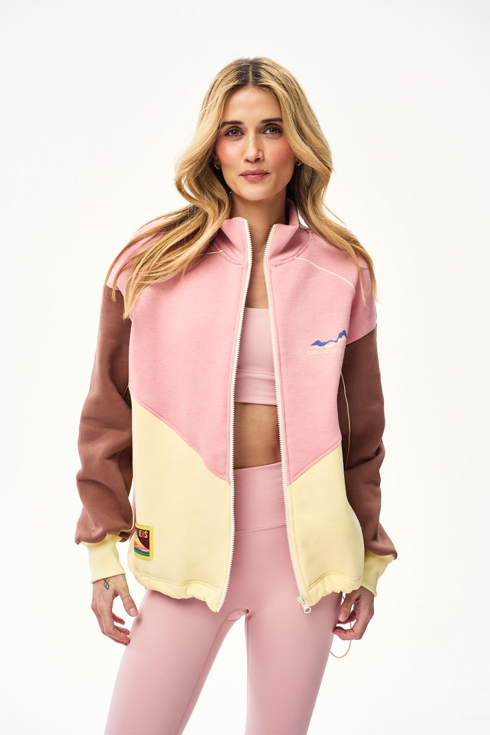 Bluza rozpinana Climbing Day to model stworzony dla aktywnych kobiet, które cenią sobie odważny design. Kontrastowe zestawienie jasnego beżu, ciepłego różu i głębokiego burgundu tworzy dynamiczną całość, która ożywi Twoją outdoorową szafę. Duży nadruk z motywem gór na plecach i napis „Climb all day for a view" to manifest prawdziwej pasji do odkrywania.