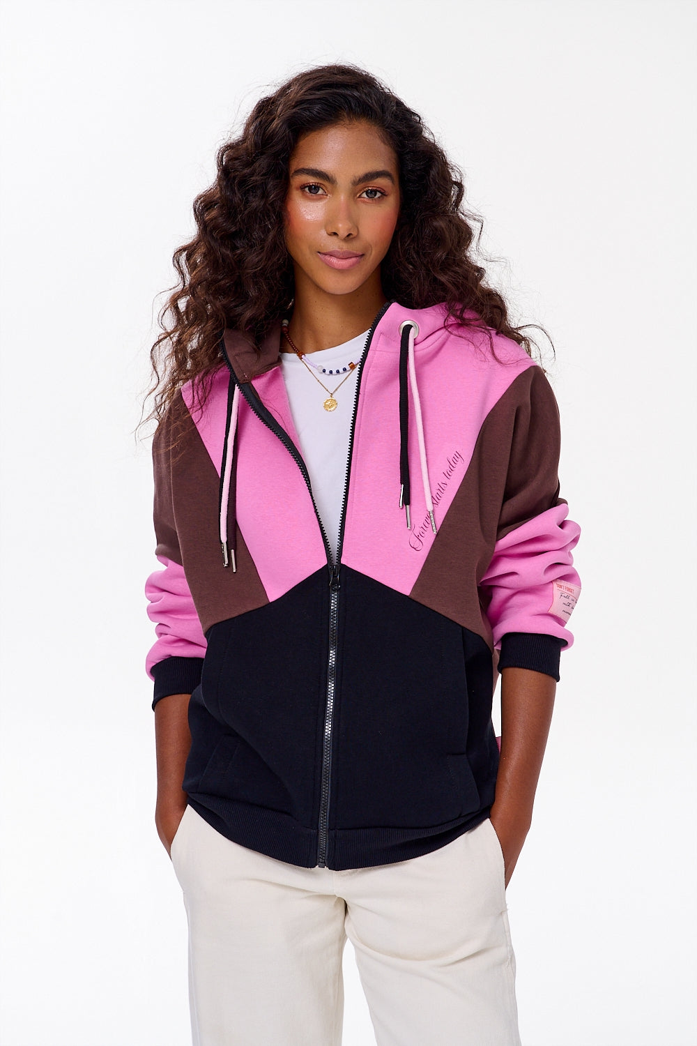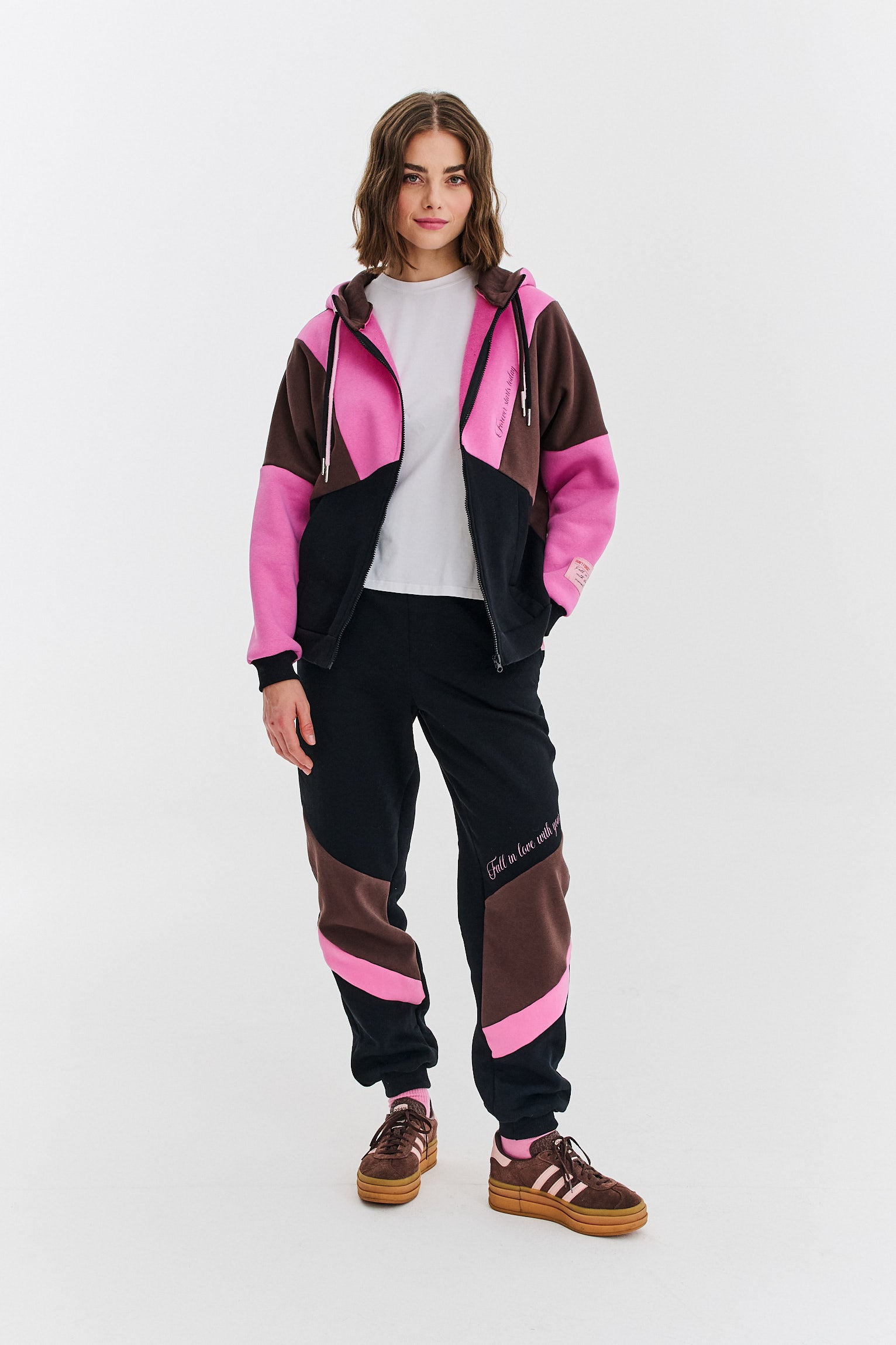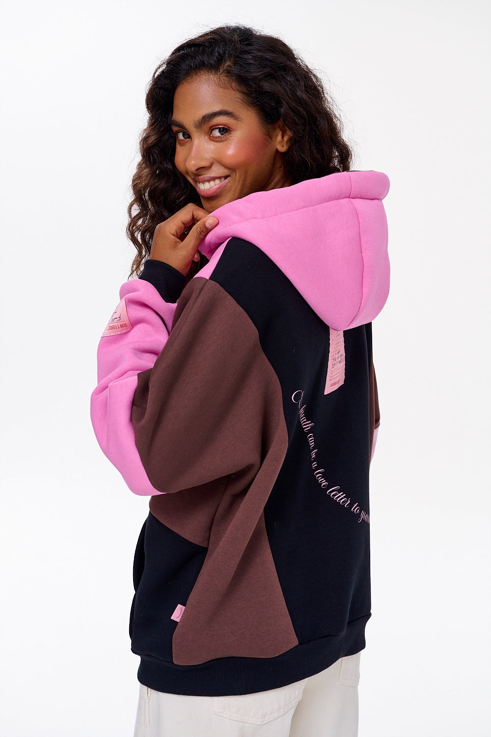 Bluza rozpinana Love Letter to wyjątkowy projekt, który łączy wygodę z emocjonalnym przekazem. Jej oversize'owy krój i geometryczne połączenie kolorów – różu, brązu i czerni – sprawiają, że wyróżnia się na tle klasycznych bluz.