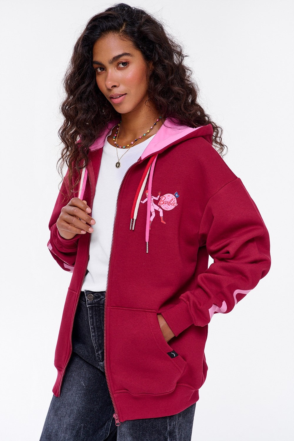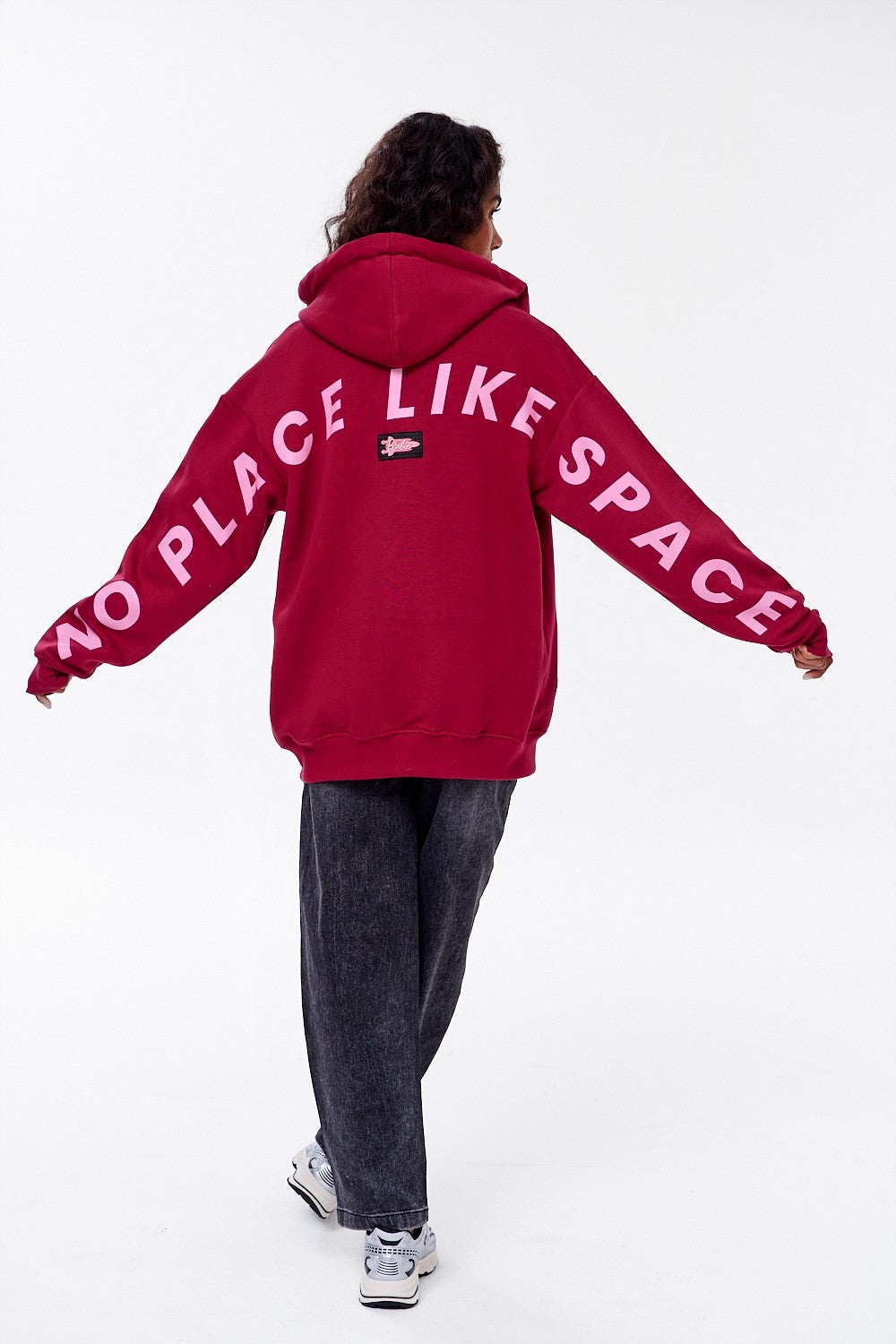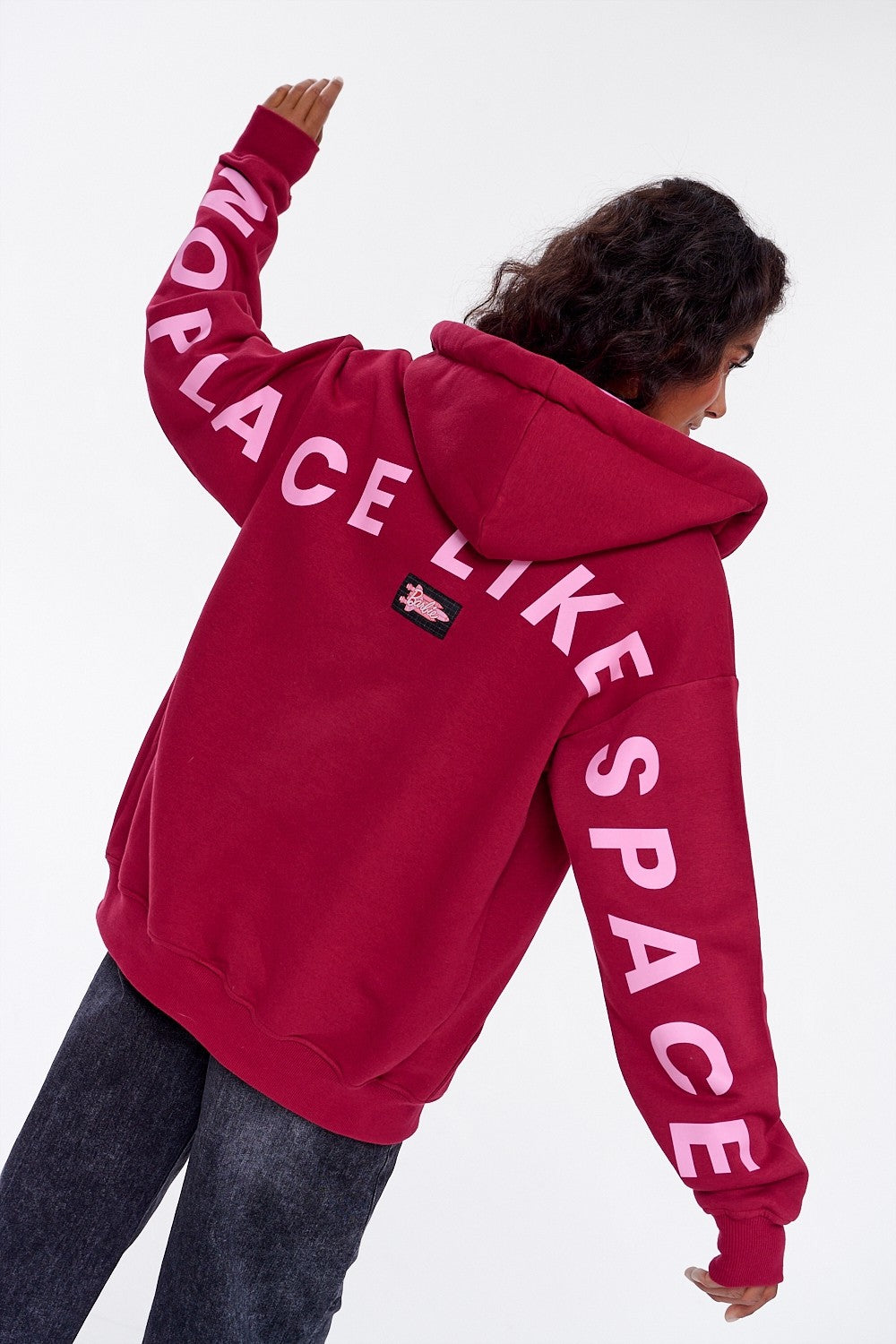 Bluza rozpinana No Place Like Space to definicja wygody w stylowym wydaniu. Jej swobodny, oversize'owy krój z sprawia, że bluza jest niezwykle komfortowa. Główny, bordowy kolor został przełamany różową podszewką kaptura i wielokolorowymi, grubymi sznurkami.