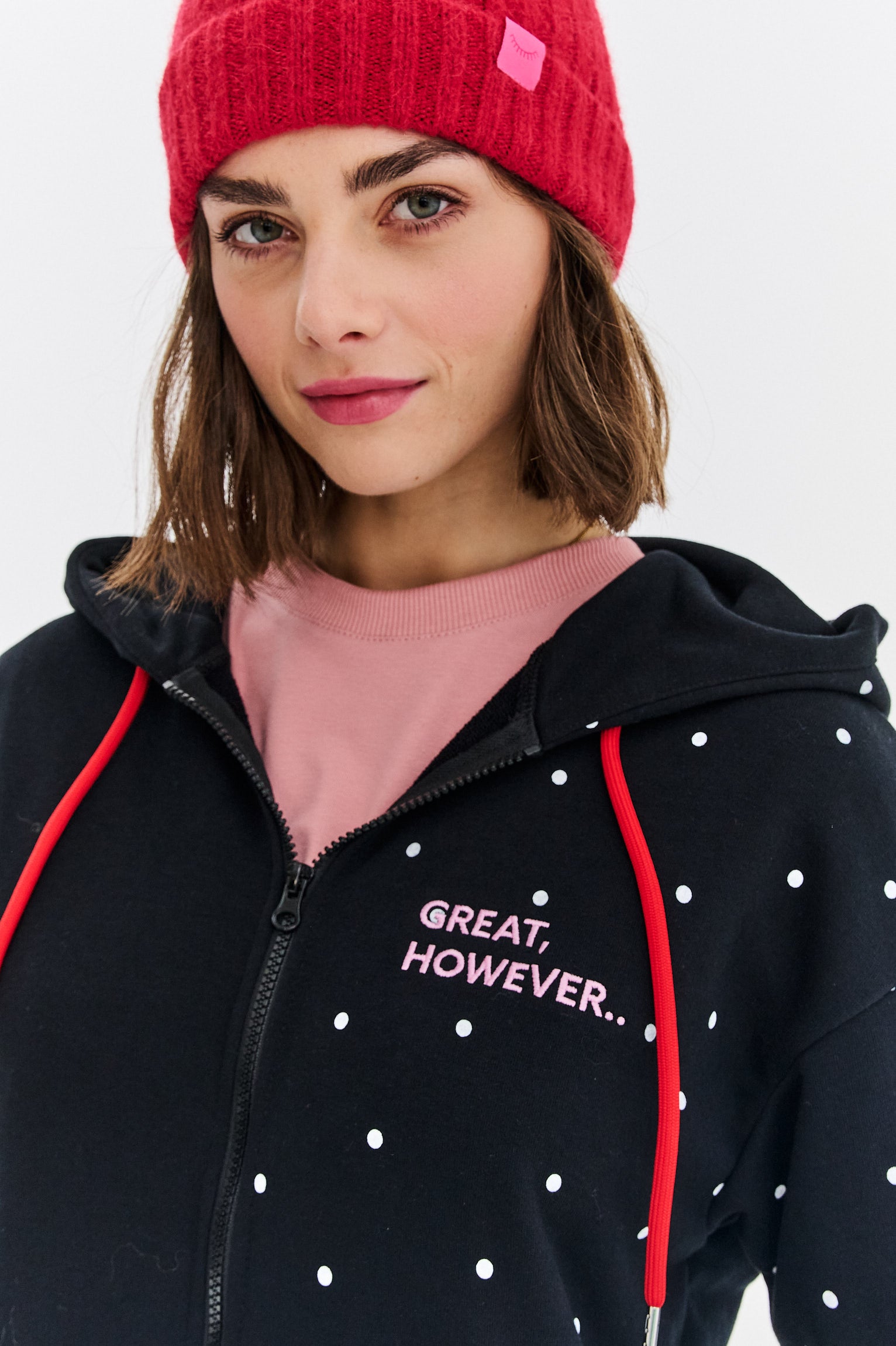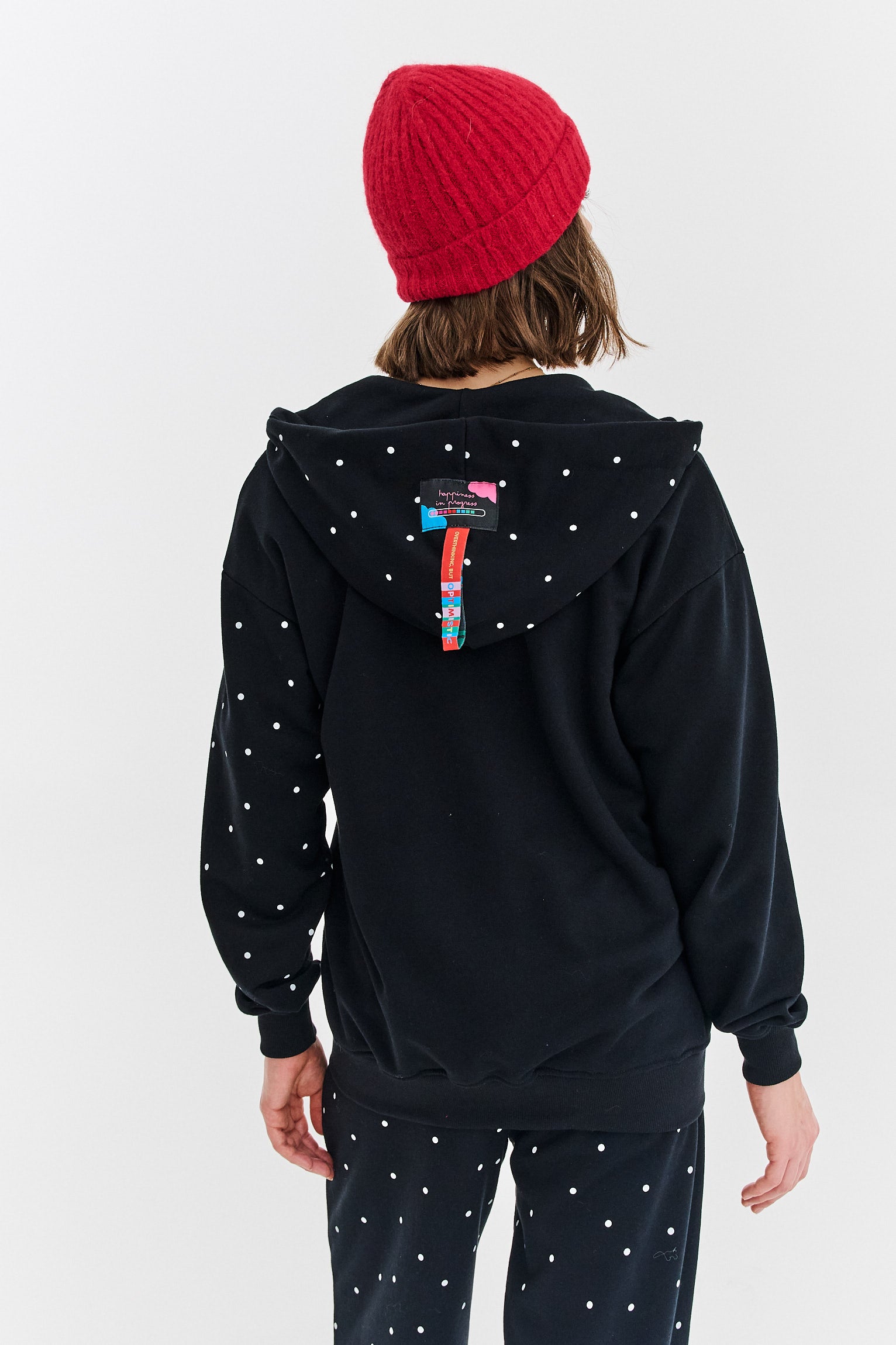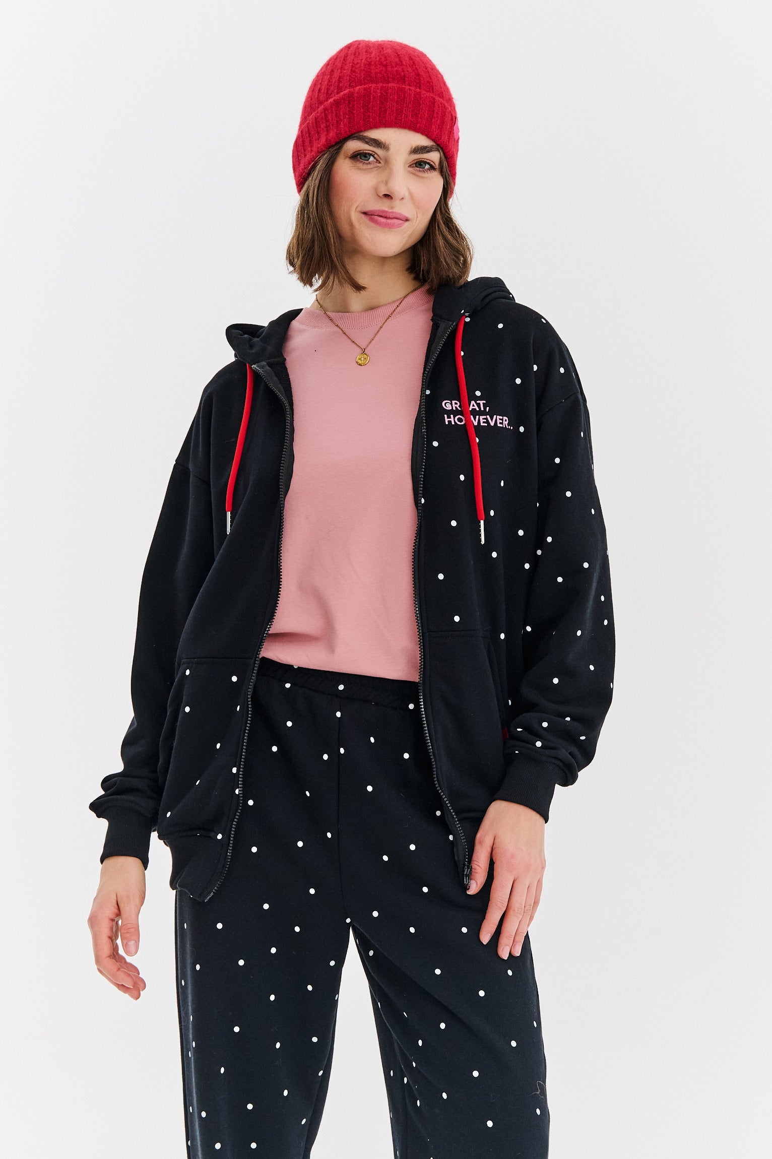 Bluza rozpinana Not Too Bad to nie jest zwykła bluza. To statement piece, który odmieni każdą casualową stylizację. Jej klasyczny fason został przełamany nadrukiem białych kropek, które sprawiają, że nie da się przejść obok niej obojętnie.