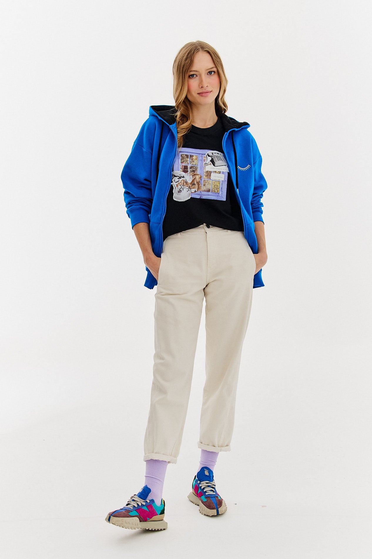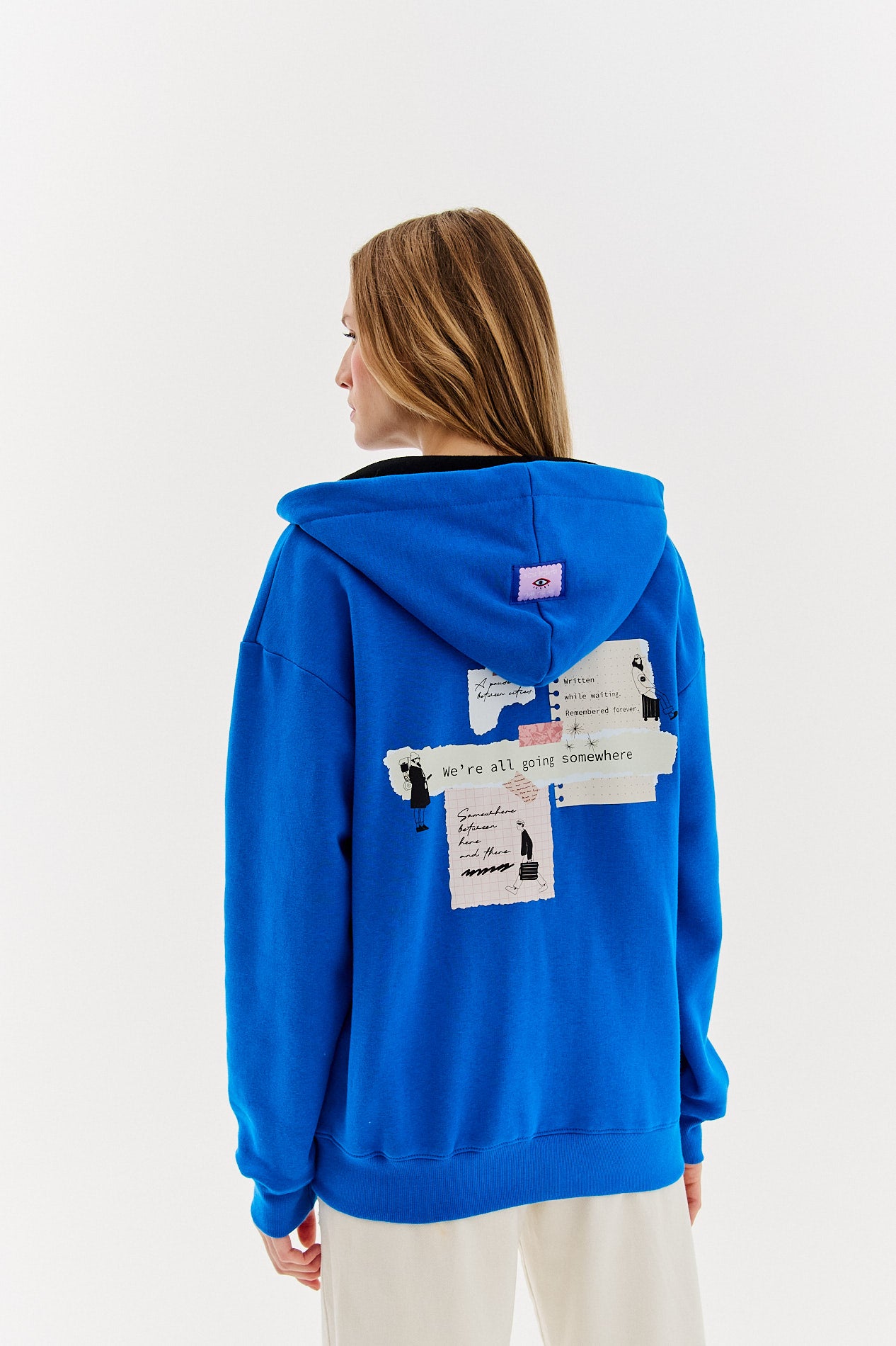 Bluza rozpinana Somewhere Soon to wygodny i uniwersalny model, który powstał z myślą o dziewczynach kochających podróże, nowe inspiracje i wyjątkowe detale. Soczysty niebieski kolor został przełamany pastelowymi akcentami i minimalistycznym haftem na piersi, a na plecach pojawiły się kolażowe naszywki z inspirującymi cytatami o odkrywaniu świata. Bluza jest zapinana na suwak, ma wygodny kaptur i kieszenie na drobiazgi – idealna na każdą pogodę, do miasta, na rower czy spontaniczny wypad za miasto.