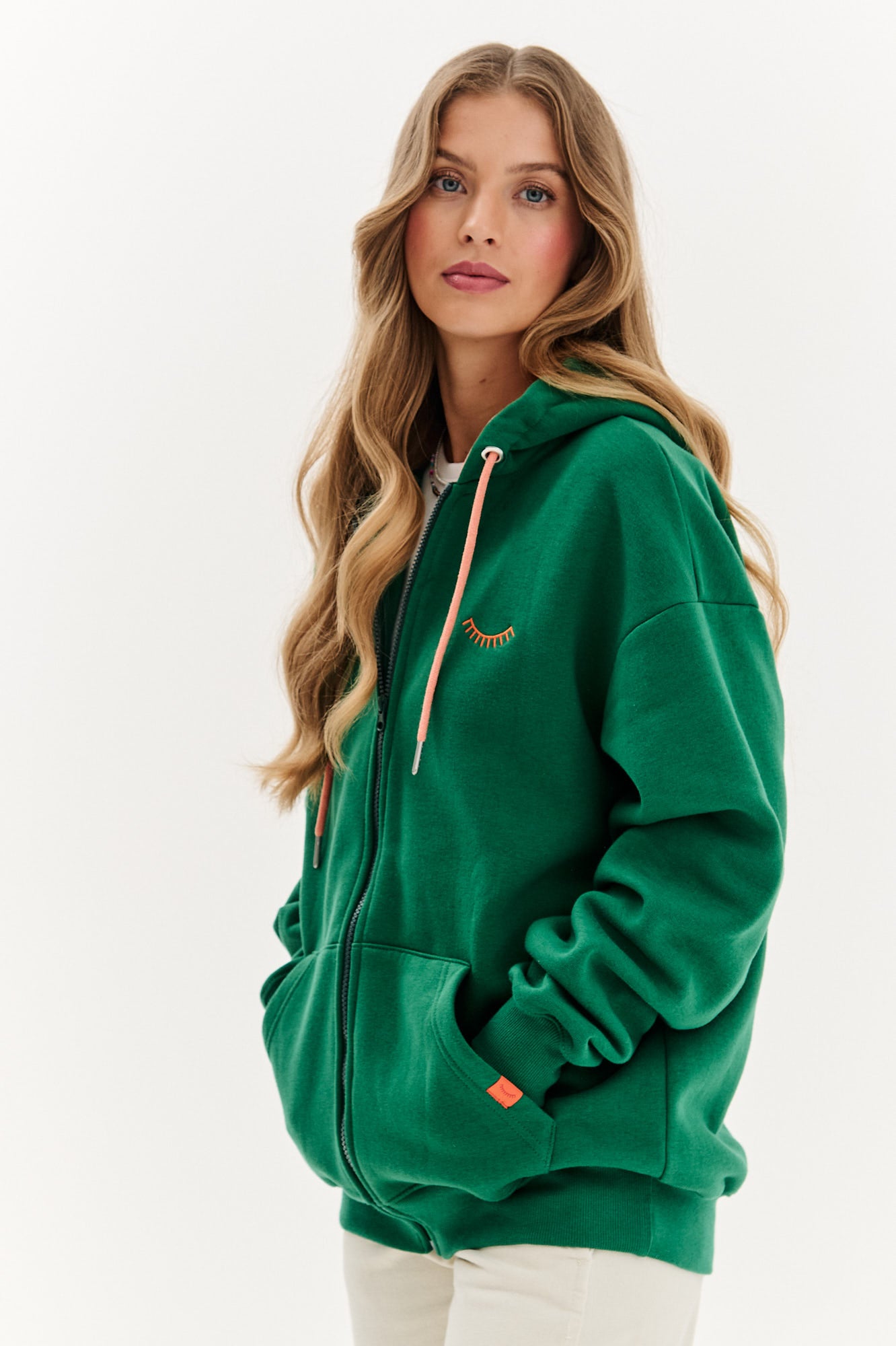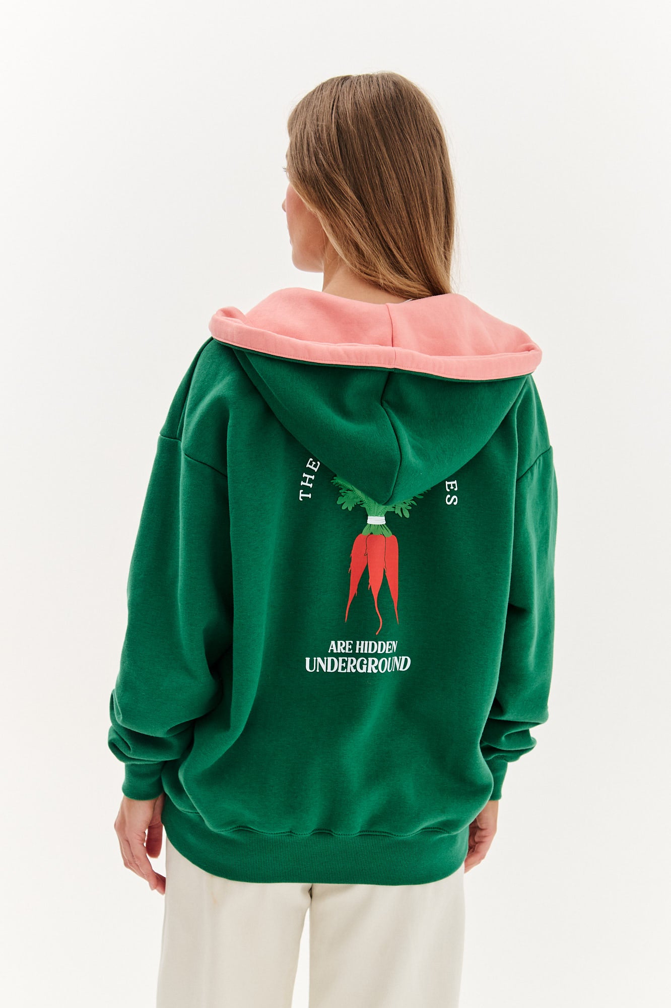 Bluza rozpinana Treasure Roots to manifest natury, komfortu i nieoczywistego piękna. Butelkowozielona dzianina została zestawiona z kontrastową, brzoskwiniową podszewką oraz z wyjątkowym haftem i grafiką z marchewką, pod którą widnieje hasło: „The real treasures are hidden underground". Model przyciąga spojrzenia i opowiada swoją historię – o sile korzeni, o tym, co naprawdę ważne.