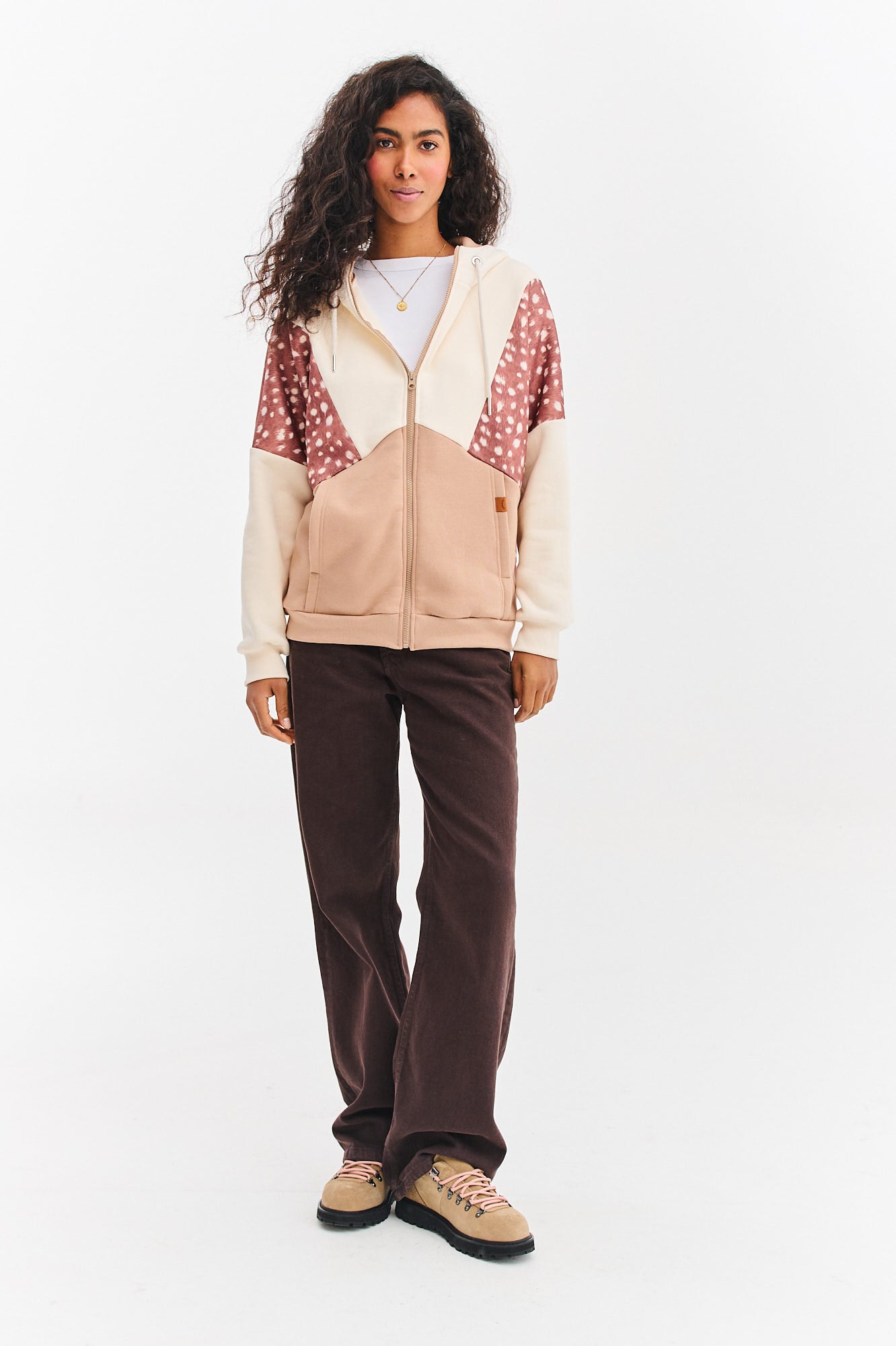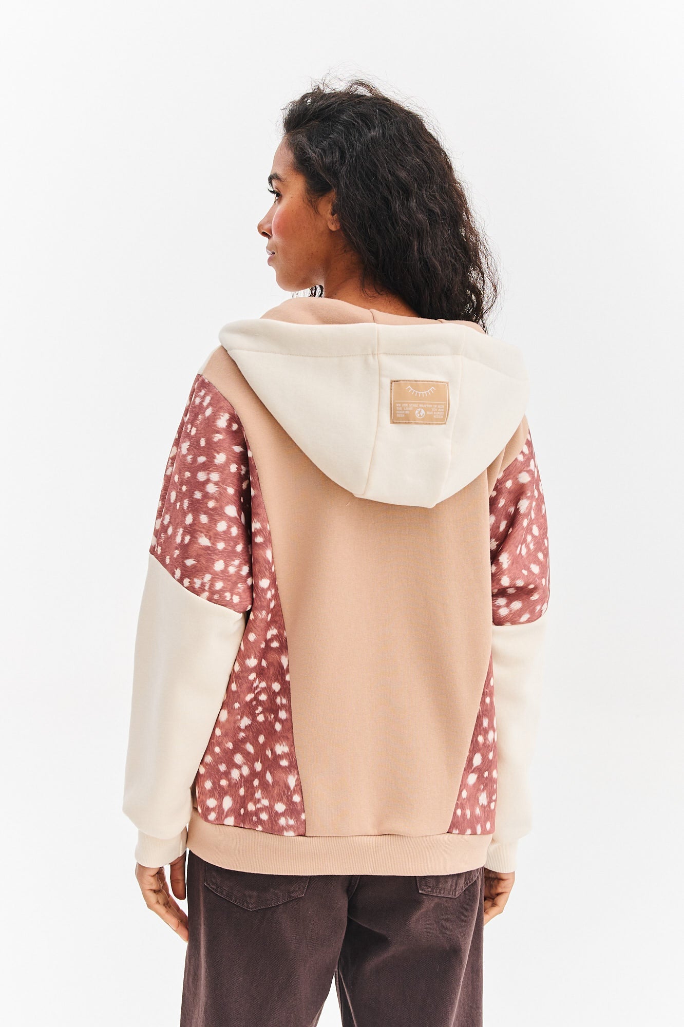 Bluza rozpinana Wild Bambi to połączenie komfortu z najnowszymi trendami. Jej unikalny design opiera się na technice color blocking, łącząc beż i brąz z oryginalnym wzorem w cętki. Bluza posiada praktyczny zamek i obszerny kaptur, który ochroni Cię przed wiatrem.