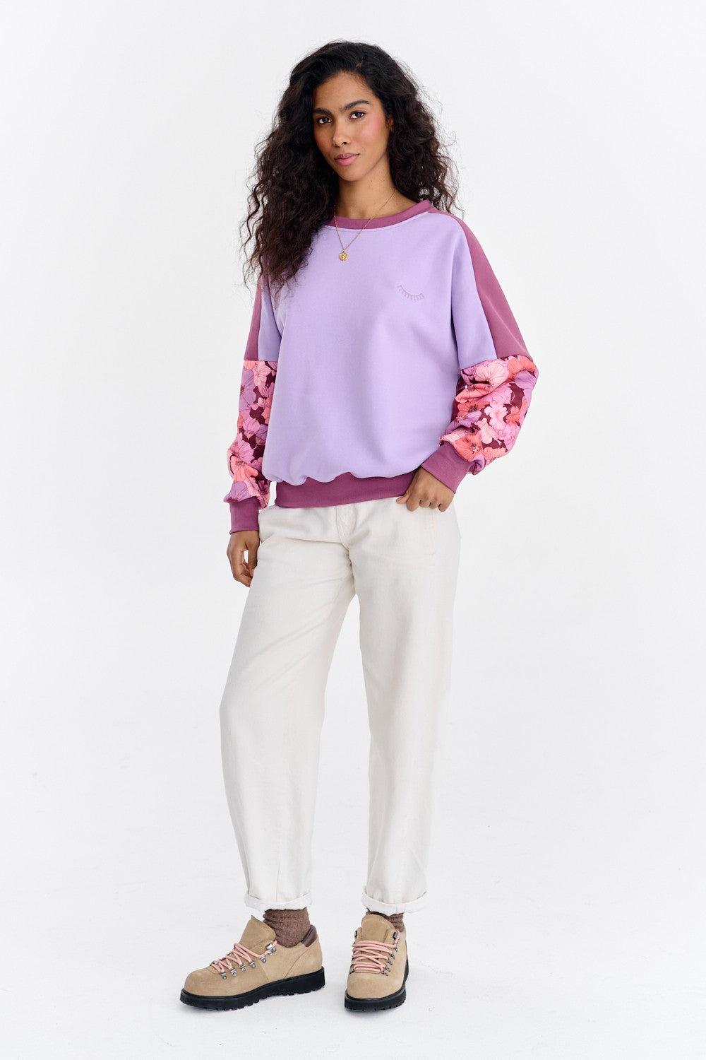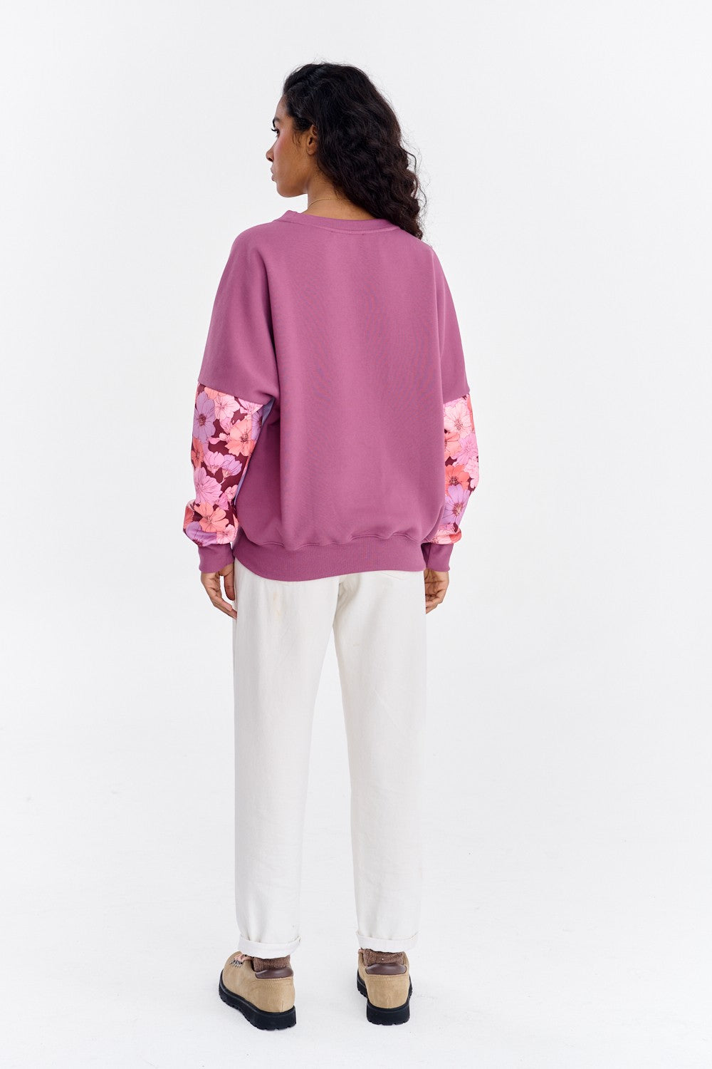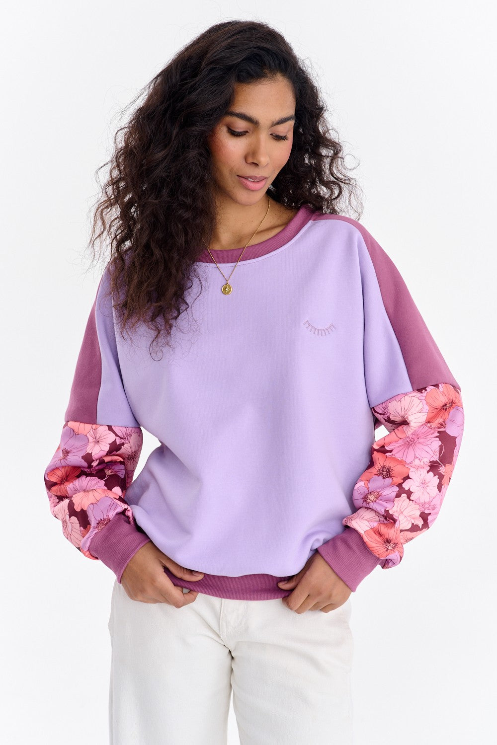 Bluza Soft Blooming to model dla kobiet, które kochają oryginalne połączenia. Baza bluzy opiera się na zasadzie color-blockingu, łącząc pastelowy fiolet z głębszym, bordowym odcieniem na rękawach i ściągaczach. Prawdziwą ozdobą są jednak rękawy, pokryte pięknym, kwiatowym printem.