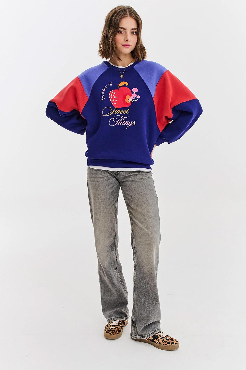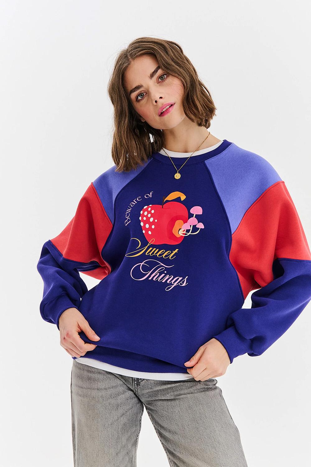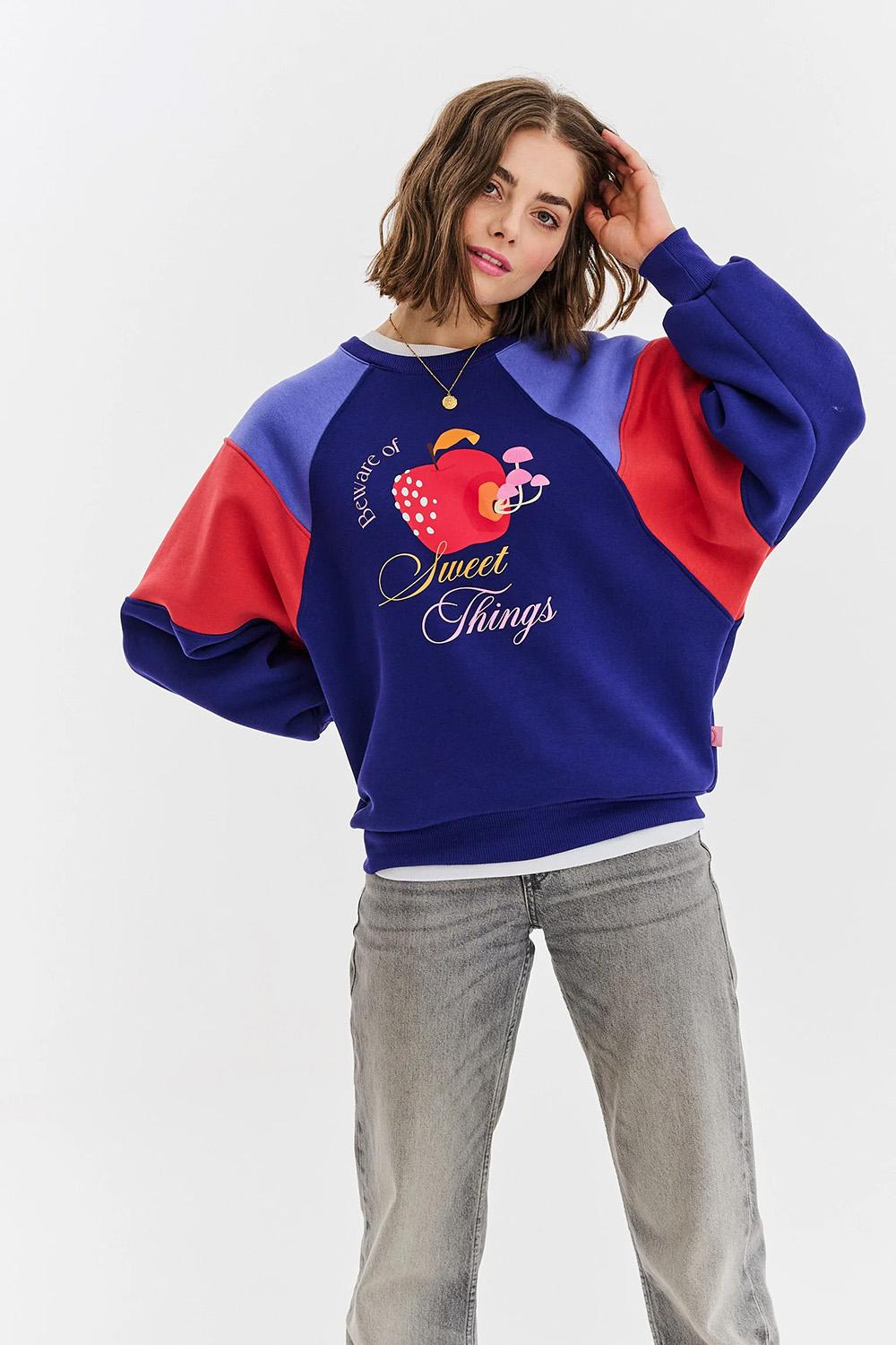 Bluza Sweet Things to kwintesencja radosnego i swobodnego stylu. Jej design opiera się na modnym łączeniu kolorów, czyli technice color block, która nadaje jej charakteru retro. Centralnym punktem jest uroczy nadruk z truskawką i napisem "In search of Sweet Things".