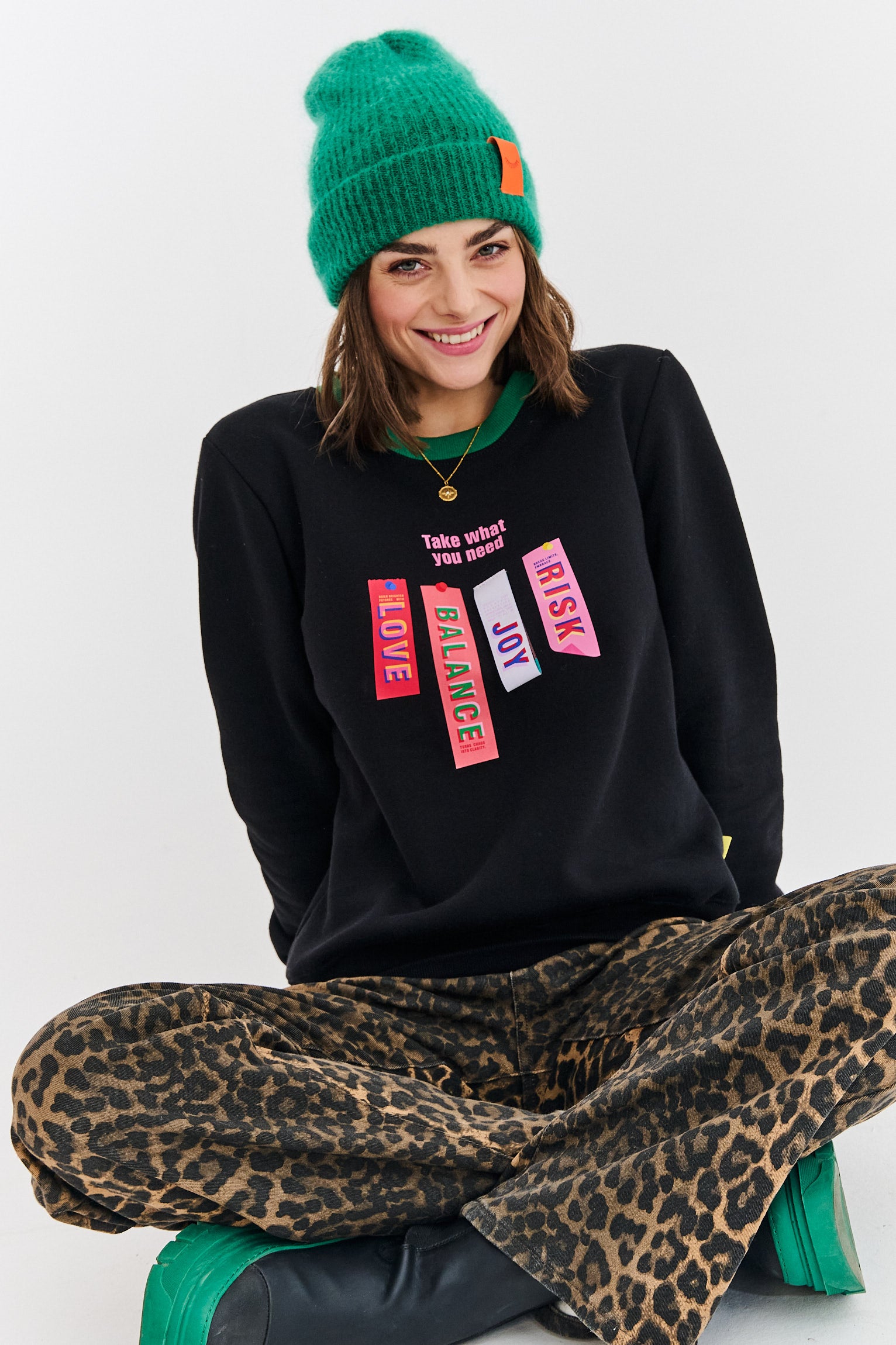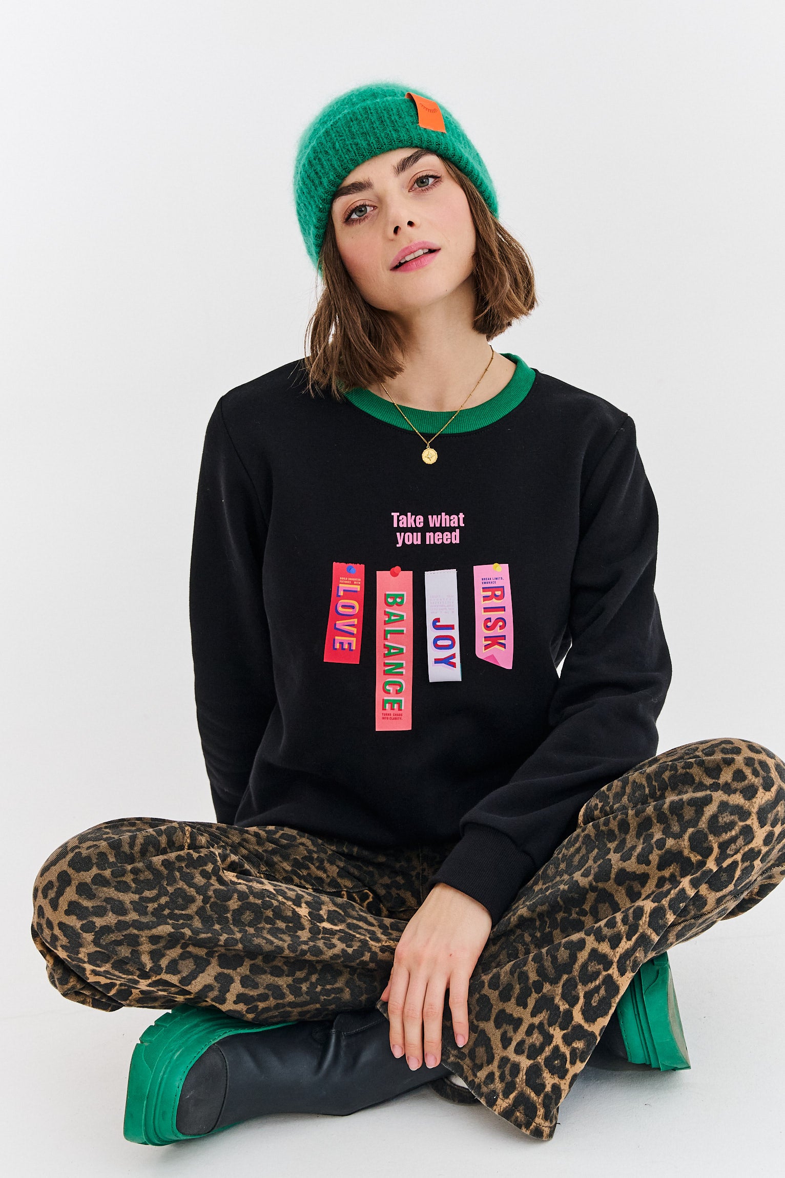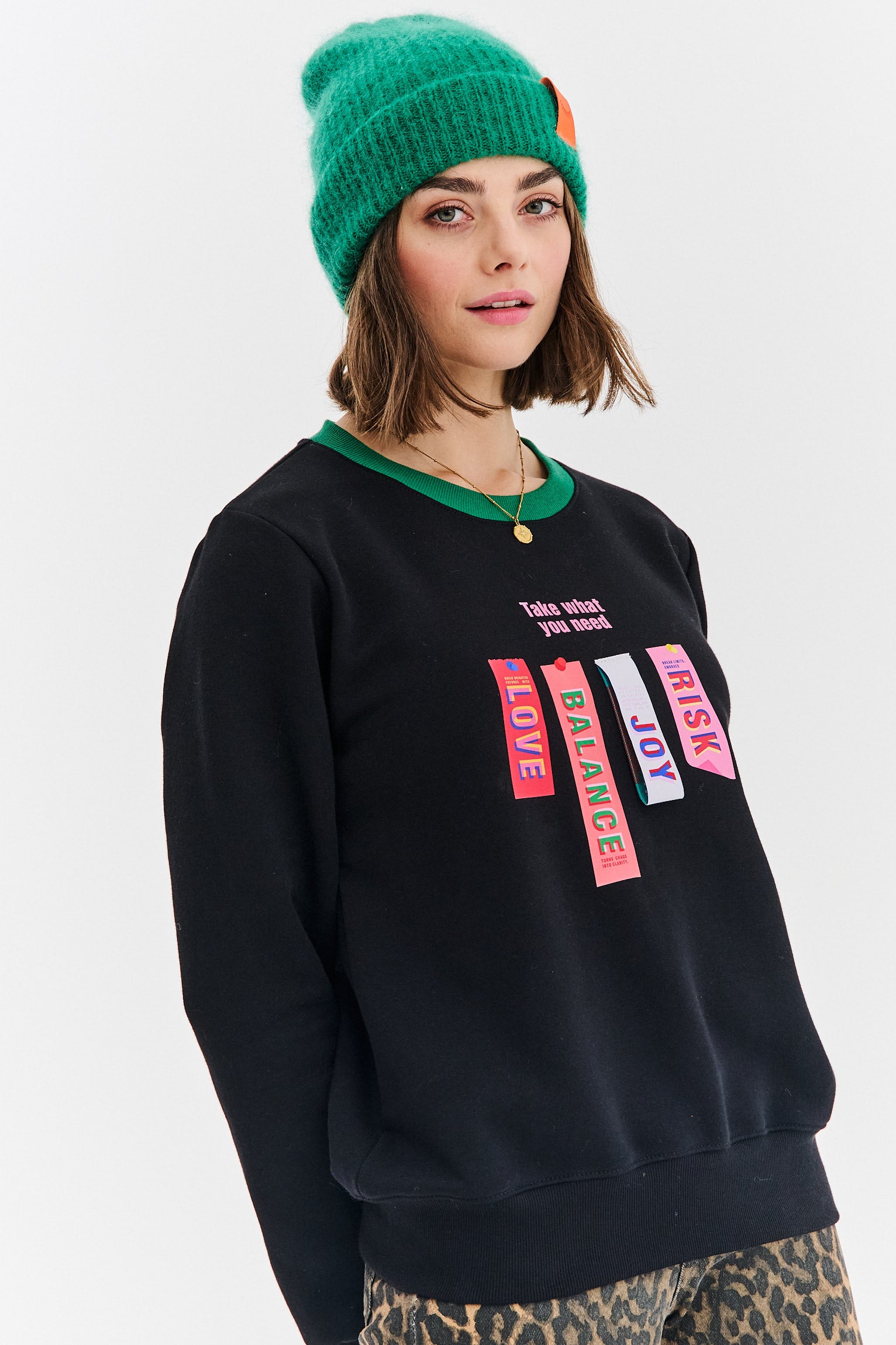 Bluza Take What You Need to manifest dobrej energii. Jej design opiera się na mocnych kontrastach – głębokiej czerni, energetycznej zieleni i wielobarwnym nadruku. To ubranie, które nie tylko świetnie wygląda, ale też niesie ze sobą pozytywne przesłanie.