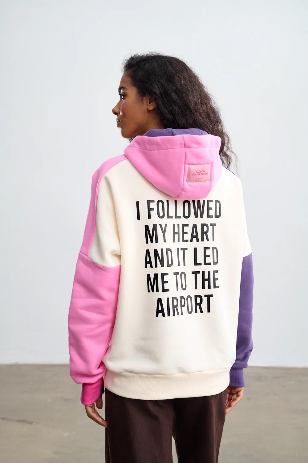 Bluza Terminal One została stworzona z myślą o podróżniczkach. Beżowy korpus idealnie współgra z kolorowymi rękawami w odcieniach różu i fioletu. Hasło na plecach: "I followed my heart and it led me to the airport" to motto każdej fanki odkrywania świata. Praktyczna kieszeń kangurka pomieści bilet i telefon.