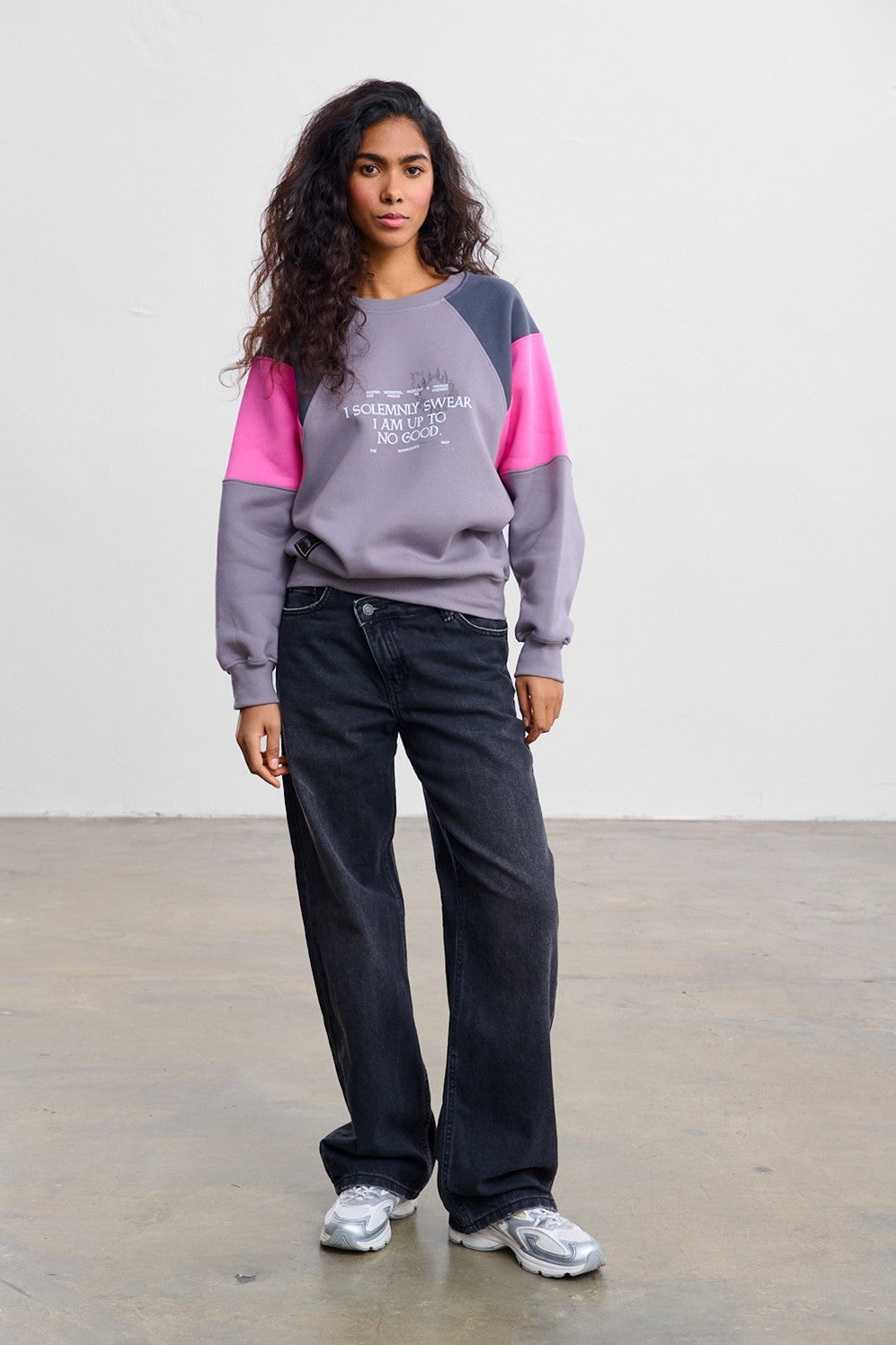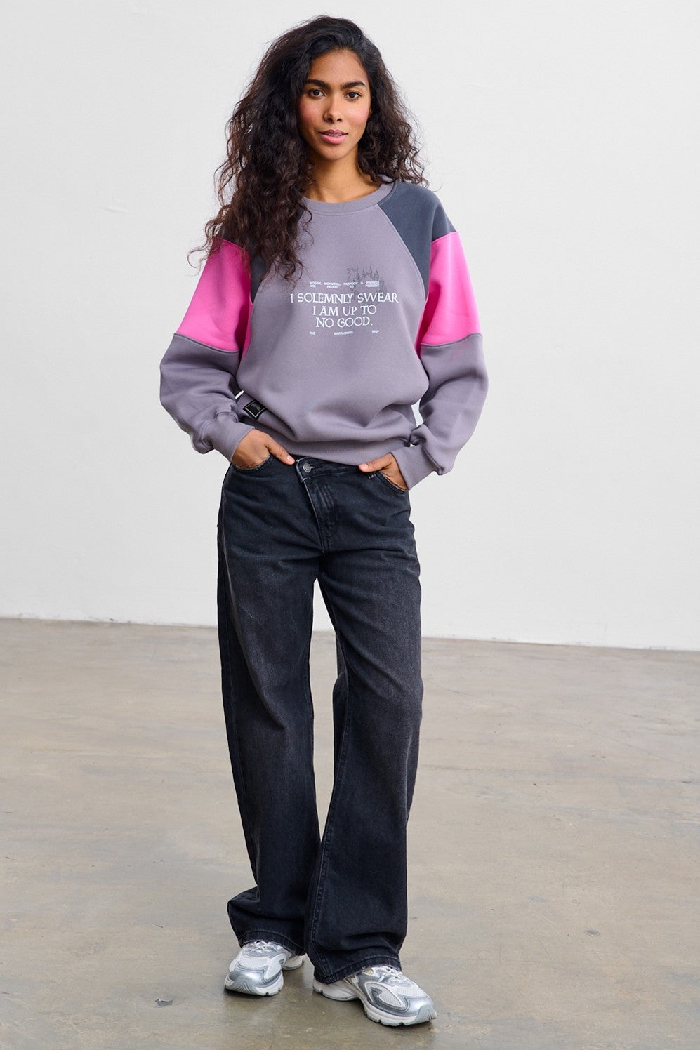 Bluza Troublemaker to nowoczesne spojrzenie na świat Harry'ego Pottera. Geometryczne połączenie jasnej szarości, ciemnego grafitu i intensywnego różu na rękawach nadaje jej sportowego, świeżego wyglądu. Luźny krój zapewnia swobodę.