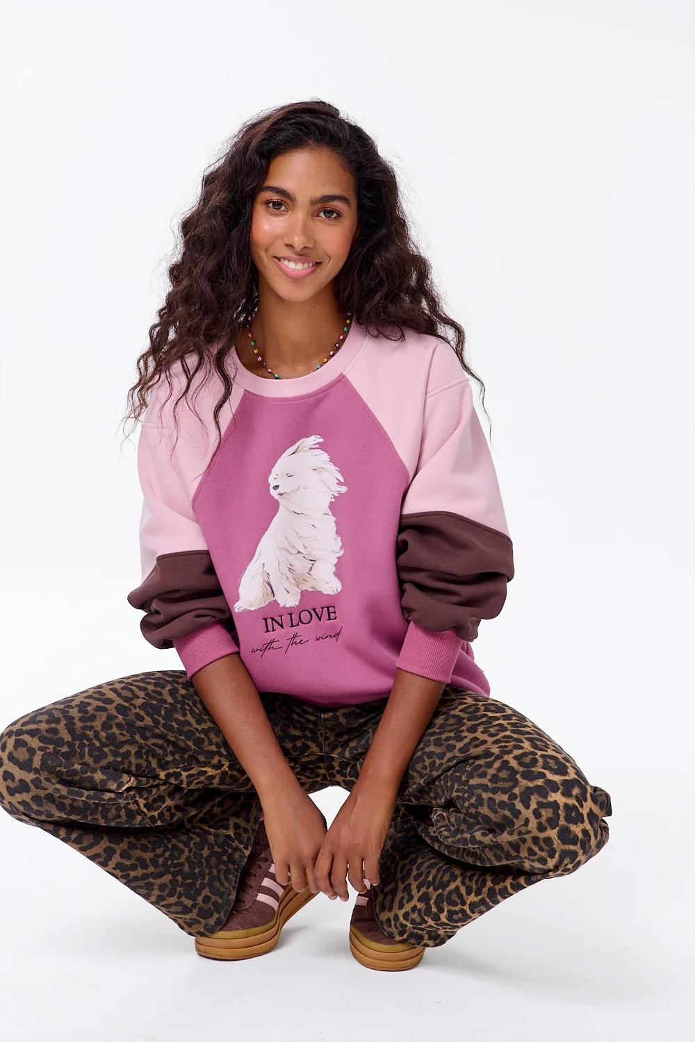Bluza Windy Love to połączenie subtelnego romantyzmu i wygodnego, codziennego stylu. Utrzymana w odcieniach różu z kontrastującymi rękawami, wyróżnia się uroczą grafiką psa na wietrze oraz haftowanym napisem In Love with the wind. To projekt, który niesie ze sobą lekkość, beztroskę i odrobinę nostalgii.