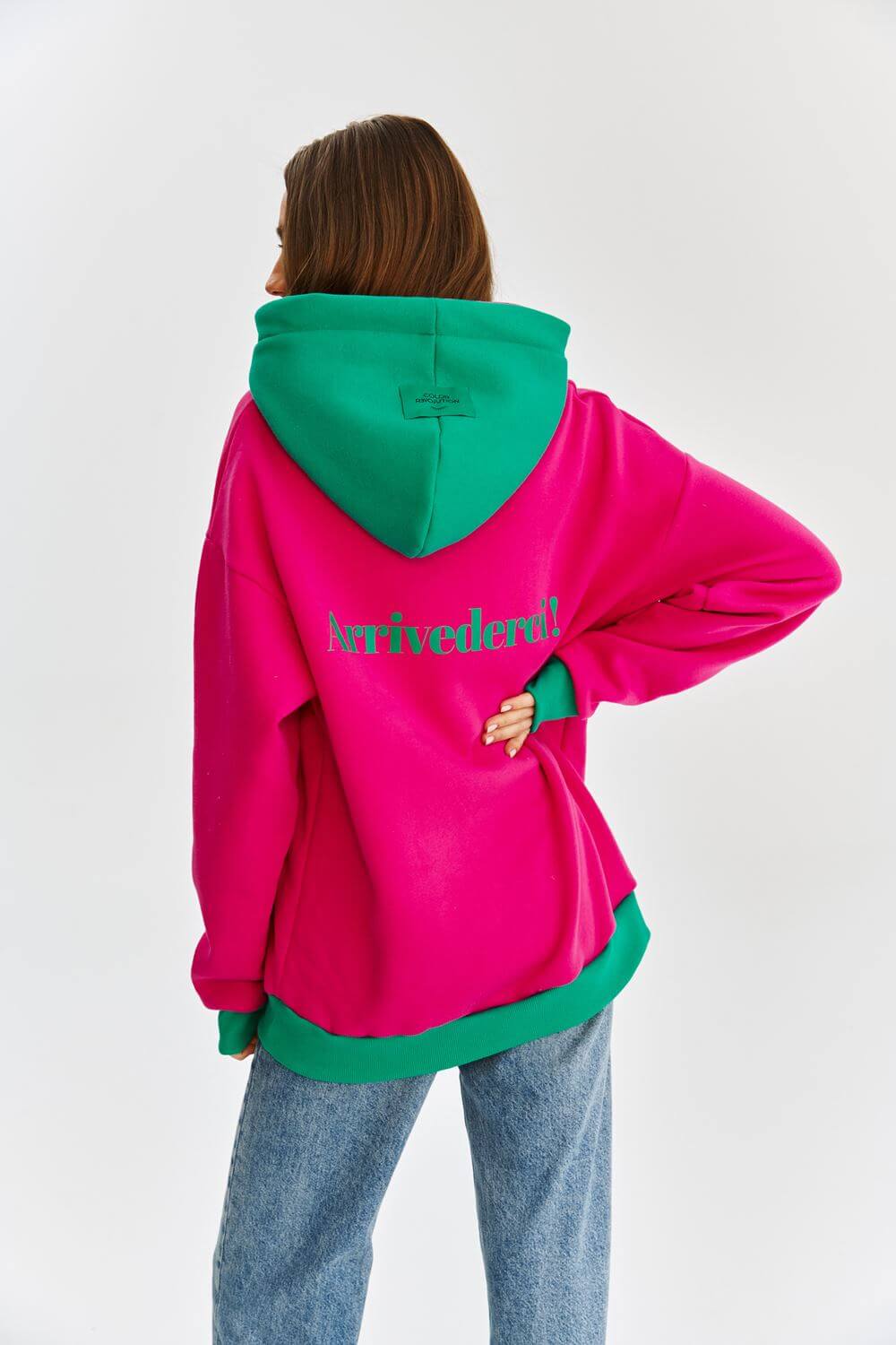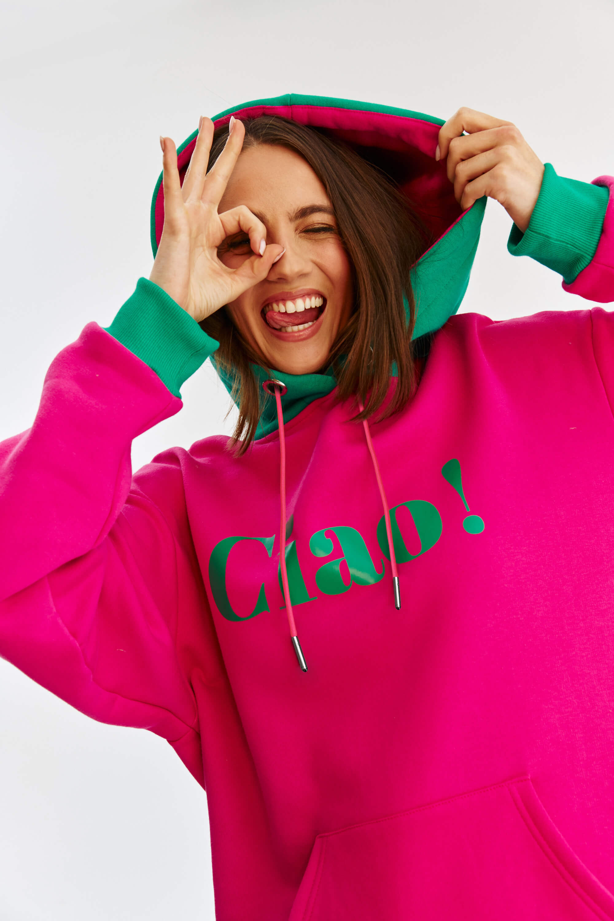 Bluza z kapturem Ciao Arrivederci z pewnością przyciągnie uwagę swoimi kolorami i humorem! Z napisami "ciao" z przodu i "arrivederci" z tyłu, emanuje lekkością i radością życia. Dzięki ściągaczom, kapturowi i kieszeniom jest zarówno wygodna, jak i funkcjonalna na co dzień.