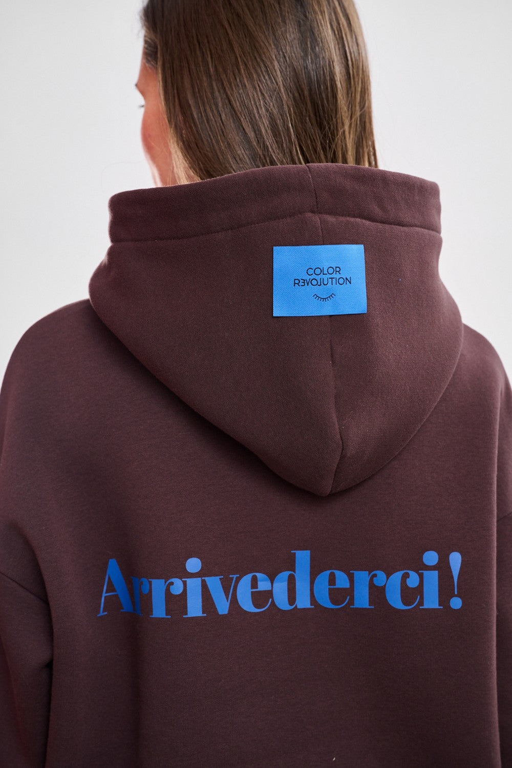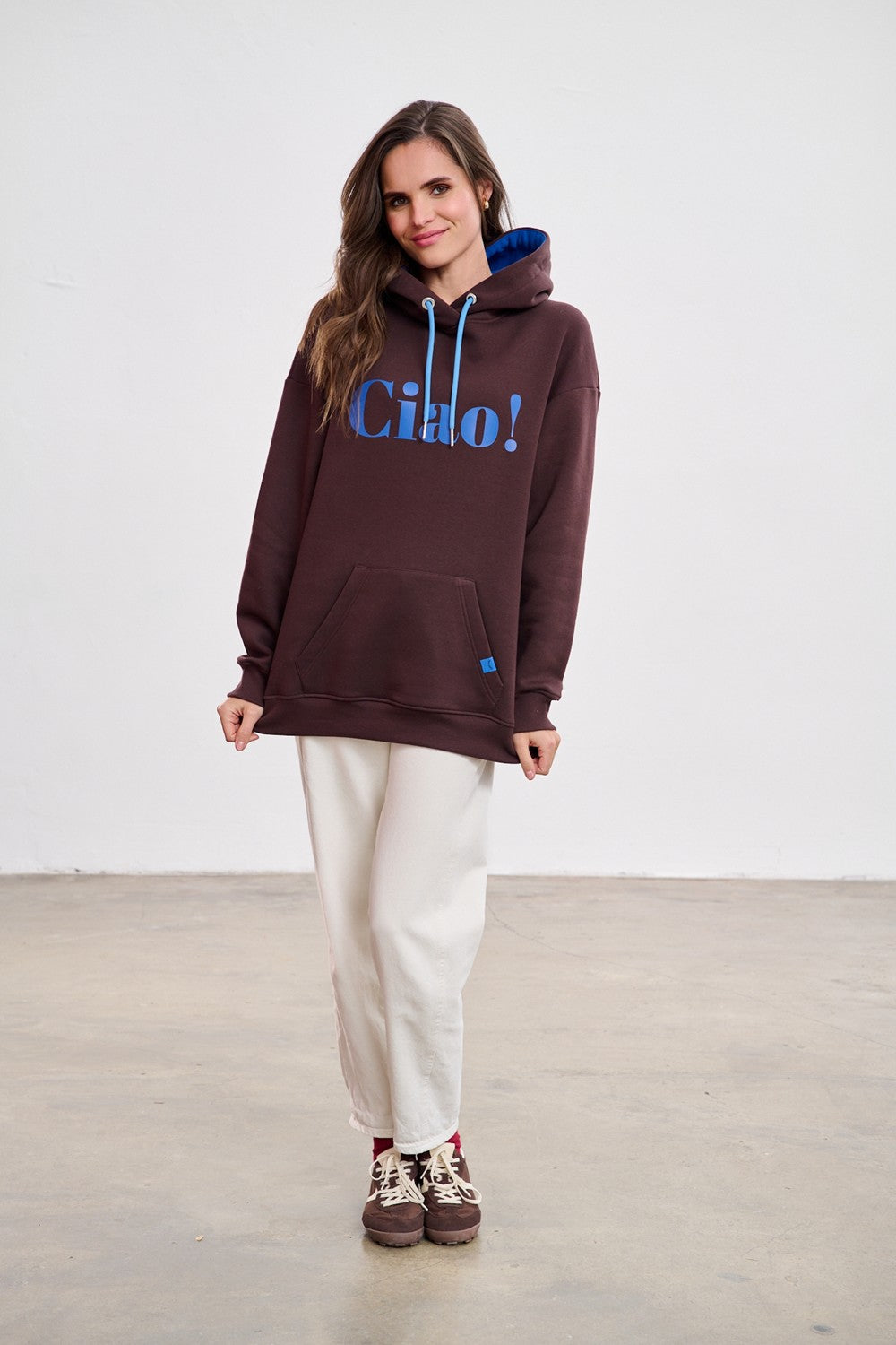 Bluza z kapturem Ciao Bella to mistrzowskie połączenie głębokiego brązu z energetycznym błękitem, który zdobi wnętrze kaptura i sznurki. Przód wita świat hasłem "Ciao!", a tył żegna go wymownym "Arrivederci!". Luźny fason tuniki sprawia, że bluza jest niezwykle wygodna i stylowa.