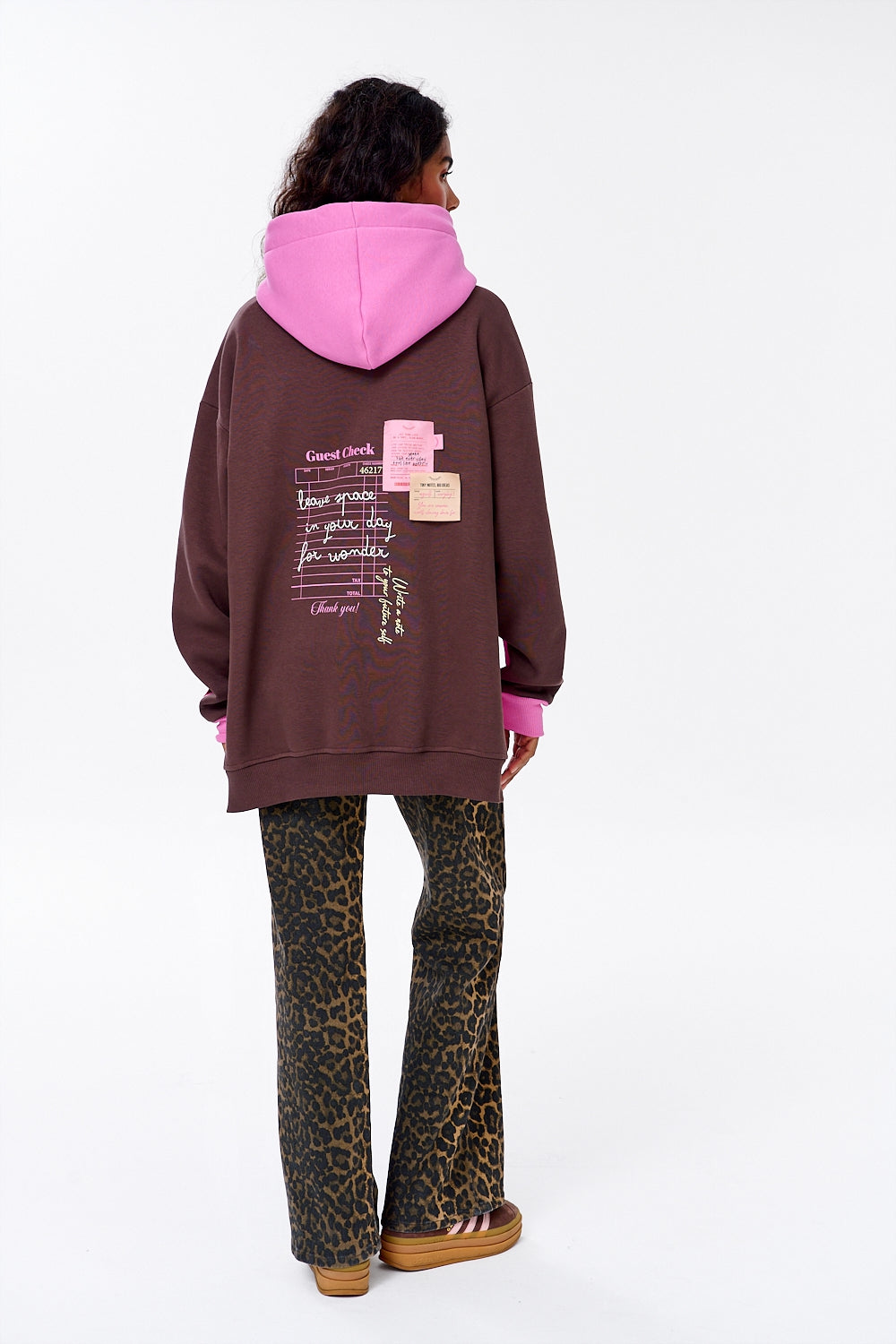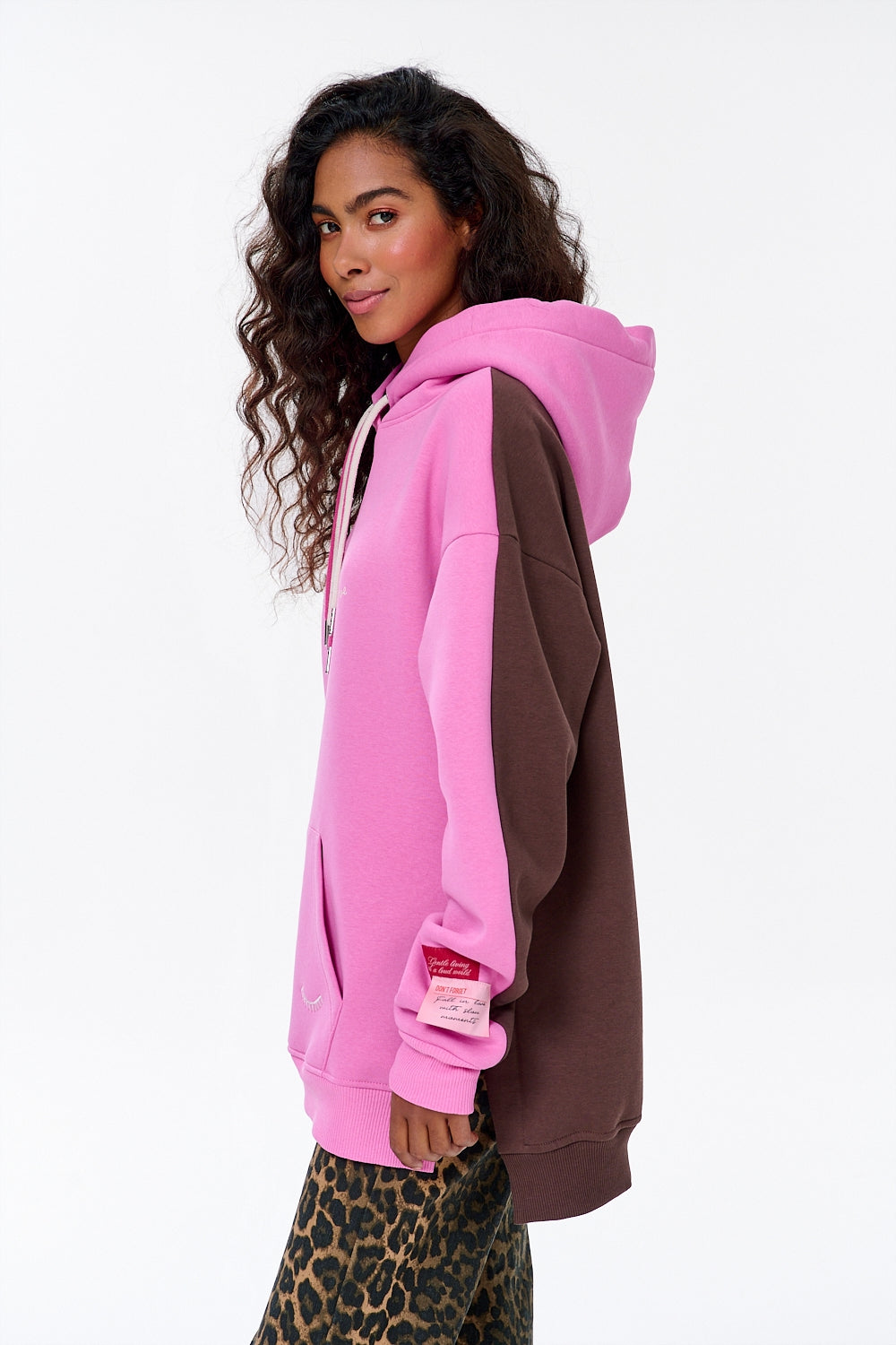 Bluza z kapturem Fall in Love to esencja romantycznych detali i wygody, zamknięta w oversize'owej formie. Jej dwukolorowy design – róż i czekoladowy brąz – sprawia, że wyróżnia się w tłumie, a jednocześnie pozostaje niezwykle przytulna i stylowa. Na przodzie pojawia się subtelny haft z przesłaniem, które przypomina o sile miłości i czułości na co dzień.