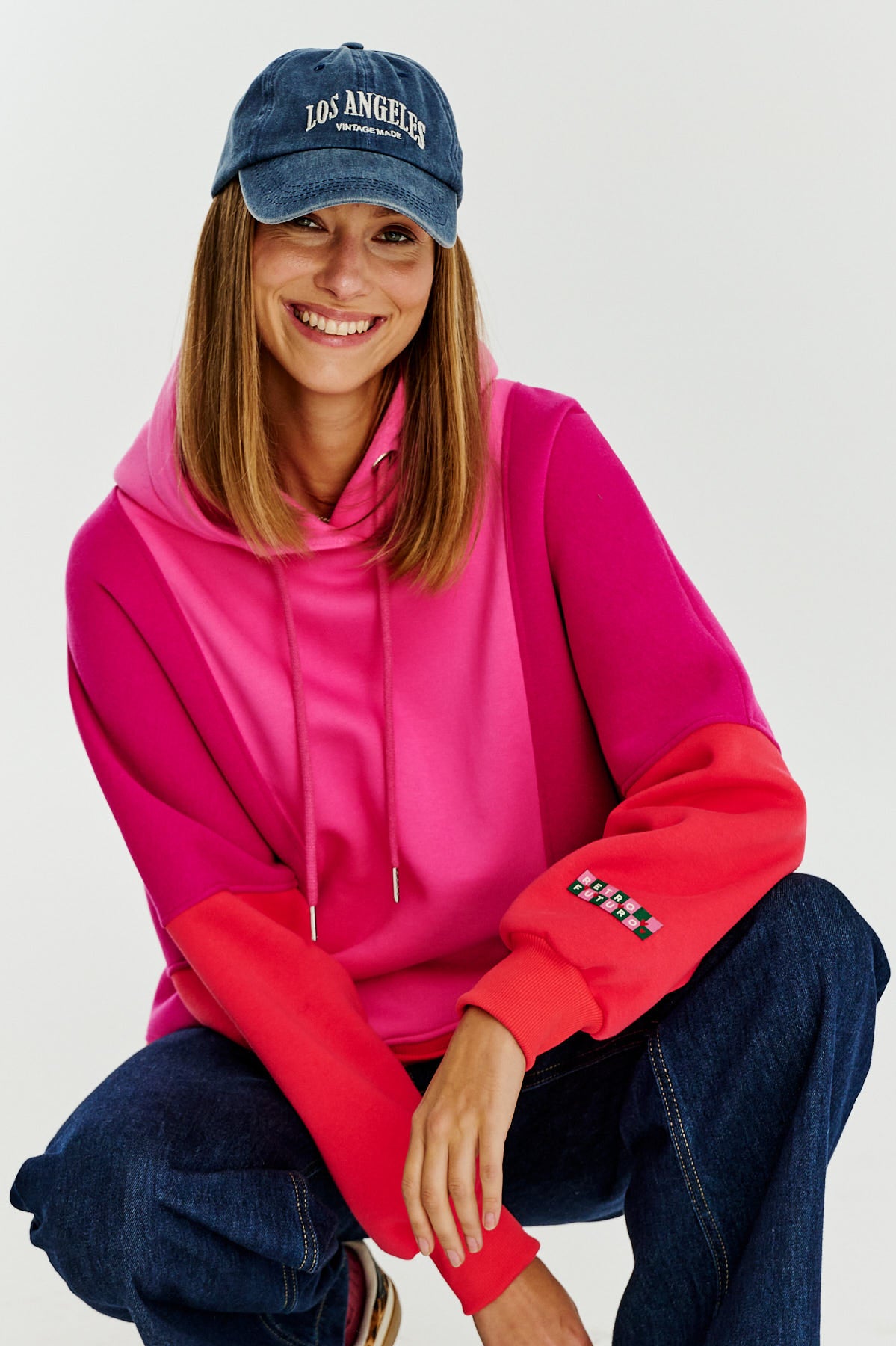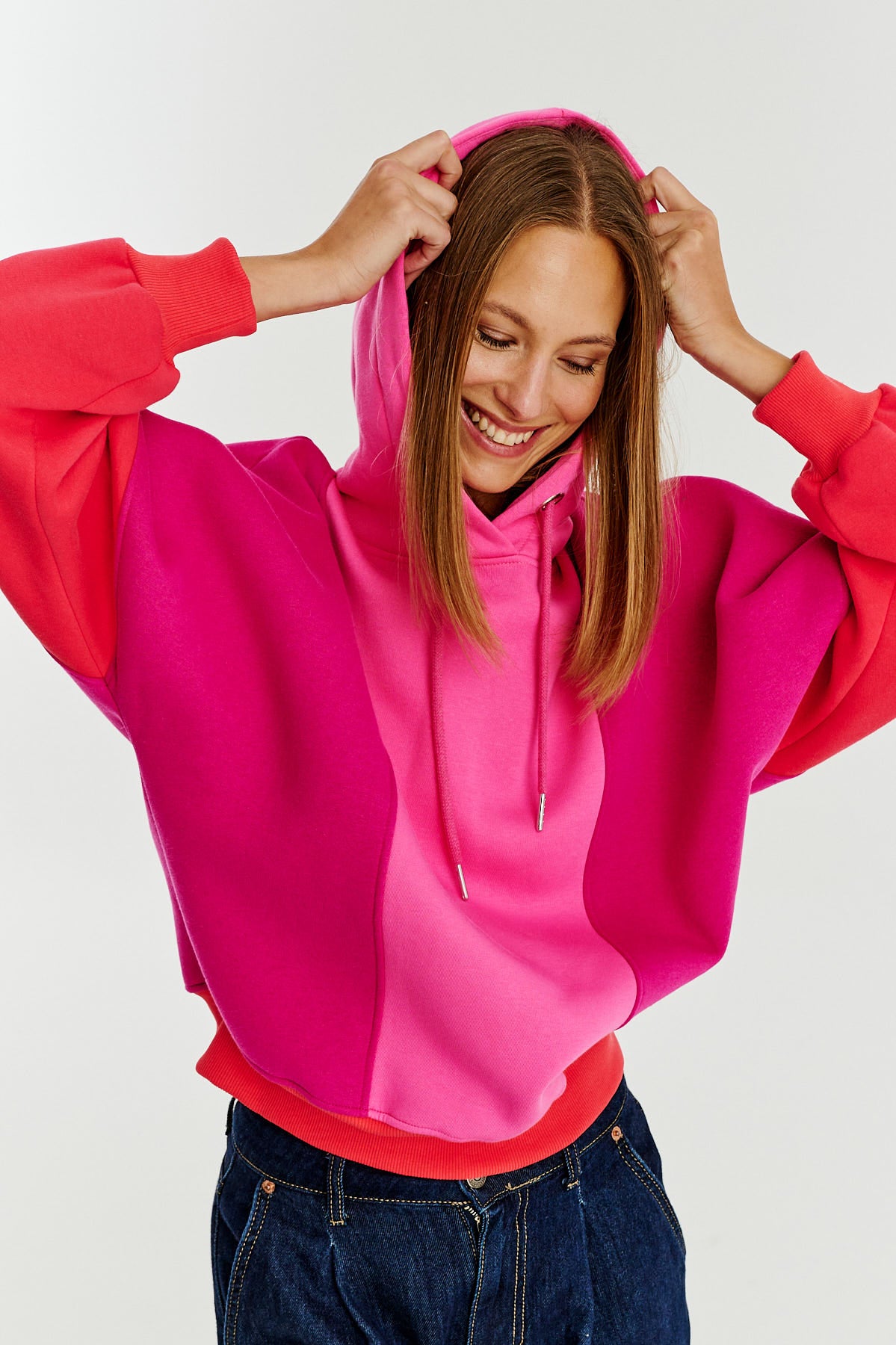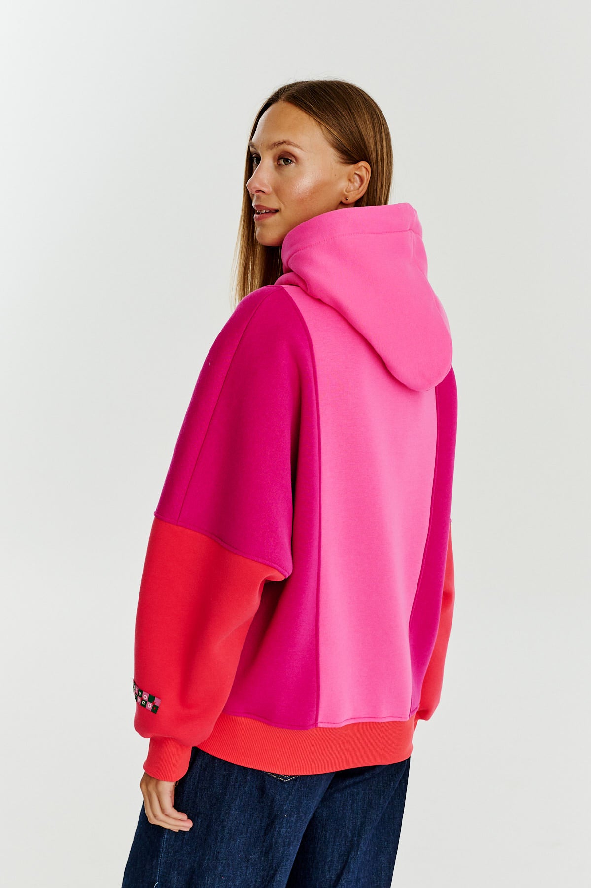 Bluza z kapturem Flameberry to wyrazisty i nowoczesny element garderoby, idealny dla miłośniczek odważnych kolorów. Jej trójkolorowy design łączy intensywne odcienie różu, fioletu i koralu, które nadają całości energii i charakteru.