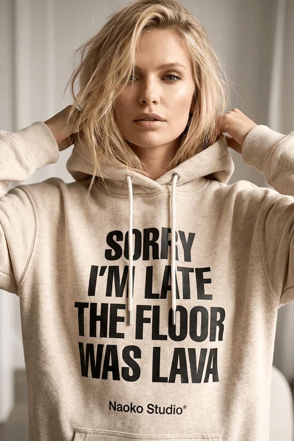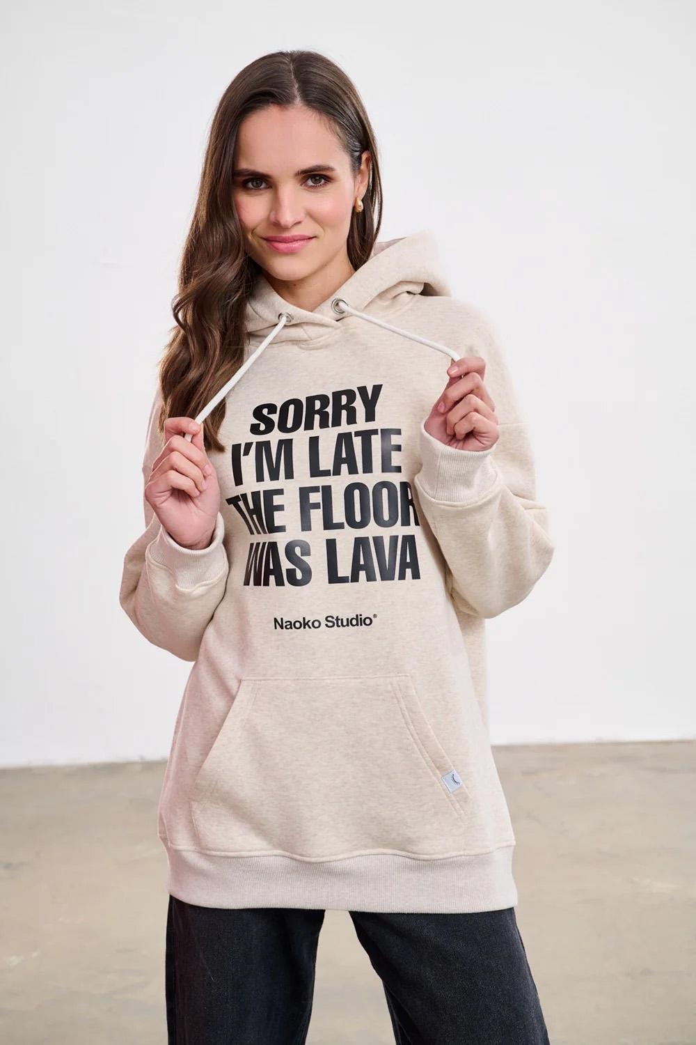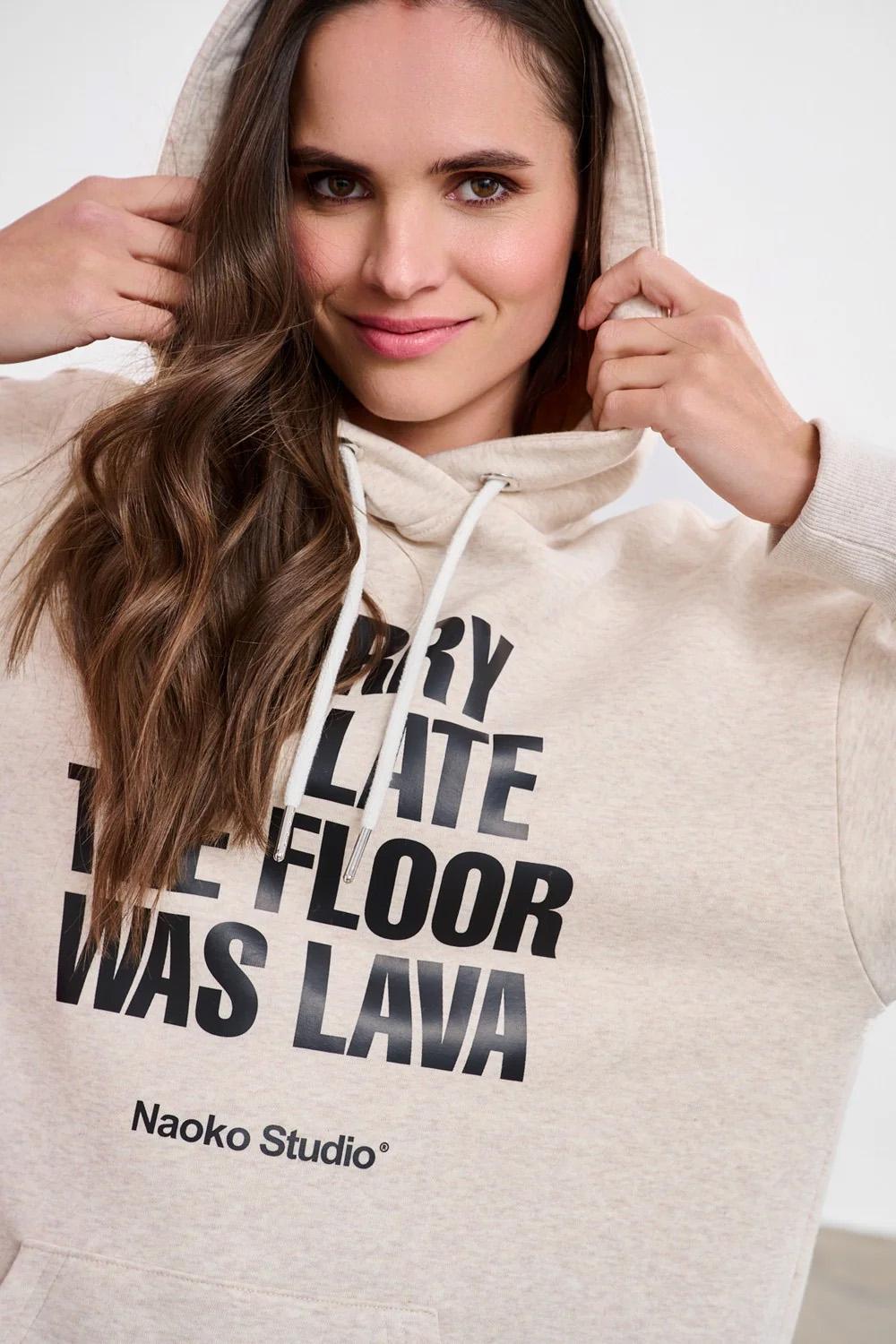 Bluza z kapturem Floor is Lava to propozycja z przymrużeniem oka. Klasyczny, beżowy odcień melanżu sprawia, że pasuje do wszystkiego, a czarny napis na froncie wywoła uśmiech na twarzy każdego, kogo spotkasz. Długi krój oversize zapewnia swobodę ruchów i maksymalny komfort noszenia.