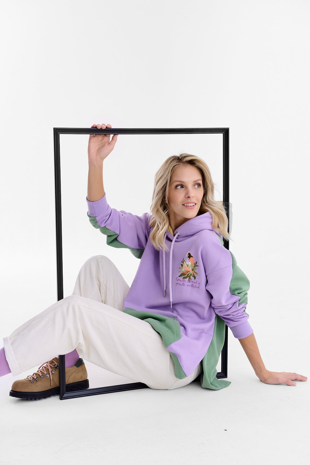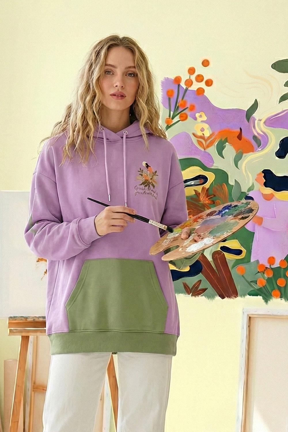 Bluza z kapturem Garden Path to wizualna opowieść o sile kobiecości i wzajemnym wsparciu, zaprojektowana przez Maggie Stephenson. W ramach projektu Naoko x Artist Remix, amerykańska artystka przeniosła na ubranie swój charakterystyczny styl pełen ciepła i płynnych linii. Oversize'owy krój łączy kojący fiolet z naturalną zielenią, tworząc harmonijną całość.