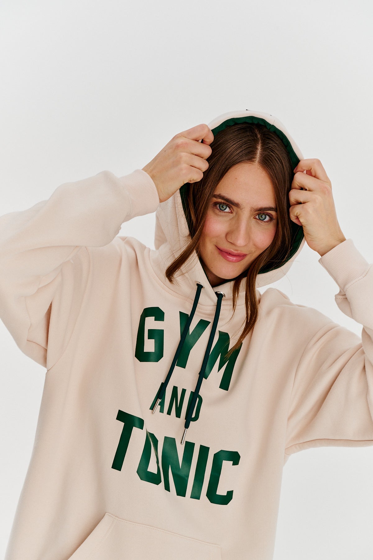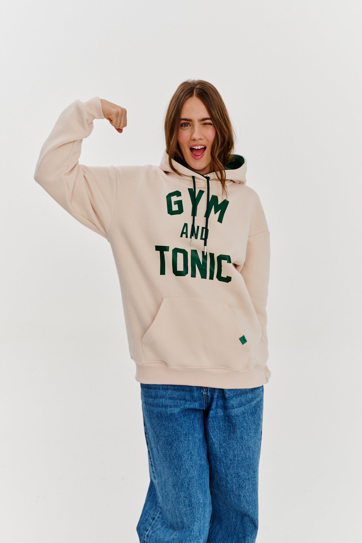 Bluza z kapturem Gym & Tonic łączy sportowy luz z ironicznym twistem. Beżowa baza w połączeniu z butelkowozielonym nadrukiem i kontrastową podszewką kaptura tworzy minimalistyczny, ale charakterystyczny design. Luźny, oversize’owy krój zapewnia maksymalny komfort, a dopracowane detale, jak subtelne akcenty na kieszeni i stylowe sznurki, dodają jej niepowtarzalnego charakteru.