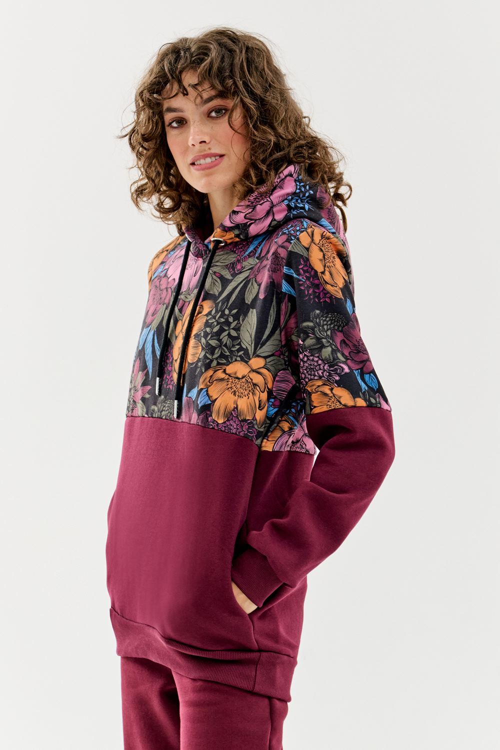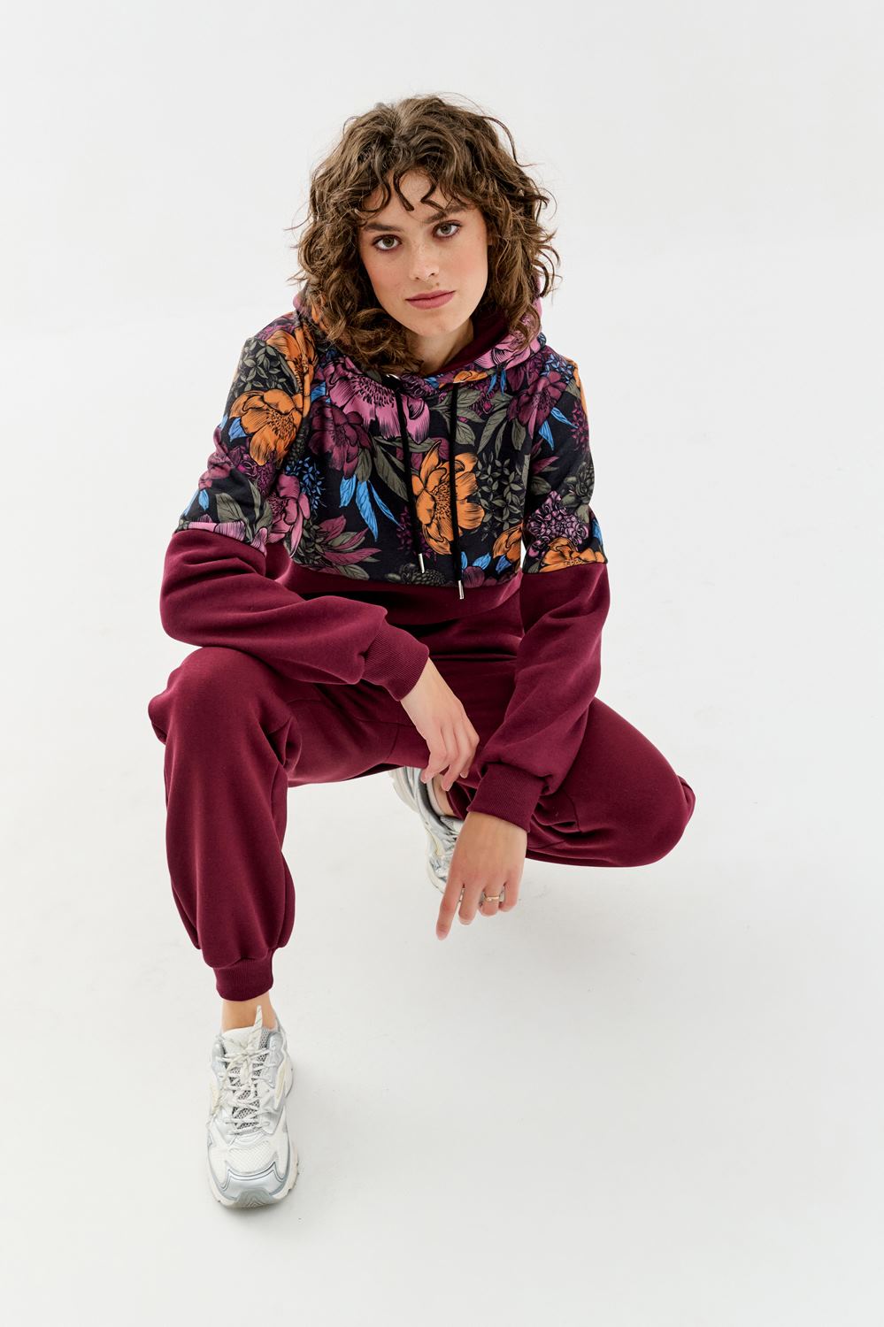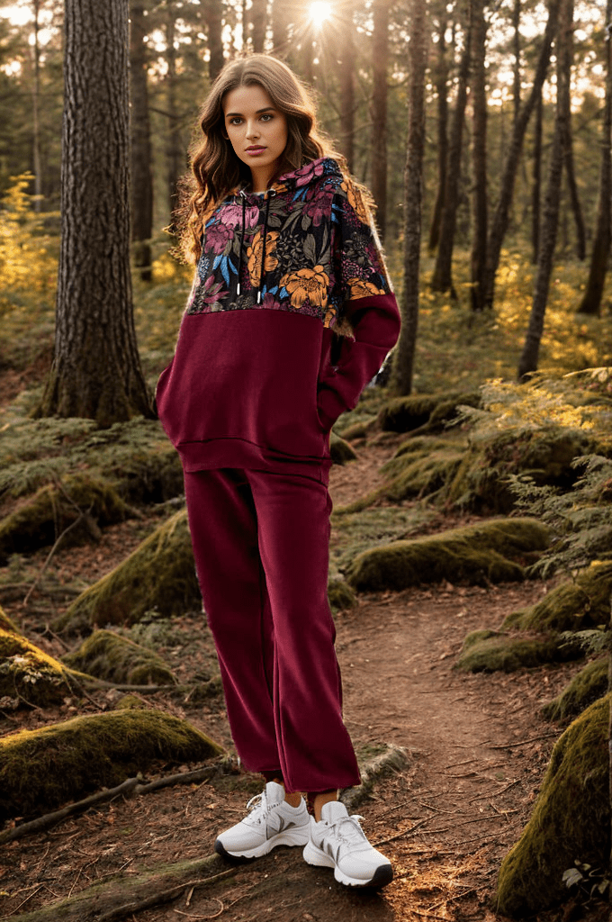 Jej górna część jest ozdobiona delikatnym kwiatowym wzorem, który przywodzi na myśl wiosenne ogrody w pełnym rozkwicie. To jak noszenie dzieła sztuki na sobie, co nadaje bluzie niezwykłego uroku i subtelności. Dolna część bluzy, utrzymana w głębokim odcieniu bordowego, stanowi harmonijny kontrast, dodając całości elegancji i klasy.