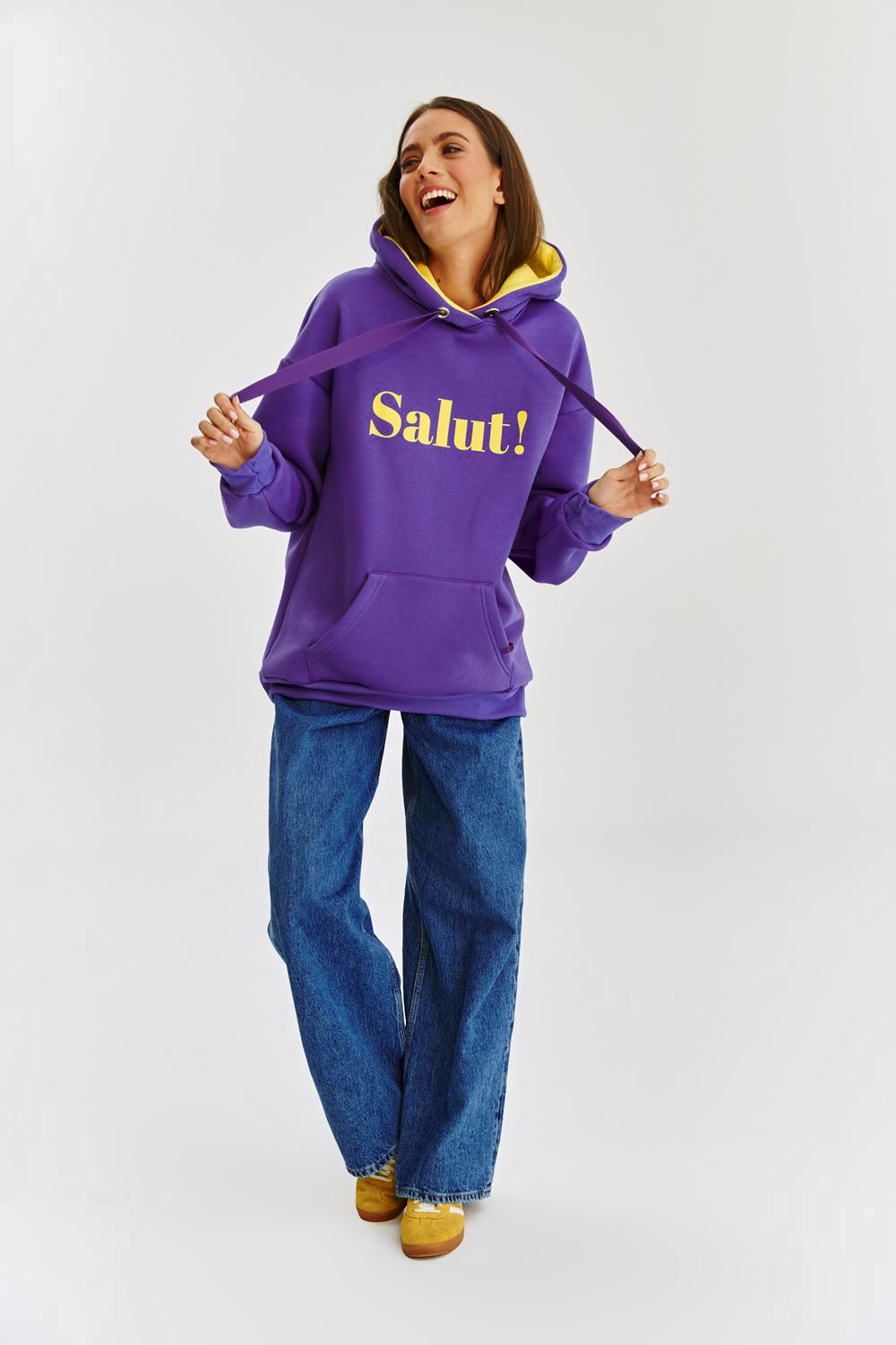 Bluza z kapturem Salut Au Revoir z pewnością przyciągnie uwagę swoimi kolorami i humorem! Z napisami "salut" z przodu i "aurevoir" z tyłu, emanuje lekkością i radością życia. Dzięki ściągaczom, kapturowi i kieszeniom jest zarówno wygodna, jak i funkcjonalna na co dzień. Wydłużony krój bluzy zapewni Ci komfort niezależnie od okazji.