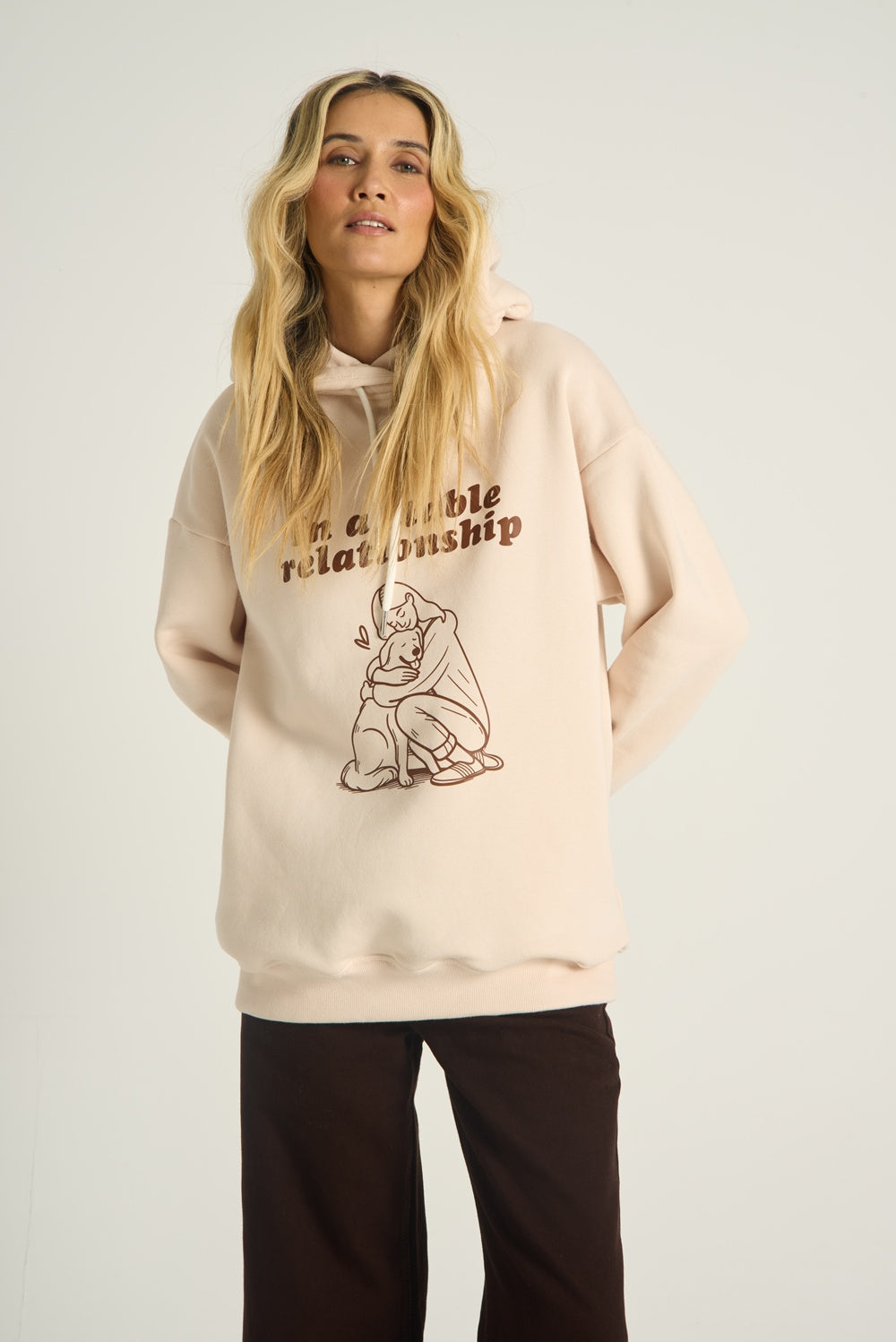 Bluza z kapturem Stable Relationship to coś więcej niż ubranie – to deklaracja miłości do Twojego pupila. Na jasnym, kremowym tle widnieje urocza grafika dziewczyny przytulającej psa oraz napis, który mówi wszystko: "In a stable relationship". Długi krój i obszerny kaptur zapewniają maksymalny komfort.