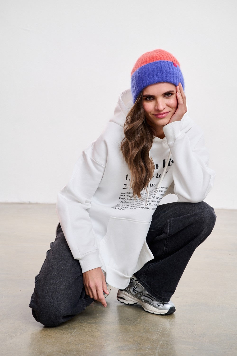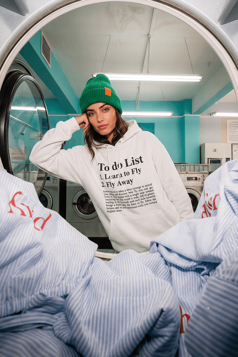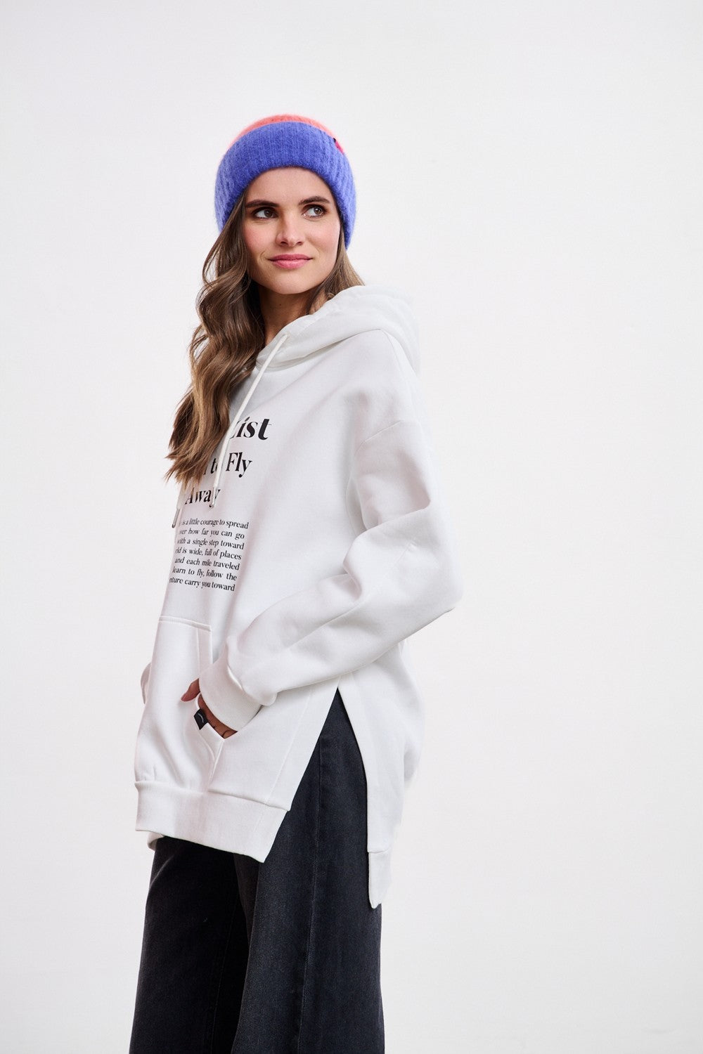 Bluza z kapturem To Do List to propozycja dla tych, którzy lubią jasny przekaz. Kremowy odcień stanowi tło dla kontrastowego, czarnego nadruku z listą zadań, w której najważniejsze jest "Learn to Fly". Długi, otulający krój i pojemna kieszeń sprawiają, że to idealny wybór na dni pełne wyzwań.