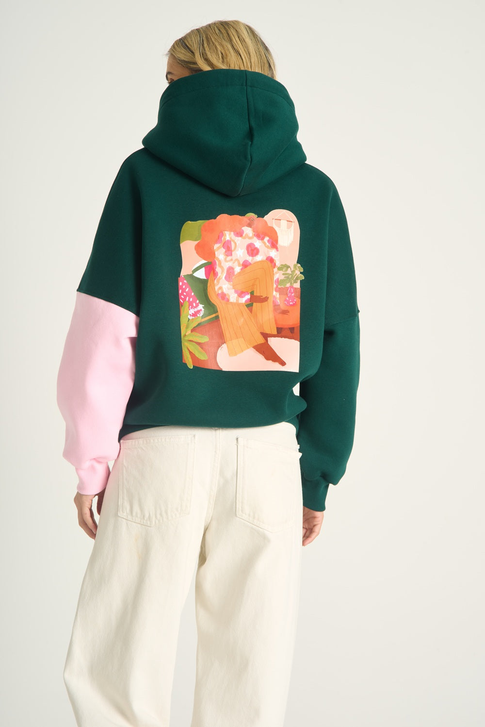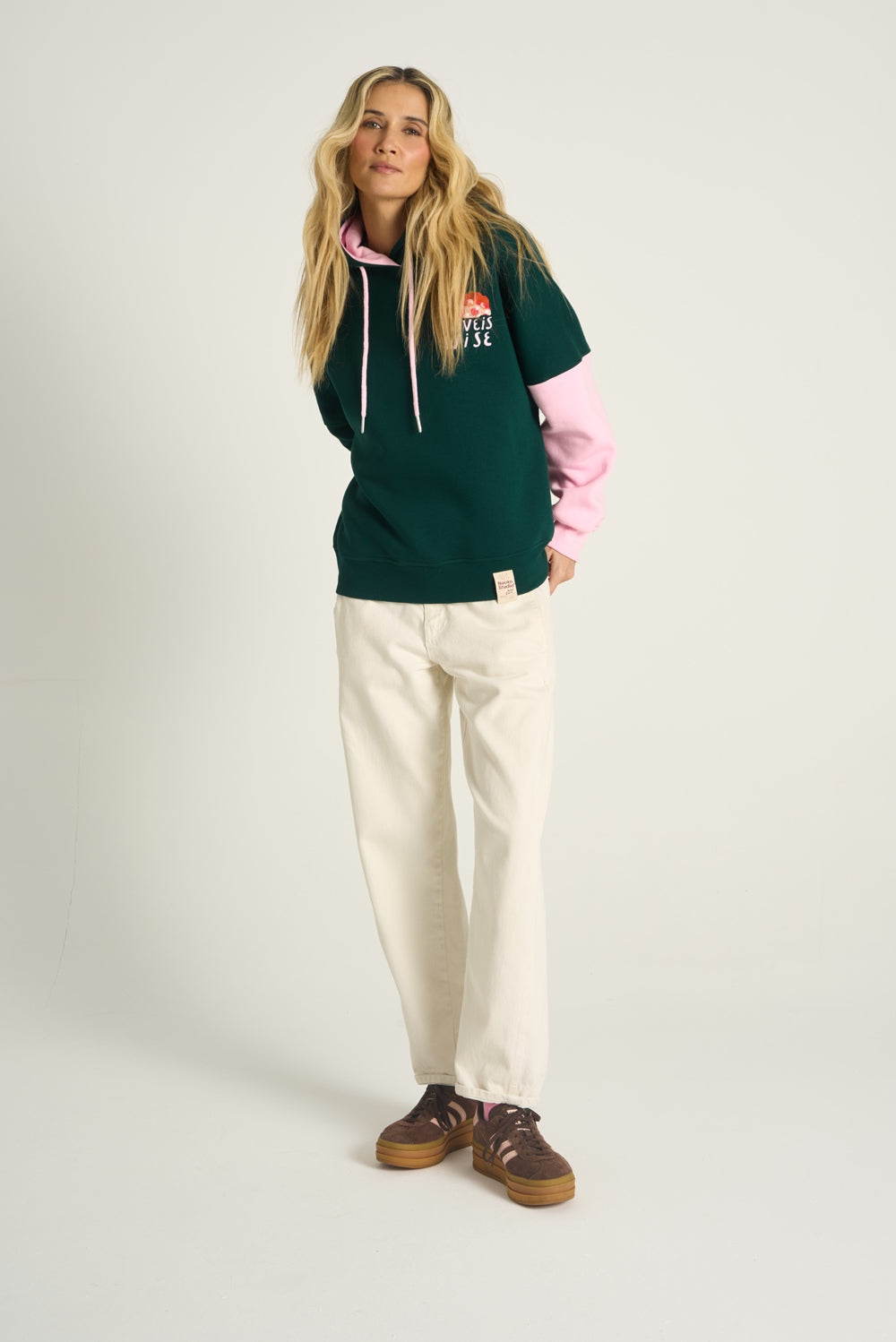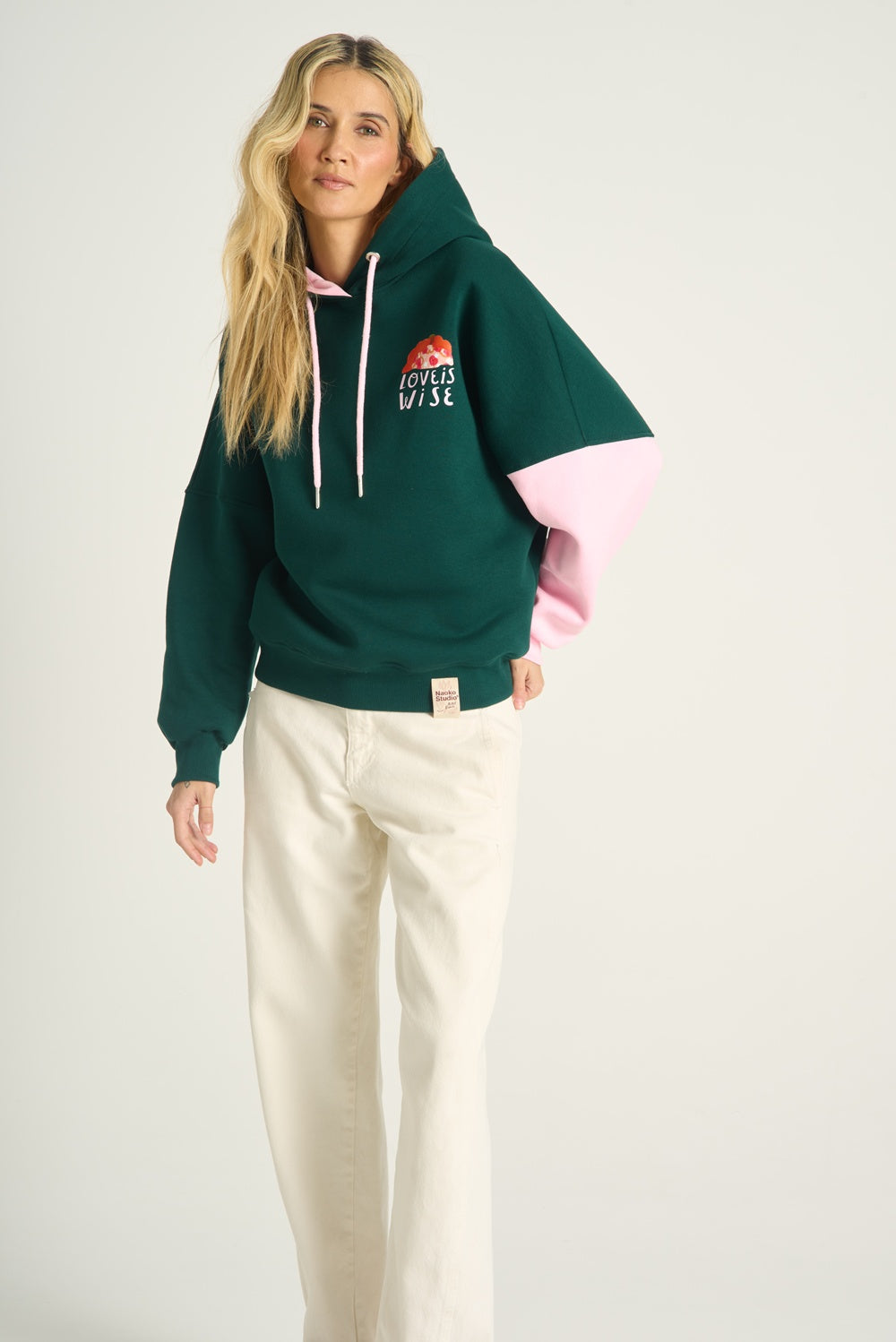 Bluza z kapturem Wise Love to ubranie, które przytula. Stworzona we współpracy z Loveis Wise w ramach projektu Naoko x Artist Remix, łączy głęboką, butelkową zieleń z delikatnym, pudrowym różem na jednym z rękawów. To asymetryczne połączenie symbolizuje harmonię między siłą a wrażliwością, tak charakterystyczną dla twórczości artystki.