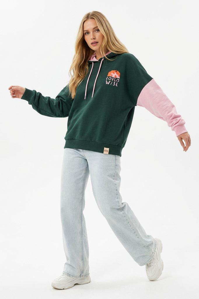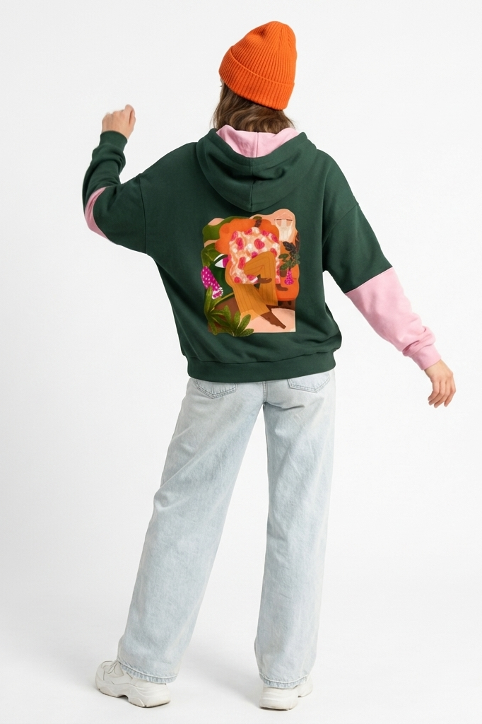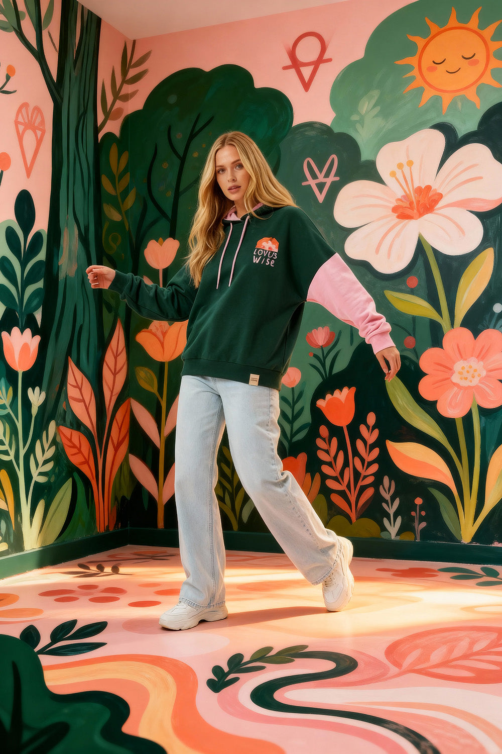 Bluza z kapturem Wise Love to ubranie, które przytula. Stworzona we współpracy z Loveis Wise w ramach projektu Naoko x Artist Remix, łączy głęboką, butelkową zieleń z delikatnym, pudrowym różem na jednym z rękawów. To asymetryczne połączenie symbolizuje harmonię między siłą a wrażliwością, tak charakterystyczną dla twórczości artystki.