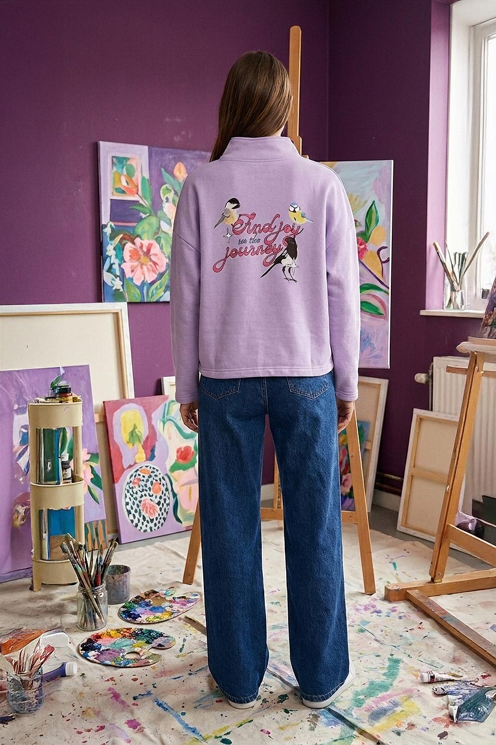 Bluza Songbird to zaproszenie do świata Cecilii Petterson – pełnego organicznych form i skandynawskiej harmonii. W ramach projektu Naoko x Artist Remix, szwedzka ilustratorka stworzyła projekt, który jest ucieleśnieniem spokoju. Pastelowy, fioletowy kolor bluzy z modnym zapięciem na suwak pod szyją (half-zip) otula miękkością.