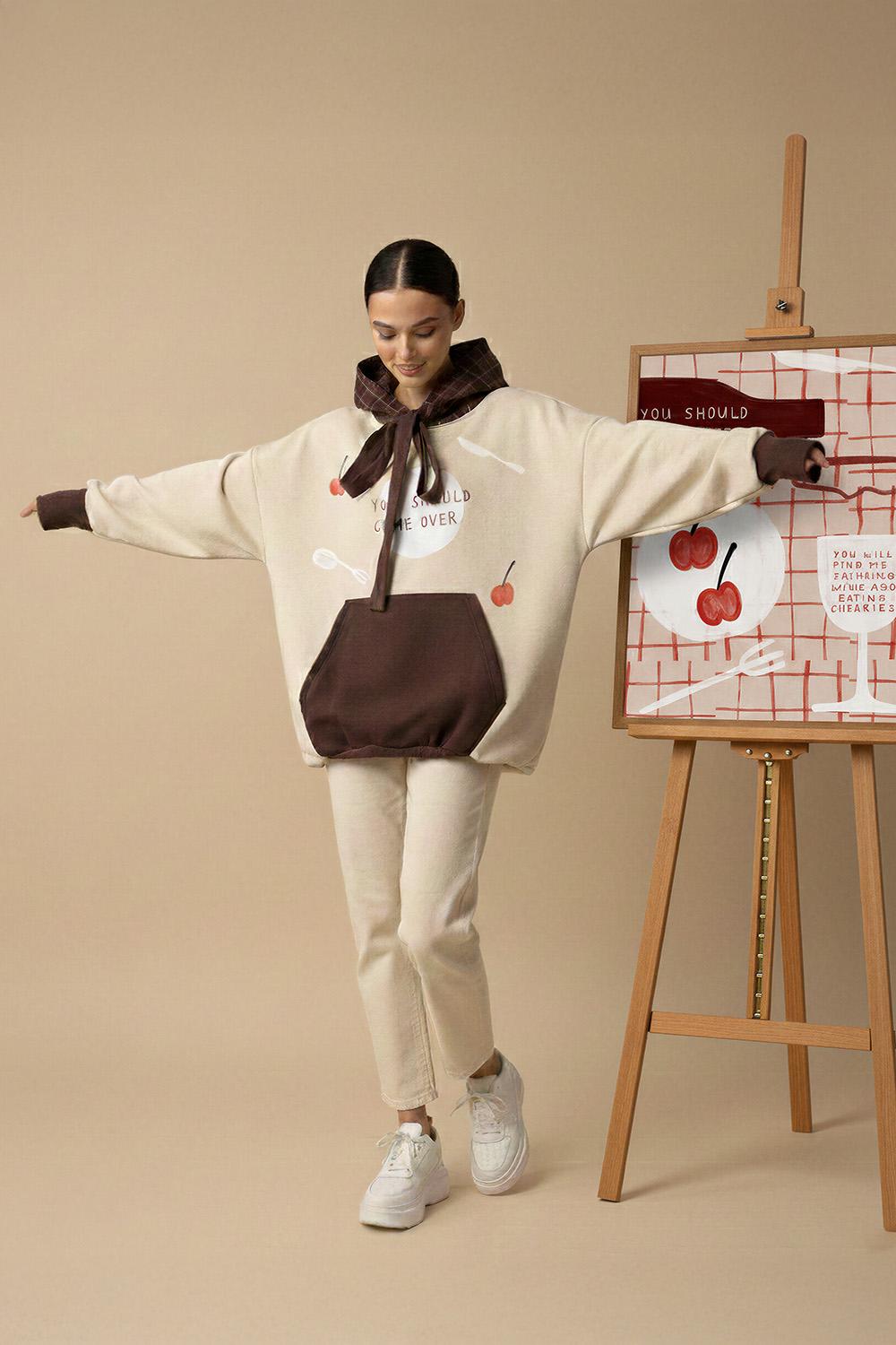 Bluza z wiązaniem Come Over to kwintesencja stylu Kit Agar – ciepłego, minimalistycznego i pełnego emocji. Brytyjska artystka w ramach projektu Naoko x Artist Remix stworzyła projekt, który jest jak zaproszenie do bliskości. Oversize'owy krój łączy kremowy beż z głębokim brązem kieszeni, mankietów i kaptura.