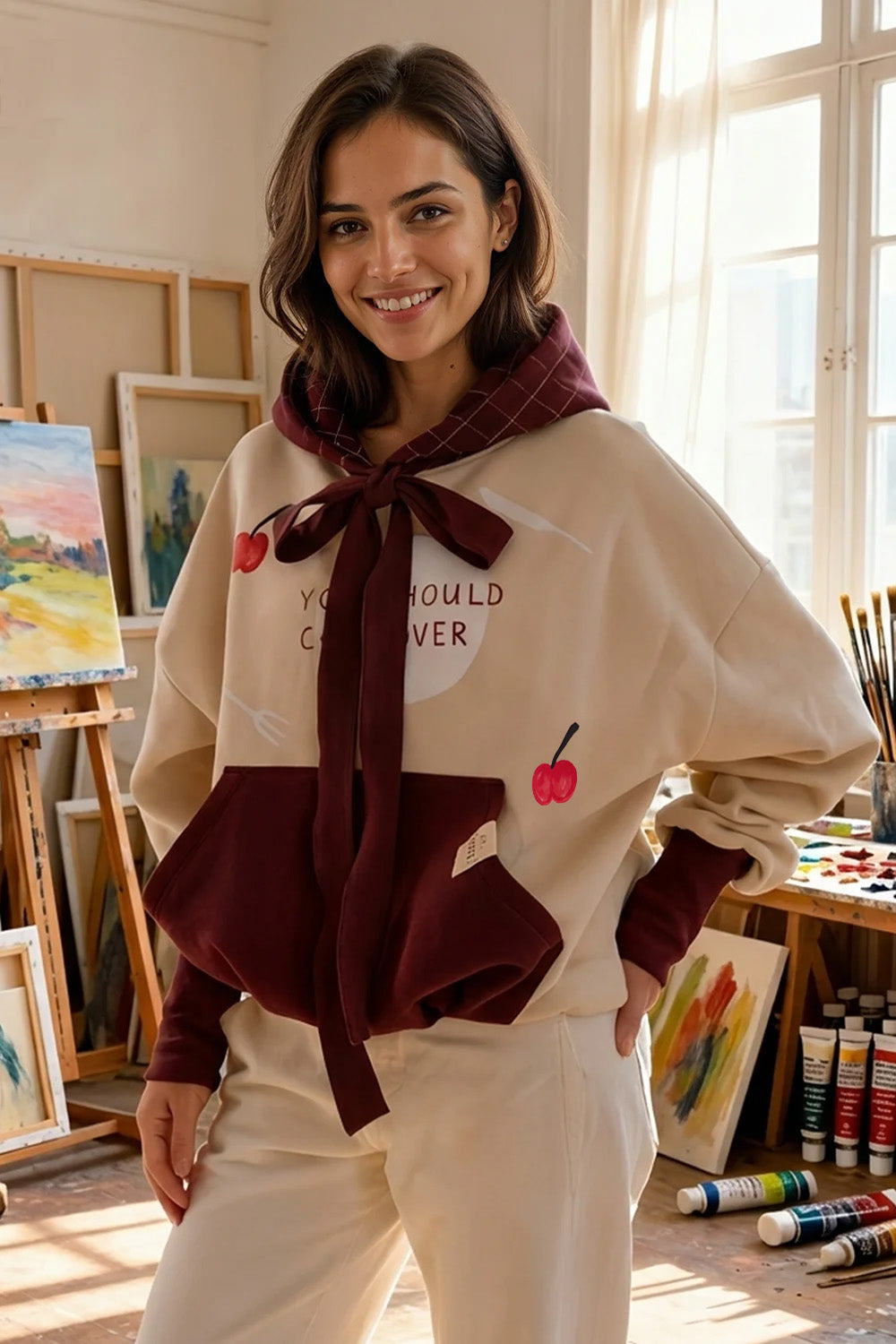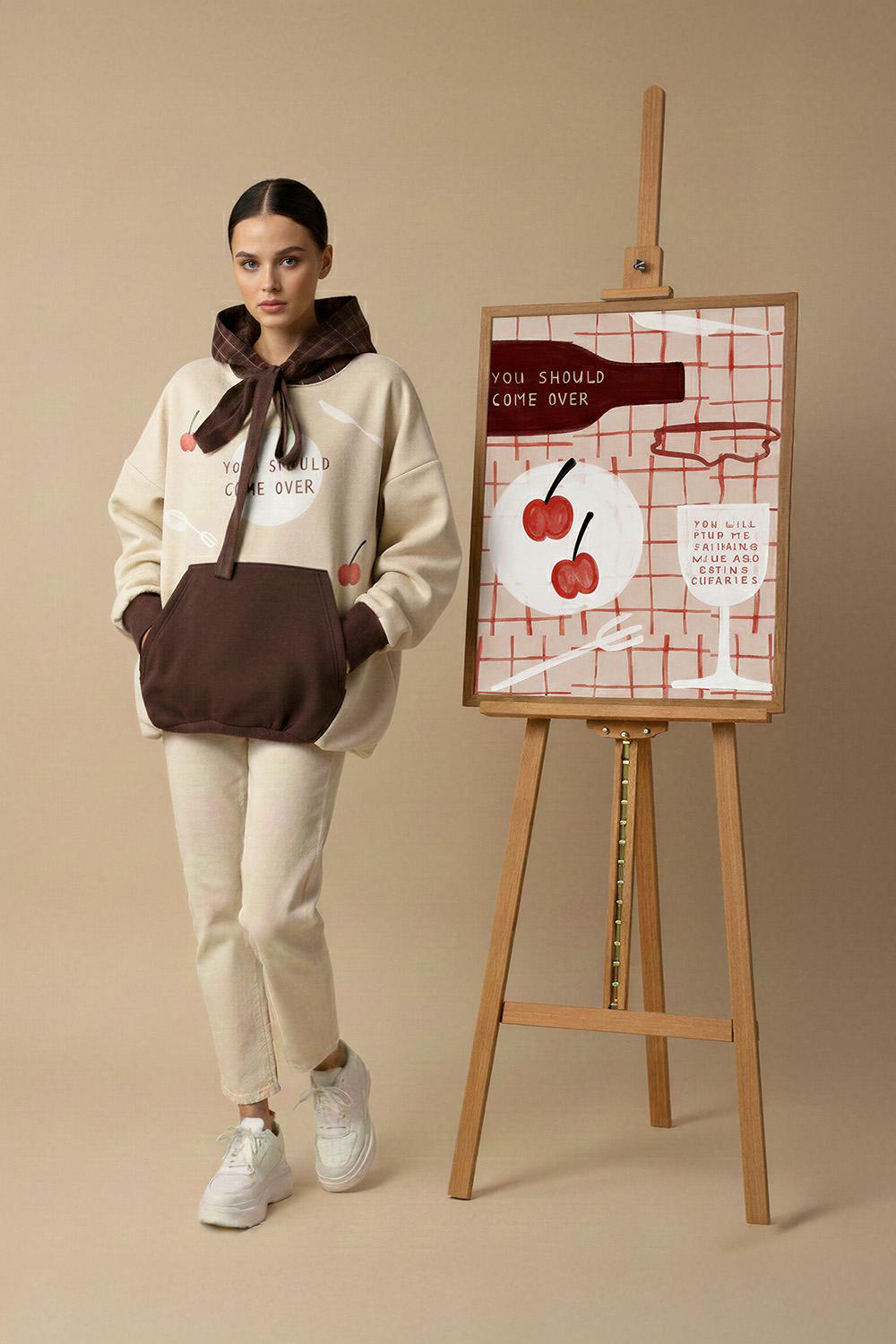 Uwagę przykuwa nie tylko urocza grafika z wiśniami i napisem "You should come over", ale też charakterystyczne, szerokie wiązanie przy kapturze. To artystyczna odpowiedź na pytanie o to, co chcemy pielęgnować: relacje, gościnność i ciepło domowego ogniska. Kupując tę bluzę, wspierasz Fundację Kosmos dla Dziewczynek.